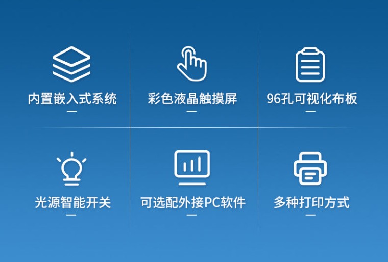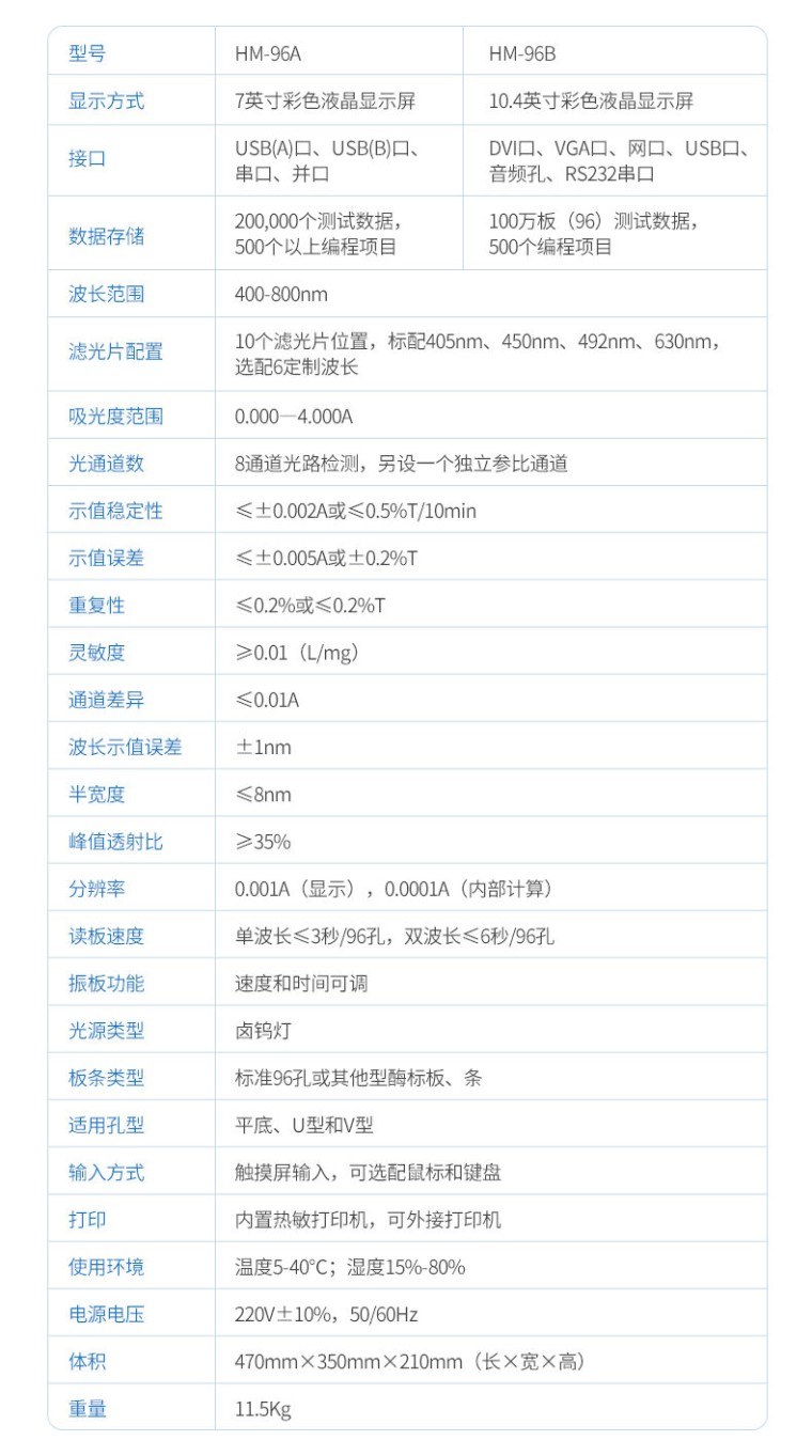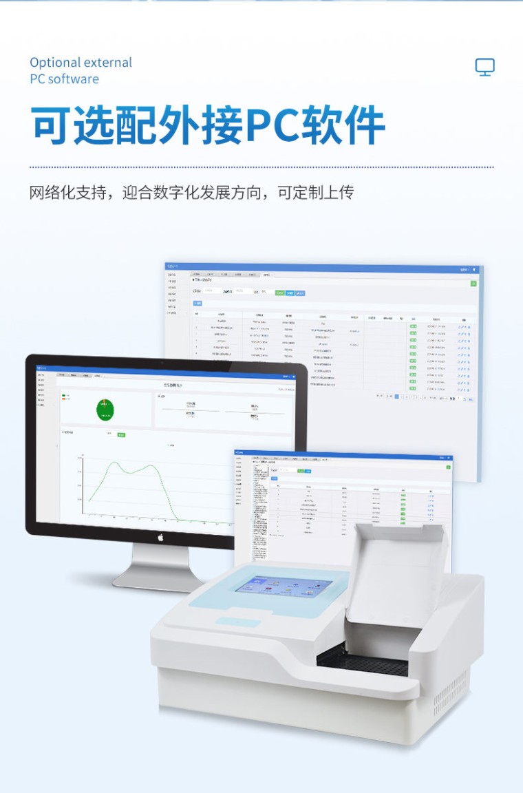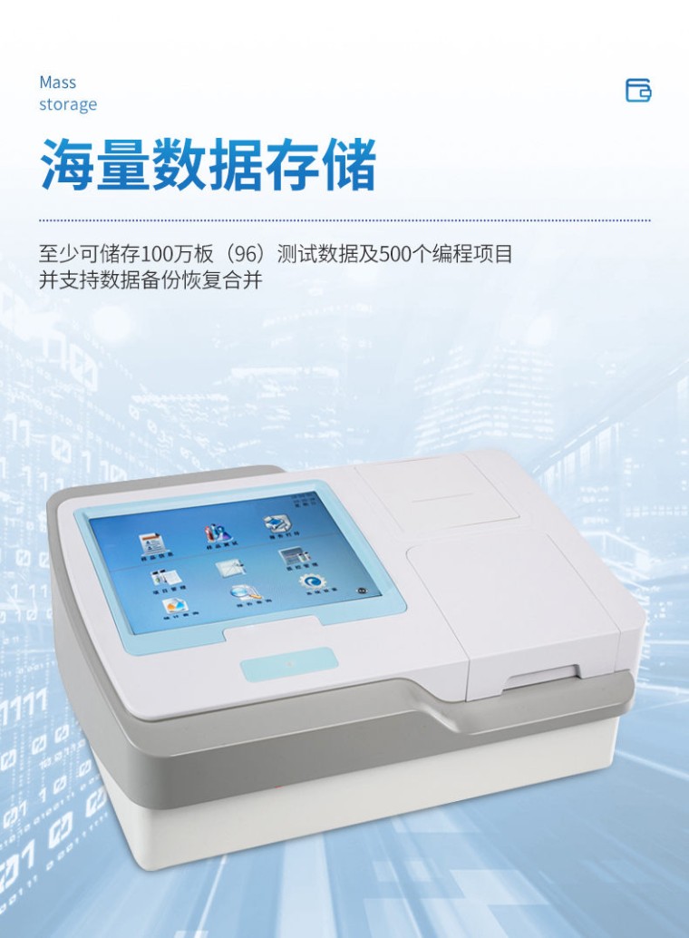 产品特点 1、 内置嵌入式系统,无需外接电脑即可操作、存储、打印; 2、 全屏显示96孔整板数据, 直观的可视化布板操作界面 3、 便捷的触摸屏输入,另可选配外接鼠标和键盘 4、 测量模式:单波长检测,双波长检测,两点法,动力学法,酶抑制率,终点法、速率法。 5、 可选择吸光度、Cut-Off定性计算、单点定标、折线回归、线性回归、指数回归、对数回归、双对数回归、log-logit、幂回归、四参数回归、酶抑制率等计算方法; 6、 在同一板上可进行多至12个不同项目的测试,并可同一板检测定性和定量项目。 7. *全面完善的质控功能,包含westguard多规则质控,即刻法质控等多种质控图及质控参数计算,具有质控报警功能。 8、 具有灵活的定性公式输入功能,满足各种相同及不同试剂的不同的参数设置。 9、 布板和保存导入功能,大幅提高常用项目的测试效率 10、 可选配外接PC软件,网络化支持,迎合数字化发展方向,可定制上传。 11、 全新风格彩色图形化界面,全中文操作系统,支持鼠标、键盘,支持输入法。 12、 光源智能开关,延长其寿命。 13、 提供多种打印方式及多种形式中文报告,并可定制各式报告。 14、 专用系统维护菜单,自动判断仪器当前状态及性能指标,并可打印相关数据 技术参数: *波长范围: 400-800nm *滤光片配置:10个滤光片位置,标配405nm、450nm、492nm、630nm,选配6定制波长 吸光度范围:0.000―4.000A *光通道数:8通道光路检测,另设一个独立参比通道(选配) *示值稳定性:≤±0.002A或≤0.5%T/10min。 *示值误差(准确性):≤±0.005A或±0.2%T。 *重复性:≤0.2%或≤0.2%T。 灵敏度:≥0.01(L/mg)。 通道差异:≤0.01A。 波长示值误差:±1nm 半宽度:≤8nm 峰值透射比:≥35% 分辨率:0.001A(显示),0.0001A(内部计算) *读板速度:单波长≤3秒/96孔,双波长≤6秒/96孔 振板功能:速度和时间可调 光源类型:卤钨灯 板条类型:标准96孔或其他型酶标板、条 适用孔型:平底、U型和V型 显示方式:7寸彩色液晶显示屏显示 输入方式:触摸屏输入,可选配鼠标和键盘 打印:内置热敏打印机,可外接打印机 接 口: USB(A)口、USB(B)口、串口、并口 *数据储存:200,000个测试数据,500个以上测试项目(可扩展) 使用环境:温度5-40℃;湿度15%-80% 电源电压:220V±10%,50/60Hz 体积:475mm×350mm×210mm(长×宽×高) 重量:11.5Kg