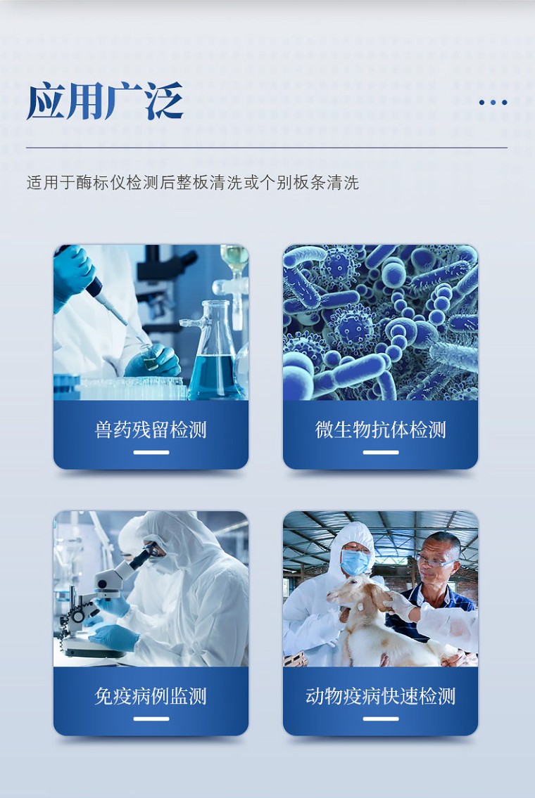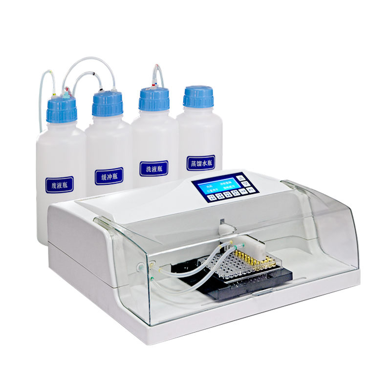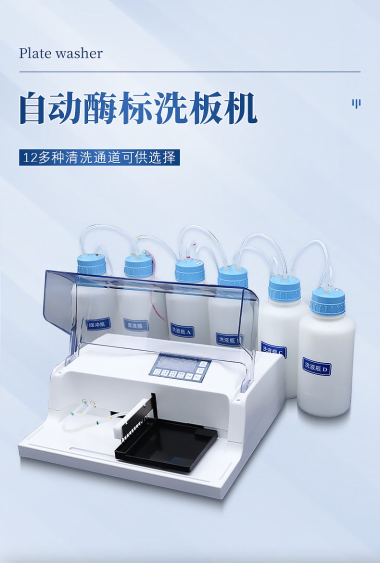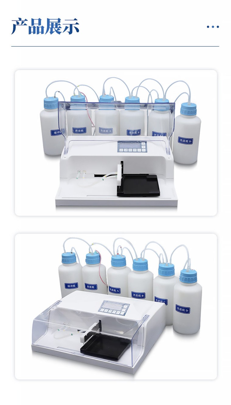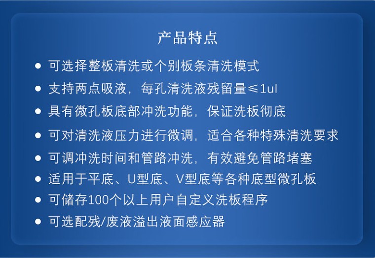 产品特点: 中文大屏幕液晶显示,菜单式操作 可选择整板清洗或个别板条清洗模式 8、12多种清洗通道可供选择 支持两点吸液,每孔清洗液残留量≤1ul 具有微孔板底部冲洗功能,保证洗板彻底 具有震荡和浸泡功能,降低反应过程中的干扰性吸附 可对清洗液压力进行微调,适合各种特殊清洗要求 可调冲洗时间和管路冲洗,有效避免管路堵塞 适用于平底、U型底、V型底等各种底型微孔板 可储存100个以上用户自定义洗板程序 可选配残/废液溢出液面感应器 技术参数: 清洗模式: 整板模式、个别板条模式 *清洗通道: 8或12通道 清洗次数: 1-99次可调 清洗条数: 1-12排可调 浸泡时间: 0-24小时可调 振板时间: 0-600秒可调 *洗液残留: 每孔少于1uL *加液容量: 50-3000uL,以10μL为间距可调 加液精度:≤2.0% 洗液时间: 0.1-9.9秒 *储存容量: 100个以上用户自定义洗板程序 *清洗方式: 具有两点吸液、底部冲洗、清洗液压力微调功