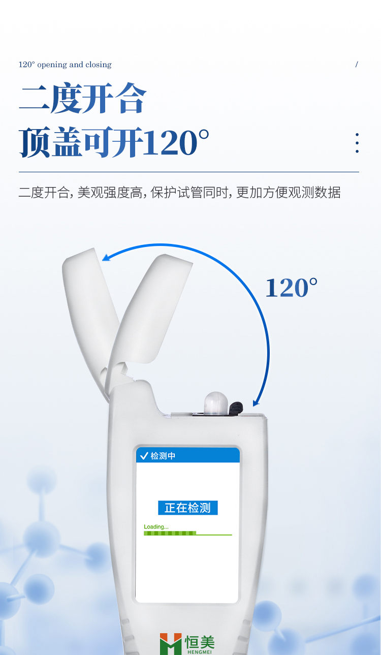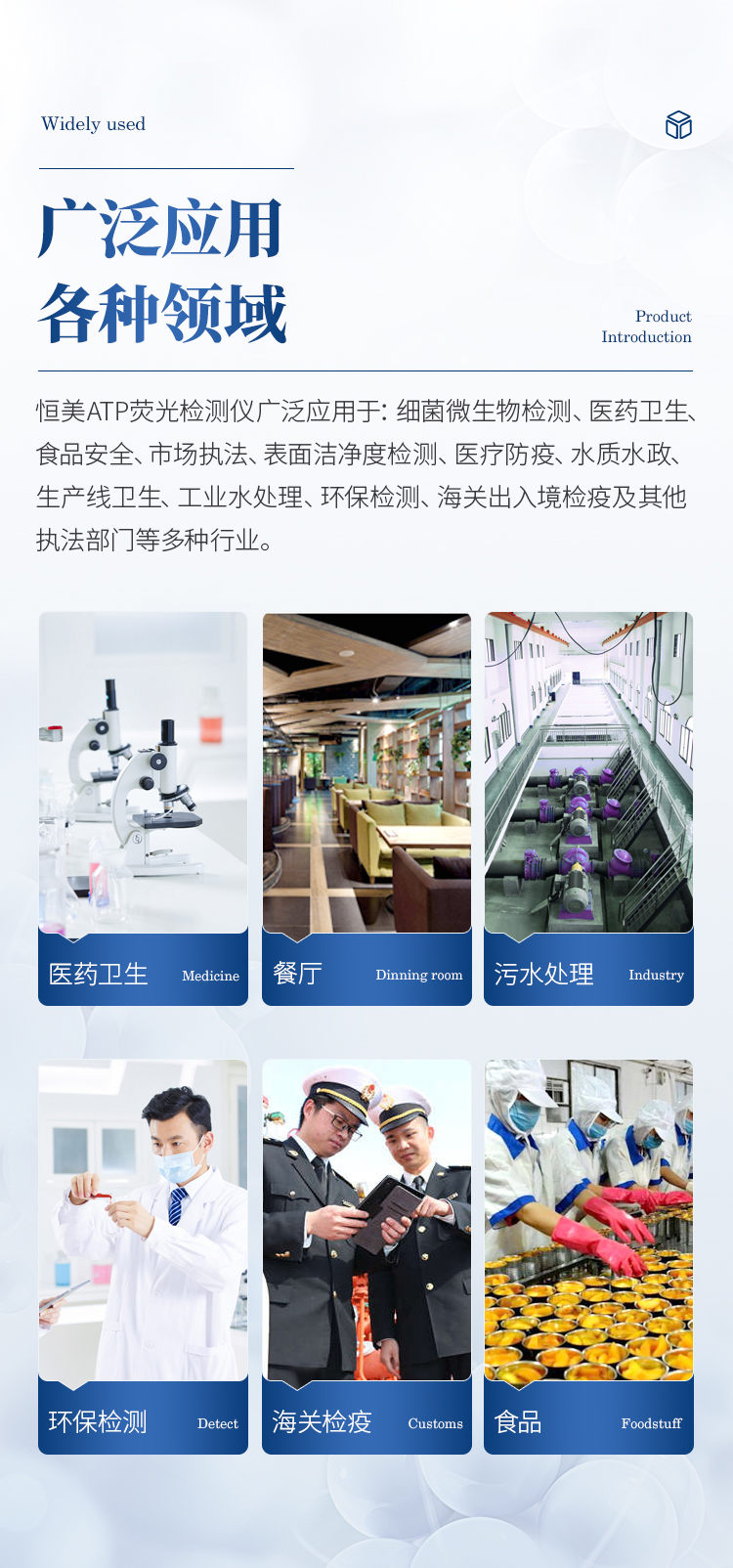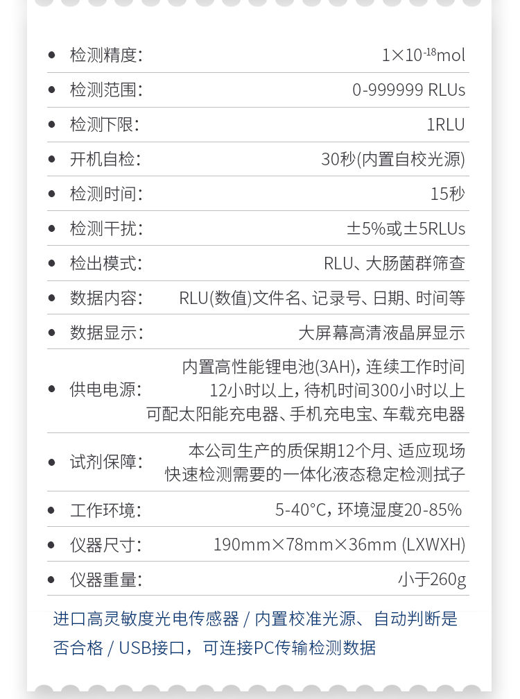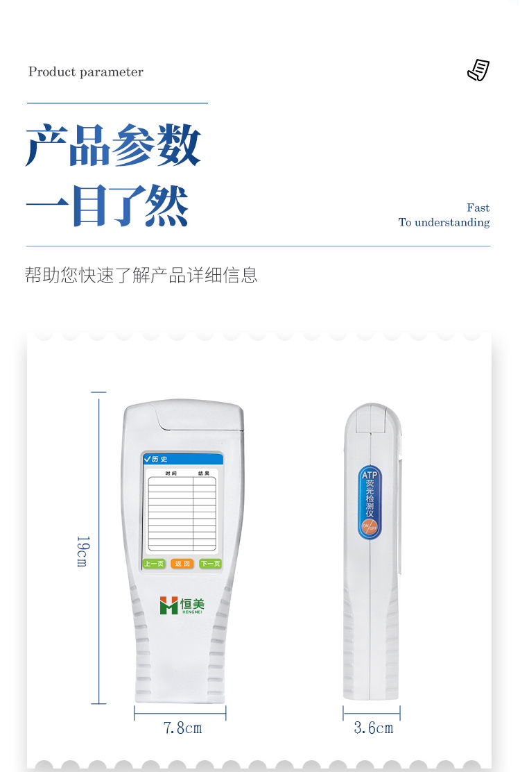 该设备为全新升级产品,安卓智能操作系统。操作采用生物化学反应方法检测ATP含量,洁净度检测仪基于萤火虫发光原理,利用“荧光素酶—荧光素体系”快速检测三磷酸腺苷(ATP)。ATP拭子含有可以裂解细胞膜的试剂,能将细胞内ATP释放出来,与试剂中含有的特异性酶发生反应,产生光,再用荧光照度计检测发光值,微生物的数量与发光值成正比,由于所有生物活细胞中含有恒量的ATP,所以ATP含量可以清晰地表明样品中微生物与其他生物残余的多少,用于判断卫生状况。 应用: 恒美atp快速检测仪广泛应用于:细菌微生物检测、医药卫生、食品安全、市场执法、表面洁净度检测、医疗防疫、水质水政、生产线卫生、工业水处理、环保检测、海关出入境检疫及其他执法部门等多种行业。 软件平台: 仪器同时具有wifi联网功能、蓝牙传输、数据线连接电脑多种上传方式,并配有在线监管平台,历史数据可以无线上传到软件平台,进行历史数据分析、统计。历史数据可以呈现曲线趋势图、饼状图等。通过平台可以实现用户的卫生监测与计划管理。同时可excl形式点对点瞬时上传移动端,方便手机共享阅读数据。 特性: 实用性 —— 可根据环境检测需求设定上下限值,做到数据快速评估预警,表面洁净度快速筛查。 灵敏度高 —— 10-15~10-18 mol 速度快 —— 常规培养法18-24h以上,而ATP只需要十几秒钟 . 可行性 —— 微生物数量与微生物体内所含ATP有明确的相关性。 通过检测ATP含量,可间接得出反应中微生物数量 可操作性 —— 传统培养方法需要在实验室由经过培训的技术人员进行操作;而ATP快速洁净度检测操作非常简便,只需简单的培训即可由一般工作人员进行现场操作。 体验更好 —— 试子套管采用插拔式灵活设计,可定期清洗长期使用,延长仪器寿命。 交互性强 —— 安卓高灵敏触摸操作,高速数据处理芯片,运转速度更快速,稳定性更强。 主要参数: 1、操作程序:安卓系统,可中英文切换 2、显示屏:3.5英寸高精度图形触摸屏 3、处理器:ARM Cortex-A7,主频1.88Ghz,4核高速芯片 4、检测精度:1×10-18mol 5、检测范围:0 to 999999 RLUs 6、检测时间:15秒 7、检测干扰:±5﹪或±5 RLUs 8、操作温度范围:5℃到40℃ 9、操作湿度范围:20—85﹪ 10、ATP回收率:90-110% 11、检出模式:RLU 12、数据存储:4G内存可存储10万条数据 13、可任意设定上限值、下限值 14、自动判断合格与不合格 15、自动统计合格率 16、内置自校光源 17、开机30秒自检 18、配有miniUSB接口,可将结果上传至PC 19、具有wifi、蓝牙传输功能,可将结果无线上传数据分析平台 20、同时配备专用软件驱动U盘代替传统光盘 21、仪器尺寸(W×H×D):188 mm×77mm×37mm 22、使用可充电锂电池免电池更换 23、备用状态(20℃):6个月 24、中英文操作手册 25、稳定的液体荧光素酶 26、润湿的一体化采集拭子 随机配置:洁净度检测仪(手持)主机、铝合金手提箱、驱动U盘、PC数据线、数据分析软件、中文操作手册