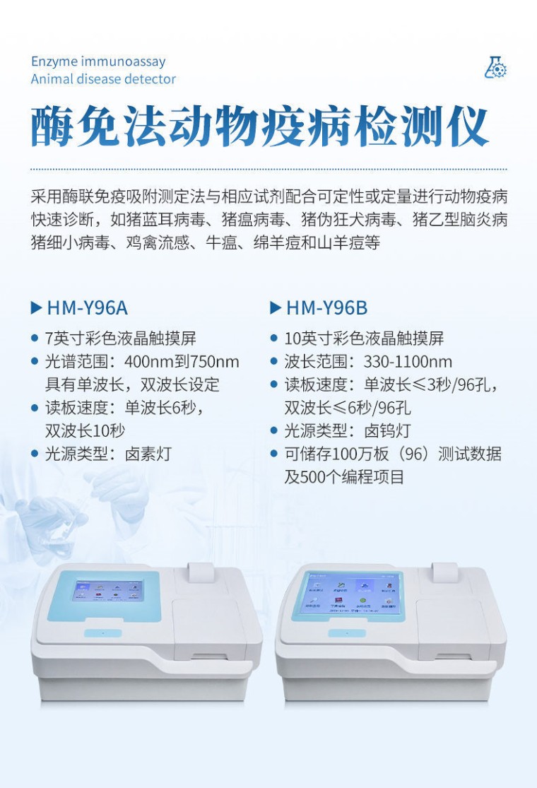 检测项目: 动物疫病检测仪是我公司在新推出的一款全新检测仪器,该系统采用酶联免疫吸附测定法与相应试剂配合可定性或定量进行动物疫病快速诊断。如:猪蓝耳病毒、猪瘟病毒、猪伪狂犬病毒、猪伪狂犬病毒gE蛋白、猪圆环病毒、猪乙型脑炎病毒、猪口蹄疫3ABC蛋白、猪口蹄疫病毒IgG、猪细小病毒、鸡禽流感、蓝舌病、白斑综合征、牛传染性胸膜肺炎、牛瘟、绵羊痘和山羊痘等等疫病检测,并可根据客户需要定制项目。 产品特点: *10.4英寸彩色液晶触摸屏输入,大屏显示,操作快捷; *全屏显示96孔可视化布板操作界面; 自动储存标准曲线,用户可对标准曲线进行修正; 内置嵌入式系统,无需外接电脑即可操作、存储、打印; 单波长和双波长测试模式下均可进行自动调零; 可选配外接PC软件,网络化支持,迎合数字化发展方向,可定制上传; *海量存在,至少可储存100万板(96)测试数据及500个编程项目,并支持数据备份恢复合并; *在同一板上可进行24个不同项目并可用显示区分的测试,并可同一板检测定性和定量项目; *模板功能,固定检测工作,极大简化操作人员工作量; 智能计算测试结果,确保测试结果的准确有效,并可自动报警; 全新Windows彩色图形化界面,全中文操作系统,支持鼠标、键盘,支持多种输入法; 光源智能开关,延长其寿命; *全面完善的质控功能,包含westguard多规则质控,即刻法质控等多种质控图及质控参数计算,具有质控报警功能; 提供多种打印方式及多种形式中文报告,并可定制各式报告; *布板和保存导入功能,大幅提高常用项目的测试效率; *可选择吸光度、Cut-Off定性计算、单点定标、折线回归、线性回归、指数回归、对数回归、双对数回归、log-logit、幂回归、四参数回归、酶抑制率等计算方法; 专用系统维护菜单,自动判断仪器当前状态及性能指标,并可打印相关数据; 技术参数: 波长范围: 330-1100nm *滤光片配置:10个滤光片位置,标配405nm、450nm、492nm、630nm,选配6定制波长 吸光度范围:0.000―4.000A *光通道数:8通道光路检测,另设一个独立参比通道 *示值稳定性:≤±0.002A或≤0.5%T/10min *示值误差(准确性):≤±0.005A或±0.2%T *重复性:≤0.2%或≤0.2%T 灵敏度:≥0.01(L/mg) 通道差异:≤0.01A 波长示值误差:±1nm 半宽度:≤8nm 峰值透射比:≥35% 分辨率:0.001A(显示),0.0001A(内部计算) *读板速度:单波长≤3秒/96孔,双波长≤6秒/96孔 振板功能:速度和时间可调 光源类型:卤钨灯 板条类型:标准96孔或其他型酶标板、条 适用孔型:平底、U型和V型 *显示方式:10.4英寸彩色液晶显示屏显示 输入方式:触摸屏输入,可选配鼠标和键盘 打印:内置热敏打印机,可外接打印机 接 口:DVI口、VGA口、网口、USB口、音频孔、RS232串口 使用环境:温度5-40℃;湿度15%-80% 电源电压:220V±10%,50/60Hz 体积:470mm×350mm×210mm(长×宽×高) 重量:11.5Kg