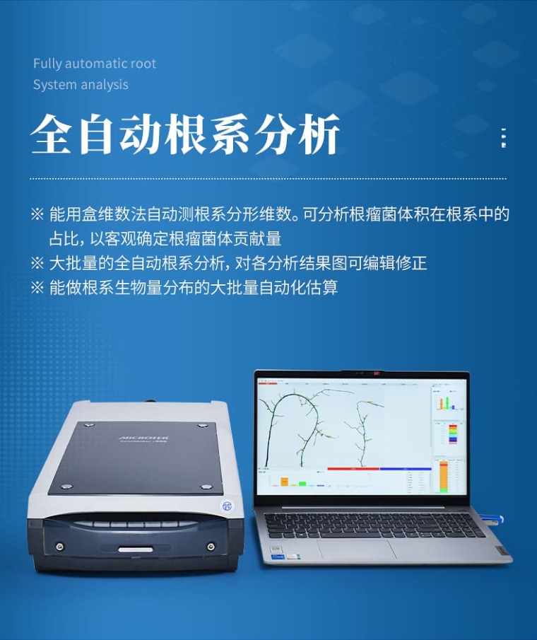 一、用途 植物根系扫描仪用于对洗净后的0.5mm直径以上根系进行快速拍照和多参数、批量化的自动分析系统。整套系统由高拍仪、分析软件(PC端)、电脑(自备)组成,其成像速度要比扫描款的快20倍。 二、主要性能指标 1、配自动对焦的2000万像素彩色拍摄仪。有效分析幅面最大297mm×210mm。特别适合快速自动分析测量0.5mm直径以上根系。 2、可分析测量: (1)根总长; (2)分支频率; (3)根平均直径; (4)根直径中值; (5)最大直径; (6)根总面积; (7)总投影面积; (8)根总体积; (9)根尖计数; (10)分叉计数; (11)交叠计数; (12)根直径等级分布参数; (13)可不等间距地自定义分段直径,自动测量各直径段长度、投影面积、表面积、体积 等,及其分布参数。 (14)能进行根系的颜色分析,确定出根系存活数量,输出不同颜色根系的直径、长度、投影面积、表面积、体积。 (15)能进行根系的拓扑分析,自动确定根的连接数、关系角等,还能单独地自动分析主根或任意一支侧根的长度、面积、体积等,可单独显示标记根系的任意直径段相应各参数(可不等间距地自定义)。 (16)能用盒维数法自动测根系分形维数。可分析根瘤菌体积在根系中的占比,以客观确定根瘤菌体贡献量。 (17)大批量的全自动根系分析,对各分析结果图可编辑修正。 (18)能做根系生物量分布的大批量自动化估算。 (19)向地角分析、水平角分析、主根提取分析特性。 (20)各分析图像、分布图、结果数据可保存,并输出至Excel表,可输出分析标记图。 (21)仪器有云平台支持,可将分析数据保存到云端随时随地查看。 三、标准配置 1、植物根系分析仪系统软件U盘及软件锁1套 2、自动对焦2000万像素高拍仪1台(A4幅面) 3、根系成像盘1个 4、超薄发光板套件1套 四、其他 1、本产品需使用电脑,推荐选配:品牌电脑(酷睿i5九代以上CPU / 16G内存/ 24”彩显/无线网卡,4个以上USB2.0口,运行环境Windows 10完整专业版或企业版)。