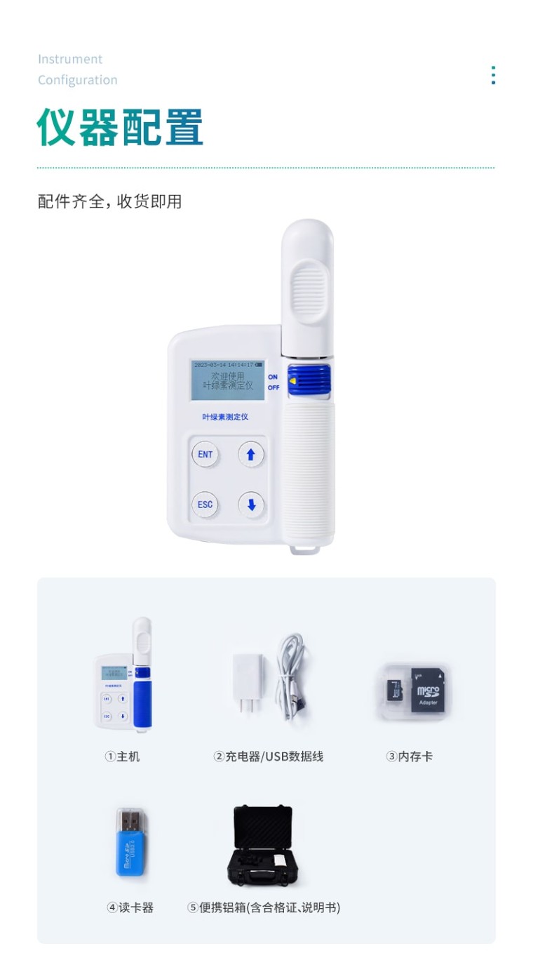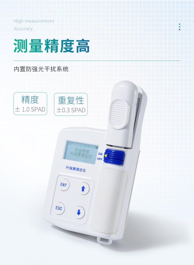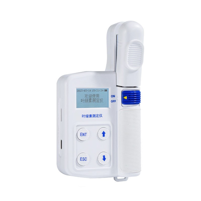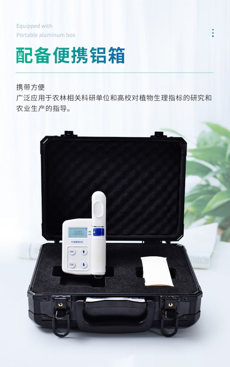 用途 叶绿素仪根据叶绿素光谱吸收规律,采用两种不同的发光管照射叶片,通过测量透过叶片的光的强度计算出叶片内的叶绿素相对含量或者绿色程度,从而为合理、适当、及时施肥提供可靠的科学依据,广泛应用于农业、林业、植物等科学研究和生产指导。 功能特点 1、快速无损植物活体检测,测量时只需将叶片插入即可,不需要采摘叶片,不影响作物正常生长,可以在作物生长过程中全程对叶片进行监测,从而得到更科学的分析结果 2、测量精度高(精度:± 1.0 SPAD,重复性:±0.3 SPAD) 3.16GB大存储空间,数据可进行分组存储、查看、导出 4、多功能USB接口,可实现数据导出与充电功能,可将仪器与电脑直接联机,数据导出无需上位机软件,还可选择使用内存卡直接导出数据,操作简单方便 5、数据浏览:可在仪器上随时浏览测量的数据以及可任意删除异常数据 6、高对比度LCD显示屏,强光下也可清晰显示数据 7、低功耗模式设计,内置大容量锂离子充电电池,具有防过充功能,节能环保并方便进行户外操作 8、内置中英文双语显示,一键切换,无缝对接 9、标准配置: 主机、充电器、USB数据线、内存卡、读卡器、便携铝箱,合格证、说明书等 技术指标 1.测量范围:0.0-99.99SPAD 2.测量面积:2mm*3mm 3.测量精度:±1.0 SPAD单位以内 (室温下,SPAD值介于0-50) 4.重复性:±0.3 SPAD单位以内 (SPAD值介于0-50) 5.测量时间间隔:小于0.8秒 6.数据存储:16GB 可根据用户需求进行分组存储 7.电源:4.2V可充电锂电池 8.电池容量:3000mah 9.重量:230g 10.工作及存储环境:-10℃~50℃ ≤85%相对湿度
