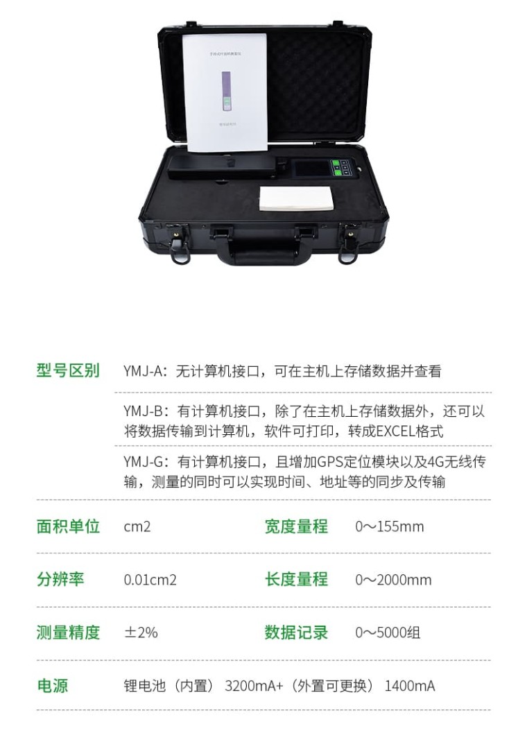 主机简介: YMJ系列叶面积仪是新研发的产品。是一种使用方便,可以在野外工作的便携式仪器。它可以精确、快速、无损伤地测量叶片的叶面积及相关参数,也可对采摘的植物叶片及其他片状物体进行面积测量。广泛应用于农业、气象、林业等部分。 叶面积仪可以直接测量叶片长度、宽度和面积,并集成了GPS定位以及4G无线传输系统,增加了Type-C接口,可将测量数据和定位信息同时导入计算机和云数据平台,方便广大科研者对数据的进一步处理。 型号区别: