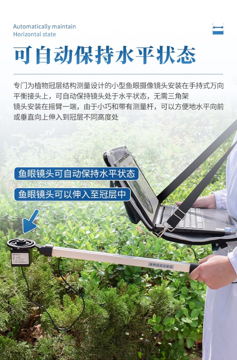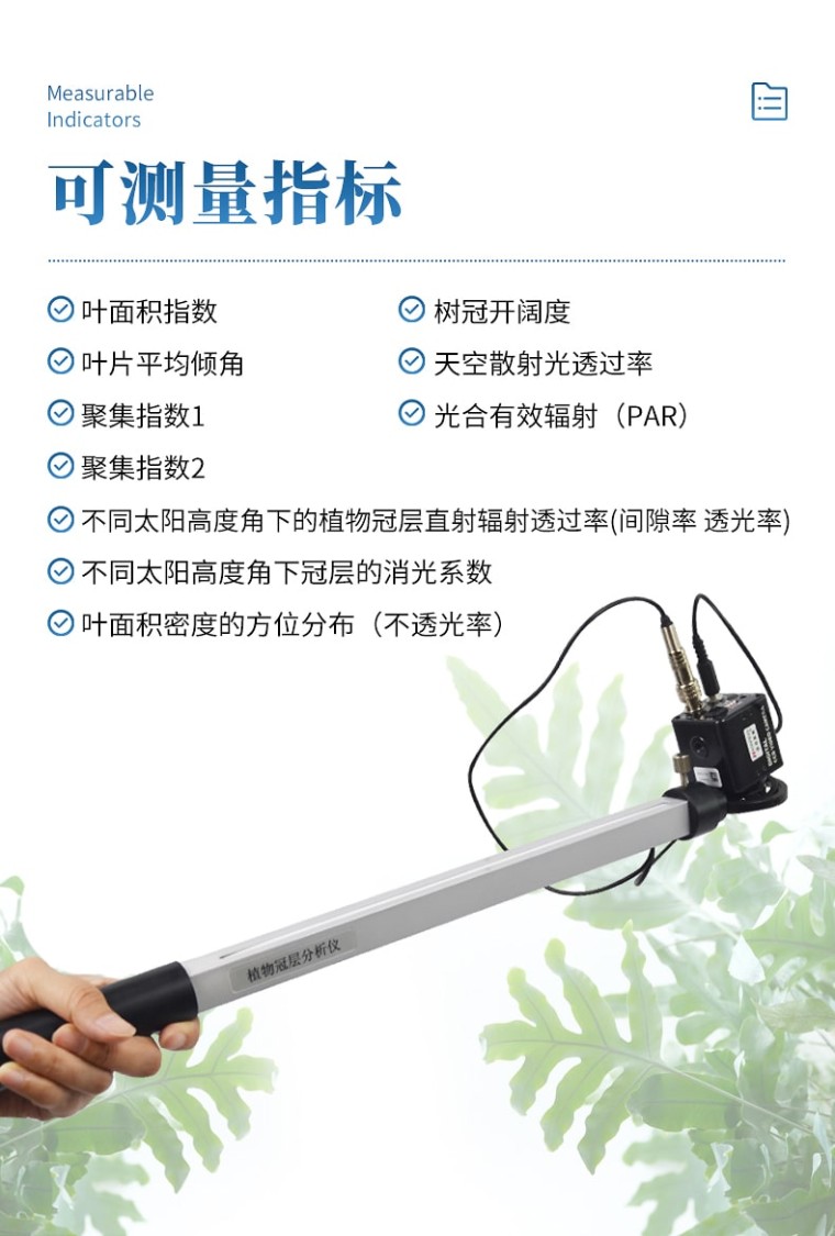 仪器介绍 叶面积指数测定仪用于各种高度植物冠层的研究,利用鱼眼镜头和CCD图像传感器获取植物冠层图像,通过专用分析软件,获得植物冠层的相关指标和参数。利用鱼眼镜头成像测量植物冠层数据,只操作一次即可,简化了传统测量方法要一天定点多次测量的繁复工作,而且利用图像法测量冠层可以主动避开不符合计算该冠 层结构参数的冠层空隙部分,也可以躲开不符合测量计算的障碍物。 测试原理与方法 叶面积指数测定仪采用了冠层孔隙率与冠层结构相关的原理。它是根据光线穿过介质减弱的比尔定律,在对植物冠层定义了一系列假设前提的条件下,采用半理论半经验的公式,通过冠层孔隙率的测定,计算出冠层结构参数。这是目前世界上各种冠层仪一致采用的原理。在上述原理下,植物冠层图象分析仪采用的是对冠层下天穹半球图像分析测量冠层孔隙率的方法,该方法是各类方法中最精确和最省力、省时、快捷方便的方法。 结构组成 叶面积指数测定仪由鱼眼图像捕捉探头(由鱼眼镜头及CCD图像传感器组成)、内置25个PAR传感器的测量杆(摇臂)、笔记本电脑、图像采集软件及图像 分析软件、高容量的可充电电池组组成。鱼眼探头安装在一个很轻的摇臂的顶端,它可以获取150°视角的鱼眼图像。图像的显示和存贮由配置的笔记本计算机完 成。 功能特点 鱼眼镜头可自动保持水平状态:专门为植物冠层结构测量设计的小型鱼眼摄像镜头安装在手持式万向平衡接头上,可自动保持镜头处于水平状态,无需三角架; 鱼眼镜头可以伸入至冠层中:镜头安装在摇臂一端,由于小巧和带有测量杆,可以方便地水平向前或垂直向上伸入到冠层不同高度处,快速地进行分层测量,测出群体内光透过率和叶面积指数垂直分布图; 图像分析软件:图像分析软件可以任意定义图像分析区域(天顶角可分10区,方位角可分10区)。 可屏蔽不合理冠层部分:对不同方向的冠层进行区域性分析时,可以任意屏蔽地物景象和不合理的冠层部分(如缺株、边行问题等)。对不同天顶角起始角和终止角的选择,可以避开不符合计算该冠层结构参数的冠层孔隙条件,通过手动调节阈值,可以更精准的测量出叶面积指数等参数; 可测量指标 叶面积指数 叶片平均倾角 天空散射光透过率 不同太阳高度角下的植物冠层直射辐射透过率 不同太阳高度角下冠层的消光系数 叶面积密度的方位分布 主要技术参数 镜头角度:150° 分辨率:768×494pix 测量范围:天顶角由0°~75°(150°鱼眼镜头)可分割成十个区域,方位角360°亦可分割成十个区域 PAR感应范围:感应光谱400nm~700nm 测量范围0~2000μmol/㎡•S 分析软件:植物冠层分析系统 电 源:8.4v可充电锂电池组 探头尺寸:直径6cm,高10cm 总 重 量:500克(不含笔记本电脑) 传输接口:USB 工作温度:0~55℃