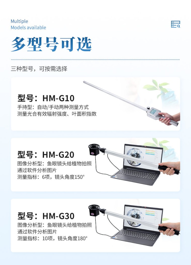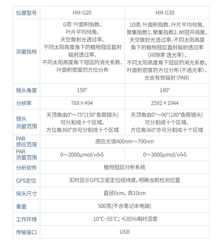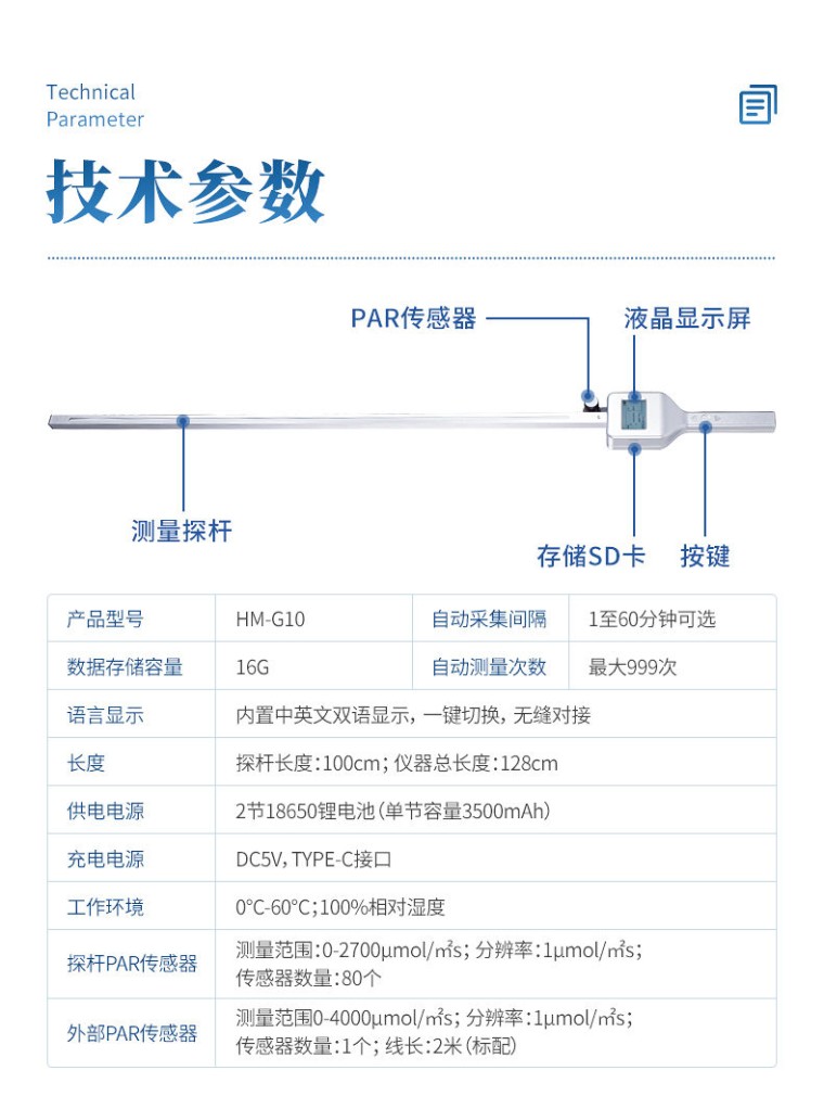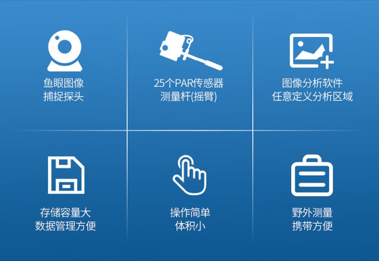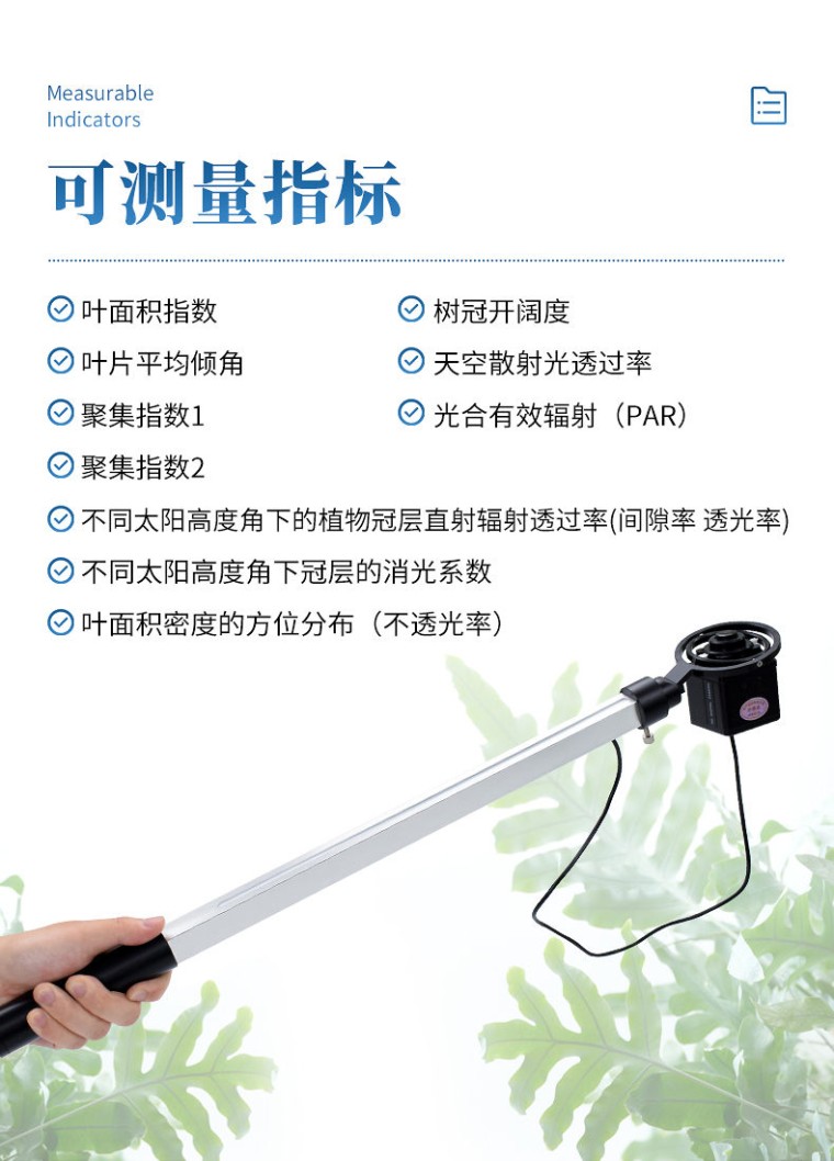 仪器介绍 植物冠层分析仪可广泛应用于农业生产和农业科研,为进行冠层光能资源调查,测量植物冠层中光线的拦截,研究作物的生长发育、产量品质与光能利用间的关系,本仪器用于400nm-700nm波段内的光合有效辐射(PAR)测量、记录,测量值的单位是平方米·秒上的微摩尔(μmol/㎡s)。同时使用PAR读数和GPS定位信息等参数可给出植物冠层的叶面积指数(LAI)。 功能特点 植物冠层分析仪为一体化设计,包括液晶显示屏、操作按键、存储SD卡、探杆传感器、外部传感器等。仪器菜单操作简单,体积小,携带方便。数据保存有SD卡和无线上传(选配)两种存储方式,SD卡为市场通用型卡,存储容量大,数据管理方便;无线上传联网速度快,网页可清晰查看测量的PAR值、LAI值、天顶角及GPS定位信息。功耗有合理的电源管理方案,测试过程中仪器根据实际情况自动进入待机状态,需要时按唤醒键即可唤醒屏幕,观察实际数据。测量方式分为自动和手动两种,自动测量时间间隔最小1分钟,最大60分钟,自动测量次数最大999次;手动测量根据实际需要手动采集即可。 技术参数 叶面积指数(LAI) 探杆PAR传感器 测量范围:0-2700μmol/㎡s; 分辨率:1μmol/㎡s; 传感器数量:80个 外部PAR传感器 测量范围0-4000μmol/㎡s; 分辨率:1μmol/㎡s; 传感器数量:1个 线长:2米(标配) 自动采集间隔:1至60分钟可选 数据存储容量:16G 内置中英文双语显示,一键切换,无缝对接 探杆长度:100cm 仪器总长度:128cm 供电电源:2节18650锂电池(单节容量3500mAh) 充电电源:DC5V,TYPE-C接口 工作环境:0℃-60℃;100%相对湿度