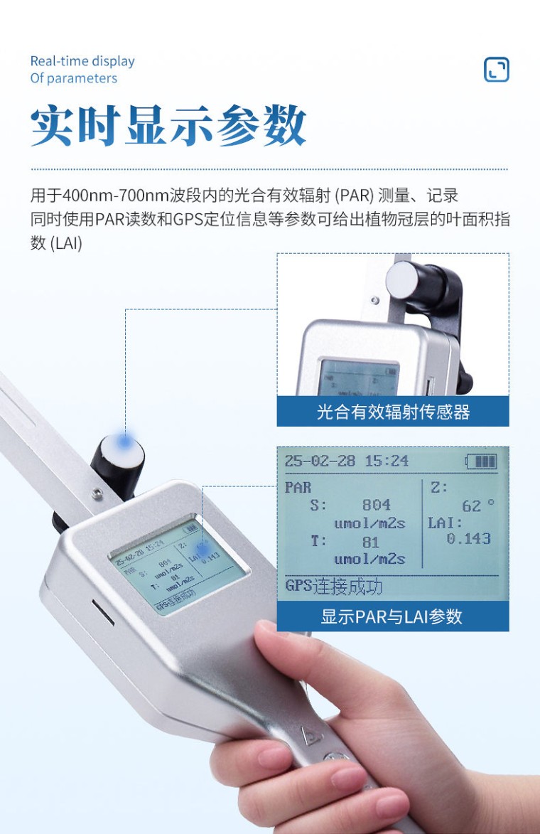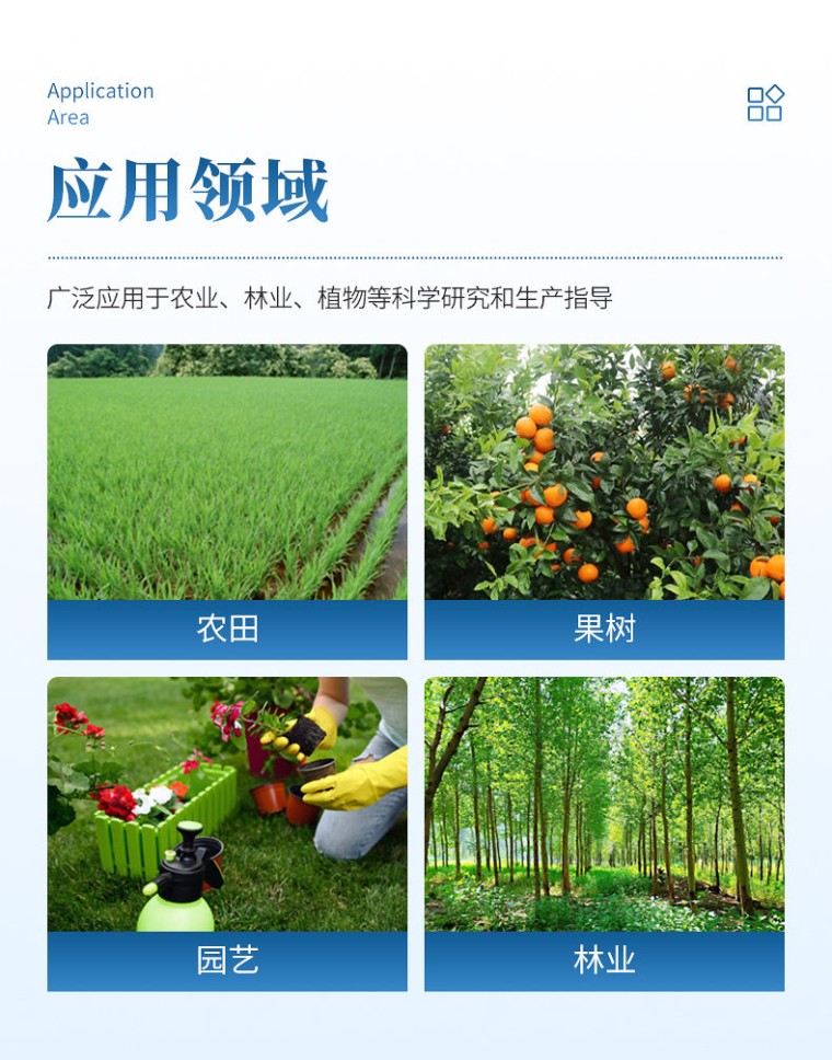 用途 植物冠层图像分析仪根据各种图像处理手段提取多个角度的冠层间隙率,采用装配鱼眼镜头的相机从树冠下向上拍摄冠层照片,利用间隙率参数来反演出各种冠层参数,导田园合理施肥、现代化农场高效管理提供可靠的科学依据,广泛应用于农业、林业、植物等科学研究和生产指导。 测试原理与方法 植物冠层图像分析仪采用了冠层孔隙率与冠层结构相关的原理。它是根据光线穿过介质减弱的比尔定律,在对植物冠层定义了一系列假设前提的条件下,采用半理论半经验的公式,通过冠层孔隙率的测定,计算出冠层结构参数。这是目前世界上各种冠层仪一致采用的原理。在上述原理下,植物冠层图象分析仪采用的是对冠层下天穹半球图像分析测量冠层孔隙率的方法,该方法是各类方法中较准确和省力、省时、快捷方便的方法。 结构组成 植物冠层图像分析仪由鱼眼图像捕捉探头(由鱼眼镜头及CMOS图像传感器组成)、内置25个PAR传感器的测量杆(摇臂)、笔记本电脑、图像分析软件组成。鱼眼探头安装在一个很轻的摇臂的顶端,它可以获取180°视角的鱼眼图像。图像的显示和存贮由配置的笔记本计算机完成。 技术指标 1、 可测量指标: 叶面积指数 叶片平均倾角 聚集指数1 聚集指数2 树冠开阔度 天空散射光透过率 不同太阳高度角下的植物冠层直射辐射透过率(间隙率 透光率) 不同太阳高度角下冠层的消光系数 叶面积密度的方位分布(不透光率) 光合有效辐射(PAR) 2、 镜头角度:180° 3、 分辨率:2592 × 1944 4、 测量范围:天顶角由0°~90°(180°鱼眼镜头)可分割成十个区域,方位角360°亦可分割成十个区域 5. PAR感应范围:感应光谱400nm~700nm 6、 测量范围0~3000μmol/㎡•S 7、 分析软件:植物冠层分析系统 8、 重量:500g 9、 工作及存储环境:-10℃~55℃ ≤85%相对湿度 10、 传输接口:USB 功能特点 1、 鱼眼镜头可自动保持水平状态:专门为植物冠层结构测量设计的小型鱼眼摄像镜头安装在手持式万向平衡接头上,可自动保持镜头处于水平状态,无需三角架; 2、 鱼眼镜头可以伸入至冠层中:镜头安装在摇臂一端,由于小巧和带有测量杆,可以方便地水平向前或垂直向上伸入到冠层不同高度处,快速地进行分层测量,测出群体内光透过率和叶面积指数垂直分布图; 3、 图像分析软件:图像分析软件可以任意定义图像分析区域(天顶角可分10区,方位角可分10区)。 4、 可屏蔽不合理冠层部分:对不同方向的冠层进行区域性分析时,可以任意屏蔽地物景象和不合理的冠层部分(如缺株、边行问题等)。 5、 自动化阈值调节,避免主观设置阈值导致增大误差 6、实时显示GPS卫星定位经纬度,明确当前检测位置 7、检测结果可直接传至专属云农业数据中心,配备专属云农业数据中心账户 8、 数据浏览:可浏览历史数据 9、 内置中英文双语显示,一键切换