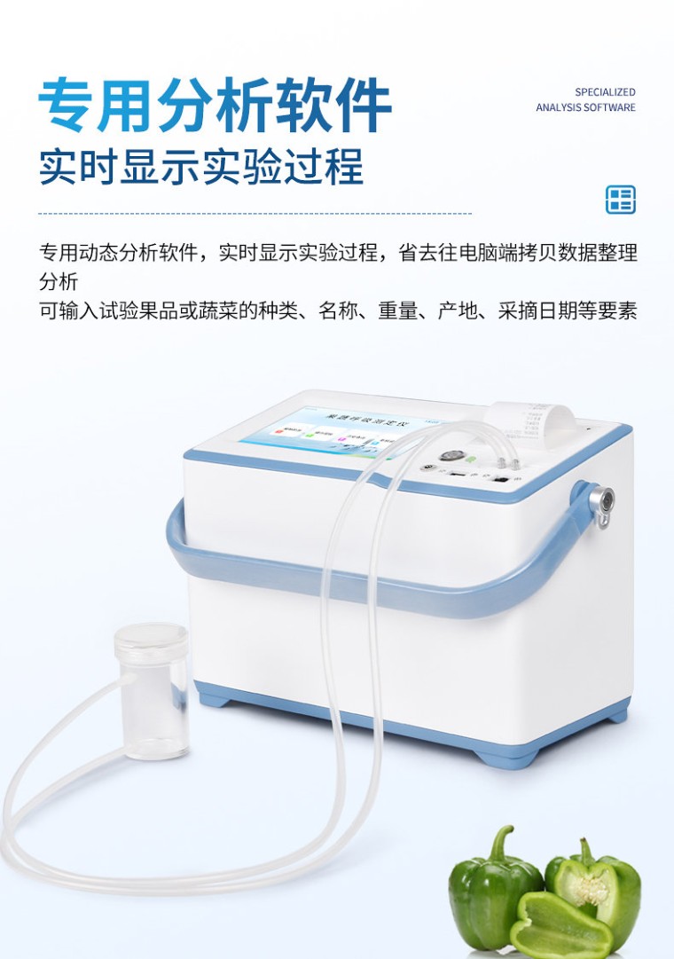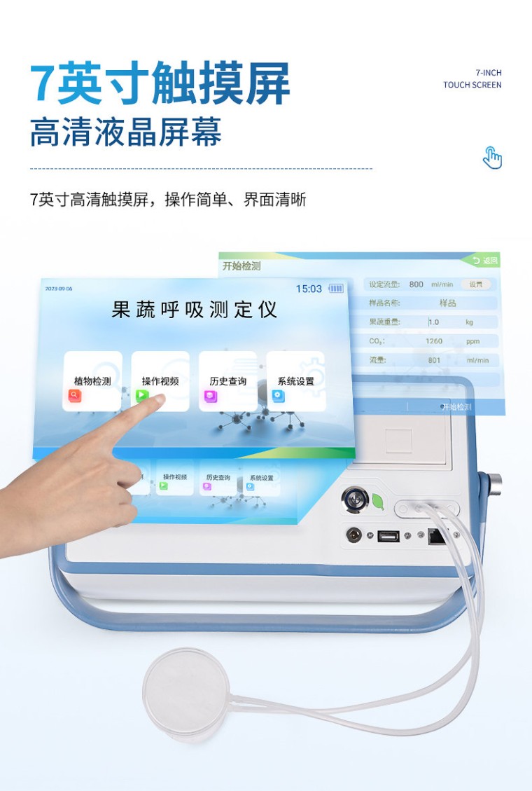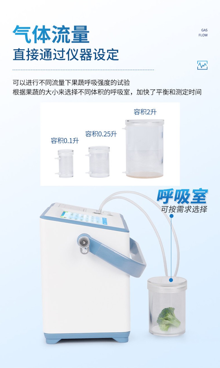 用途 收获后的果蔬产品仍然是一个独立的有生命活动的生物体, 为了维持生命, 必然要进行呼吸作用。呼吸作用是果蔬等园艺产品采摘后最主要的生理代谢方式,呼吸强度是衡量呼吸作用强弱的一个指标, 是研究果蔬采摘后生理变化和贮运保鲜中必须掌握的重要指标。 果蔬呼吸测定仪器采用双波长红外二氧化碳分析器,7寸安卓显示器,专门用于常温、冷藏库、气调库、超市冷柜等储藏条件下的果品和蔬菜呼吸强度的测定和分析研究。 该仪器的特点是可以根据果蔬的大小来选择不同体积的呼吸室,加快了平衡和测定时间;可以通过电脑直接操作仪器,同时显示呼吸室的CO2浓度、O2浓度、温度和湿度及变化曲线。 特点: 1、Android安卓操作系统,更便捷的人机交互操作 2、7寸高清触摸屏,操作简单、界面清晰; 3、气体流量直接通过仪器设定,可以进行不同流量下果蔬呼吸强度的试验; 4、专用动态分析软件,可在安卓显示屏上实时显示实验过程,省去往电脑端拷贝数据,整理分析; 5、可输入试验果品或蔬菜的种类、名称、重量、产地、采摘日期等要素; 6、支持wifi、4G联网;数据可无线上传至云平台; 7、存储空间16G,可存储100000+条数据; 8、数据可直接通过USB接口导出到U盘; 9、检测完成可直接打印并上传检测数据结果; 10、支持GPS定位; 技术指标 1、二氧化碳 检测原理:非色散红外法 灵 敏 度 : 1秒钟之内就可以完成二氧化碳差值采集。 测量范围:0-5000ppm. 精 度:3ppm 分辨率:0.1ppm 2、氧气检测 检测原理:电化学式 测量范围:0-100% 线 性 度:≤±2%F.S 重 复 性:≤±1% 响应时间:30s 零点漂移:≤±2%F.S/24h 终点漂移:≤±2%F.S/24h 3、温度检测 测量范围:-20-95℃ 分 辨 率:0.1℃ 精 度:±0.2℃ 4、湿度检测 测量范围:0-100% 分 辨 率:0.1% 精 度:±0.2%F.S 5、电源电压:12V3A电源适配器 呼吸室参数 1、内径40mm的净空间80mm 容积为0.1升 2、内径60mm的净空间89mm 容积为0.25升 3、内径120mm的净空间180mm 容积为2升 配件 名称 数量 单位 主 机 1 台 呼吸室 3 套 电源线 1 条 气 管 2 条 说明书 1 份 U 盘 1 支 仪器箱 1 只 装箱单 1 份 说明书 1 份 合格证 1 份