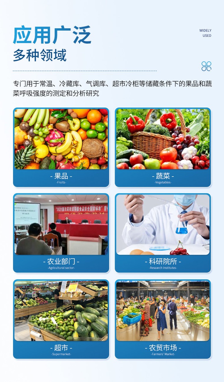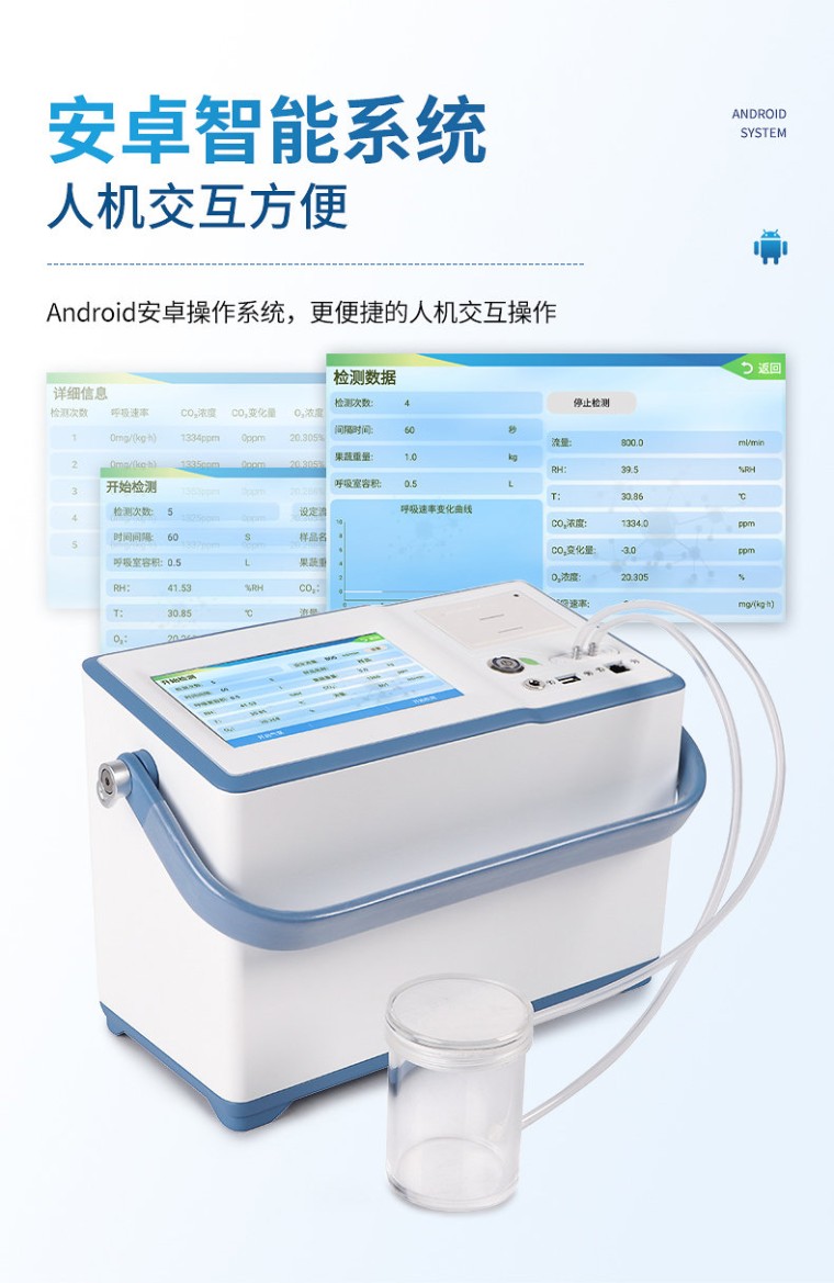 一、仪器用途 收获后的果蔬产品仍然是一个独立的有生命活动的生物体, 为了维持生命, 必然要进行呼吸作用。呼吸作用是果蔬等园艺产品采摘后最主要的生理代谢方式,呼吸强度是衡量呼吸作用强弱的一个指标, 是研究果蔬采摘后生理变化和贮运保鲜中必须掌握的重要指标。 果蔬呼吸仪采用双波长红外二氧化碳分析器,7寸安卓显示器,专门用于常温、冷藏库、气调库、超市冷柜等储藏条件下的果品和蔬菜呼吸强度的测定和分析研究。 该仪器的特点是可以根据果蔬的大小来选择不同体积的呼吸室,加快了平衡和测定时间;可以直接操显示呼吸室的CO2浓度、O2浓度、C2H4浓度、温度和湿度及变化曲线。 二、仪器特点: 1、检测指标有二氧化碳浓度、氧气浓度、乙烯浓度、温度和湿度; 2、Android安卓操作系统,更便捷的人机交互操作; 3、7寸高清触摸屏,操作简单、界面清晰; 4、气体流量直接通过仪器设定,可以进行不同流量下果蔬呼吸强度的试验; 5、专用动态分析软件,可在安卓显示屏上实时显示实验过程,省去往电脑端拷贝数据,整理分析; 6、可输入试验果品或蔬菜的种类、名称、重量、产地、采摘日期等要素; 7、支持wifi、4G联网;数据可无线上传至云平台; 8、存储空间16G,可存储100000+条数据; 9、数据可直接通过USB接口导出到U盘; 10、检测完成可直接打印并上传检测数据结果; 11、支持GPS定位。 三、技术指标 1、二氧化碳 检测原理:非色散红外法 灵 敏 度 : 1秒钟之内就可以完成二氧化碳差值采集。 测量范围:0-5000ppm. 精 度:3ppm 分辨率:0.1ppm 2、氧气检测 检测原理:电化学式 测量范围:0-100% 线 性 度:≤±2%F.S 重 复 性:≤±1% 响应时间:30s 零点漂移:≤±2%F.S/24h 终点漂移:≤±2%F.S/24h 3、乙烯检测 检测原理:电化学式 测量范围:0-200ppm 灵敏度:75±35 nA/PPM 重复性:<±2% 响应时间:≤90s 零点漂移:0~1PPM 分辨率:1ppm 长期稳定性 < 2%/月 4、温度检测 测量范围:-20-95℃ 分 辨 率:0.1℃ 精 度:±0.2℃ 5、湿度检测 测量范围:0-100% 分 辨 率:0.1% 精 度:±0.2%F.S 5、电源电压:12V3A电源适配器 四、呼吸室参数 1、小号,内径40mm的净空间80mm 容积为0.1升 2、中号,内径60mm的净空间89mm 容积为0.25升 3、大号,内径120mm的净空间180mm 容积为2升