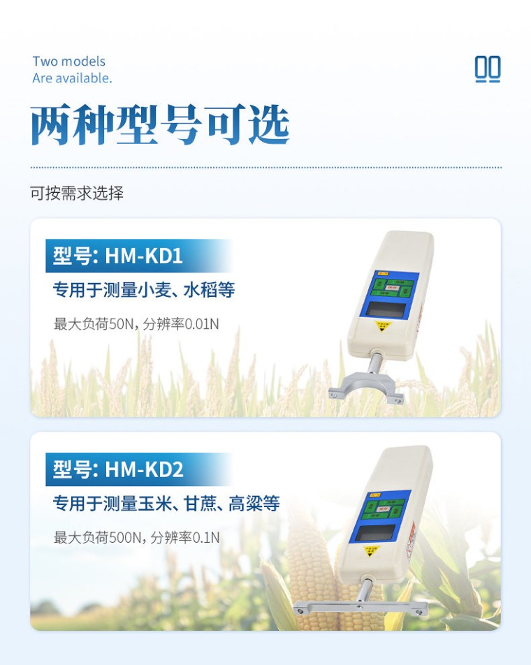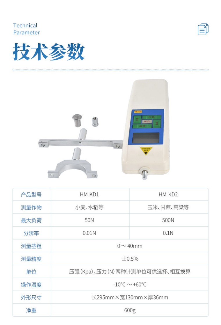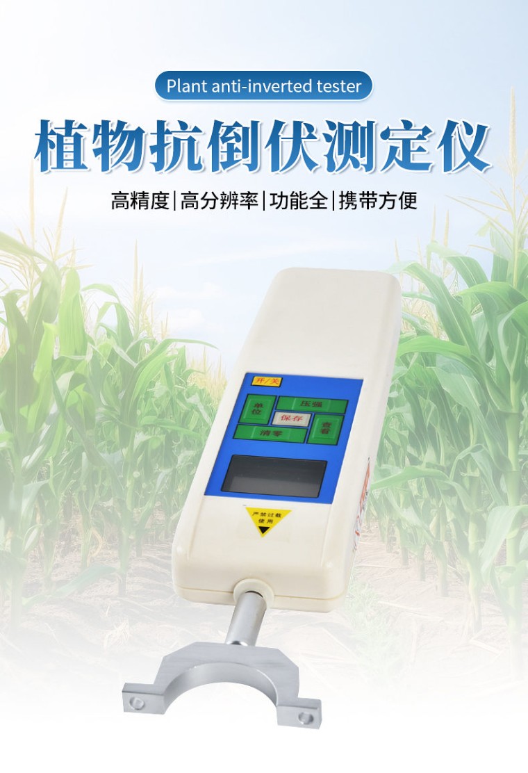一、用途 植物抗倒伏测定仪是决定农作物抗倒伏能力的一个关键因素,玉米,高梁、烟草等的植物的倒伏给农作物的机械收割造成很大的困难。造成大量的浪费。另外,农作物的倒伏导致光照不充分,使其生产量受到极大的限制。在作物生长的各个阶段对其茎杆进行活体测量,进而根据茎杆纤维层的抗弯阻力与抗倒伏能力的相关性对群体测量数据进行统计处理,对作物的栽培和育种具有重要意义。 二、功能特点 1、高精度高分辨率。 2、具有操作简单,功能全、携带方便等特点。 3、压强(Kpa)、压力(N)两种计测单位可供选择、相互换算。 4、具有背光灯功能。(在无操作显示器按键情况下,10秒钟后无背光灯显示) 5、具有绿色环保,自动关机功能。(在无操作显示器按键情况下,10分钟后显示器自动关机) 三、技术参数 1、 型号:KD1;KD2。 2、 最大负荷:KD1型50N;KD2型500N。 3、 分辨率:KD1型0.01N;KD2型0.1N。 4、 测量茎粗:0~40mm。 5、 测量精度:±0.5%。 6、 单位:Kpa、N。 7、 操作温度:-10℃~+60℃; 8、 外形尺寸:长295mm×宽130mm×厚36mm 9、 净重:~600g 注:KD1型专用于测量小麦、水稻等.KD2型专用于测量玉米、甘蔗、高粱等。