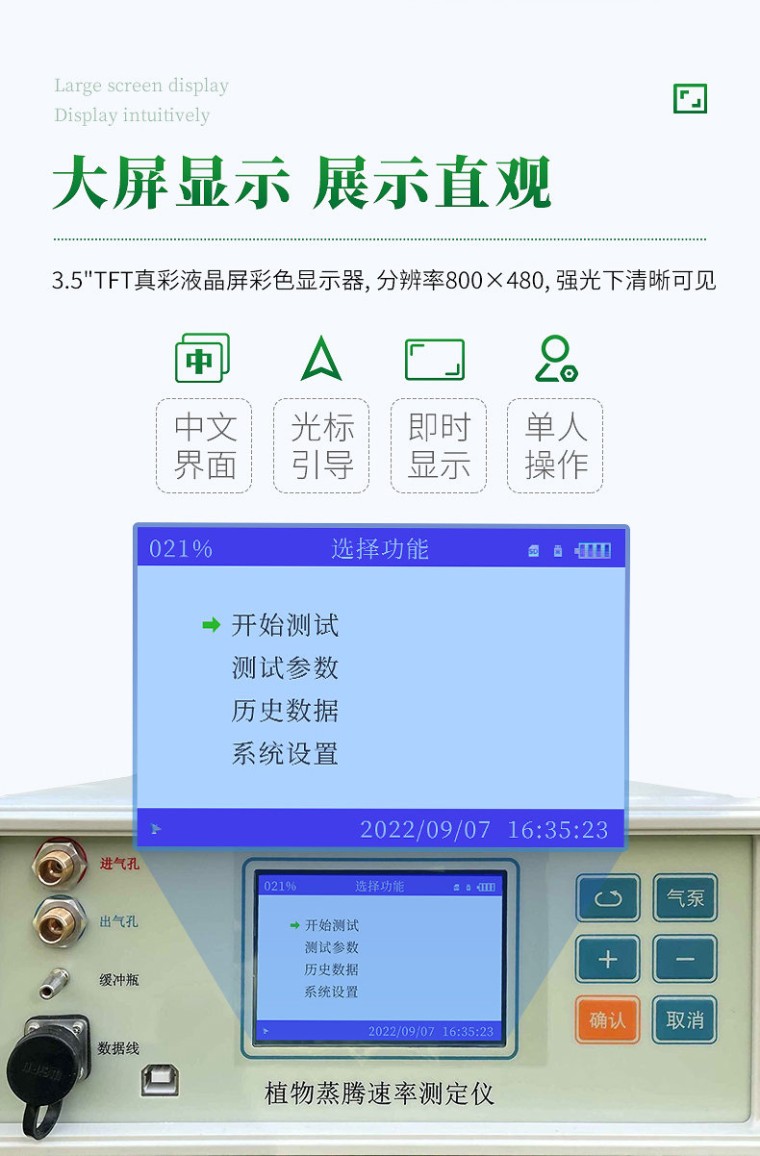 仪器用途 植物蒸腾速率测定仪是一款采用开闭路两种测量方式的科研型仪器。用来测量各种因素对叶片气孔行为的影响,可方便、重复、准确地计算出气孔阻抗、气孔导度和蒸腾速率,还可测得空气温湿度,叶面温度,光合有效辐射。广泛的应用于植物叶片的水分生理研究,农作物水分利用、水分胁迫危害、生物化控调节效果等研究。 测量方式 开路闭路两种测量方式 测量原理 原理:将叶面置于开放叶室中,让大气以一定流速进入叶室,分别测量进出叶室的气体湿度,然后通过进出叶室的气体湿度差值来计算出蒸腾速率。 测量功能 蒸腾速率,叶片对水气的总导度、气孔水气的导度、气孔阻抗、叶片温度、叶室进气湿度、叶室出气湿度、叶室温度、叶室湿度、气体流量、光强PAR、大气压力。 测量单位: 蒸腾速率(Tr):mmolH2Om-2.s-1 叶片对水气的总导度:(Gtw)molH2Om-2.s-1 气孔导度(Gsw): molH2Om-2.s-1 气孔阻抗(Rs):sm-1 精度:蒸腾 1~5% ,导度 5~10% 技术参数 叶室温度: 德国贺利氏高精度数字温度传感器,测量范围:-20-80℃,分辨率:0.1℃,误差:±0.2℃ 叶片温度: T型热电偶,测量范围:-20-60℃,分辨率:0.1℃,误差:±0.2℃ 进气湿度、出气湿度、叶室湿度三湿度传感器: 瑞士进口高精度数字湿度传感器: 测量范围0-85%,分辨率:0.1%,误差≤ 1% 内置光合有效辐射测量(PARin):(选配) 硅光电二极管 测量范围:0-2500μmolm -2s-1 ,精度:±5μmolm-2s-1. 响应波长范围:400~700nm 外置光合有效辐射传感器(PARout): 带有修正滤光片的硅光电池 测量范围:0-2500μmolm -2s-1 ,精度:±5μmolm-2s-1. 响应波长范围:400~700nm 流量测量:微型电子流量计,流量在0.2-1.2L范围内任意设定。分辨率:0.0001L, 零点漂移:±0.005L,气泵流量可根据需要设定,可测量不同气体流量下对光合作用的影响,气体流量稳定。 新型叶室:叶室夹持力度可根据叶片厚度调整,既可以不损伤叶片也可以避免漏气,上叶室覆盖高透光、非收缩性薄膜,还可以有效隔热,如果该薄膜被刺破撕裂或者被叶片弄脏, 可以随时更换。可配置三脚架。 叶室尺寸: Ⅰ型:(30×10mm) Ⅱ型:(30×20mm) 标配尺寸 Ⅲ型:(30×30mm) 管道系统:本仪器采用对水分凝滞性、吸附性低的复合塑料软管,即便是在高温下也能保持良好性能,且内壁平滑。相比PVC或硅胶管该管有良好的疏水性。 大气压力: 范围:150~1150mbar 分辨率:0.1mbar 误差:±1.5% 数据存储:内存16G,可扩展为32G。 数据传输:USB连接电脑可直接导出数据 显示:3.5"TFT真彩液晶屏彩色显示器,分辨率 800×480,强光下清晰可见 按键:六按键,操作简单方便,可设定修改日期,时间,测量间隔、数据采集次数以及试验名称。 体积:260×260×130mm 重量:主机3.5kg
