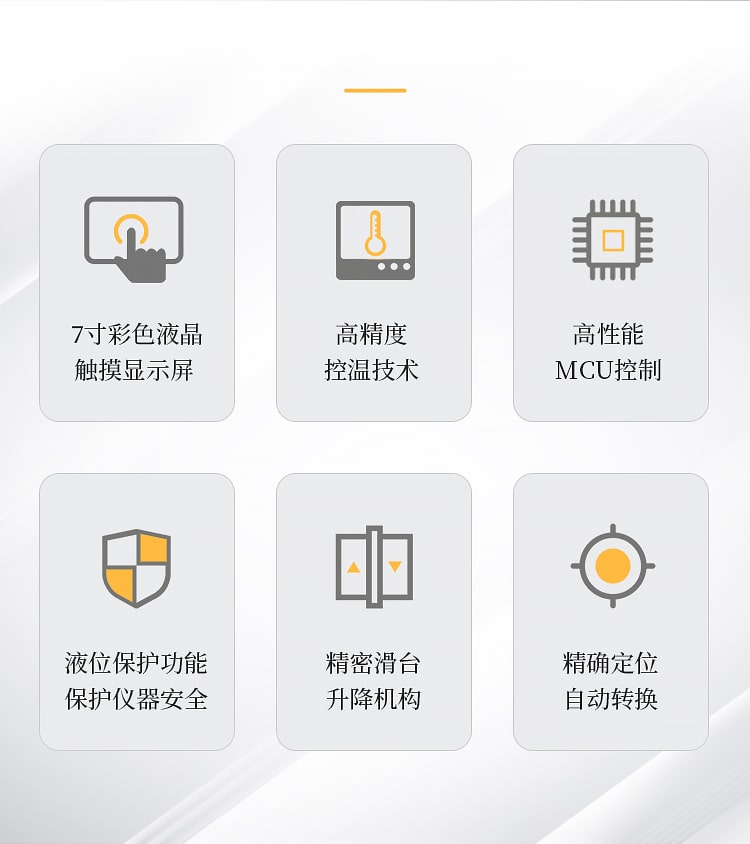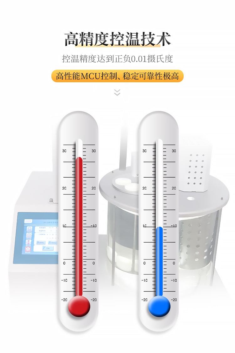 主要特点: 1、7寸高清触摸屏操作,操作简单,四试验通道设计提高工作效率. 2、采用高精度控温技术,控温精度达到正负0.01摄氏度. 3、全部高性能MCU控制、稳定可靠性极高. 4、可长期连续工作,故障率极低. 5、带液位保护功能,恒温液低于一定液位自动停止加热,保护仪器安全. 6、升降机构采用精密滑台,定位准确,噪音小. 7、使用步进电机进行样品位的精确定位,自动转换样品位,无需人为手动操作。 技术参数: 1、温度范围:室温~100℃ 精度±0.01℃. 2、温度传感器:德国A级Pt100不锈钢探头, 内置温度校正,检测结果可靠. 3、加热方式:电加热单元,最大加热功率1000 W. 4、显 示:7寸工业彩色触摸屏. 5、温度校正:0-20随意调整. 6、电 源:AC220V 50Hz。最大功率1500 W. 7、使用环境温度:10~35℃. 8、存储环境温度:0~50℃.