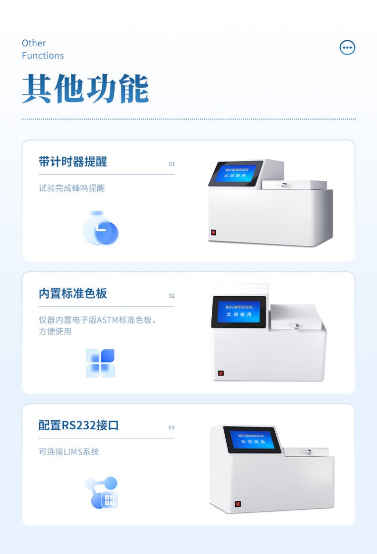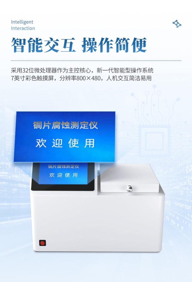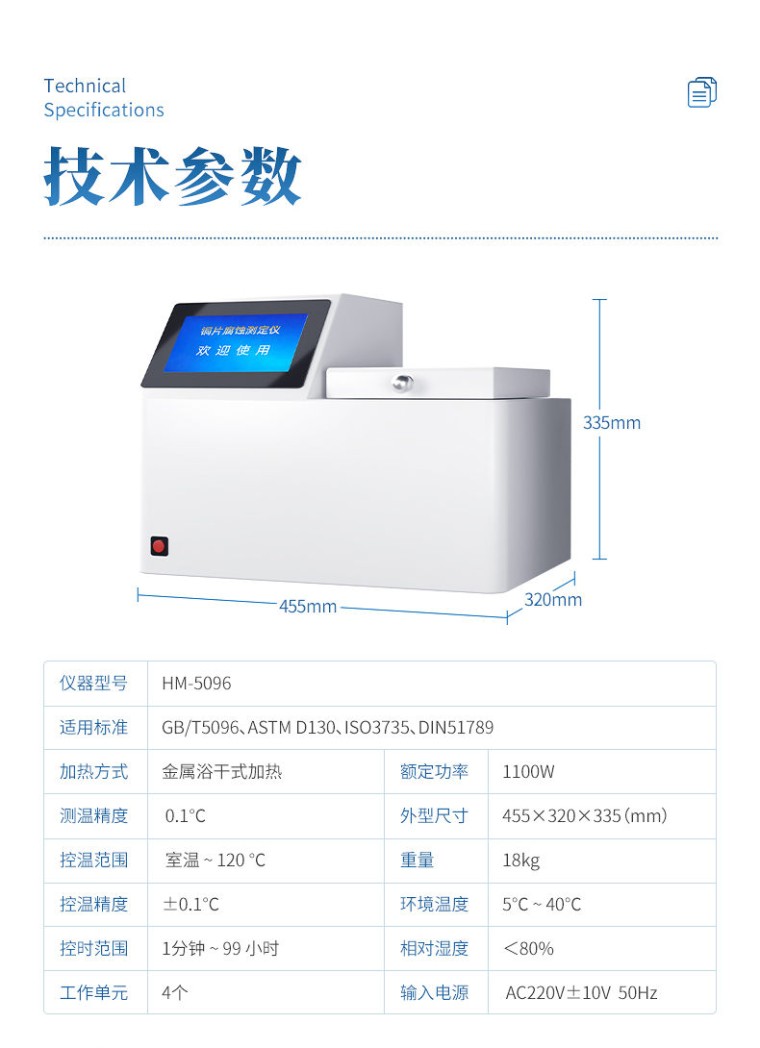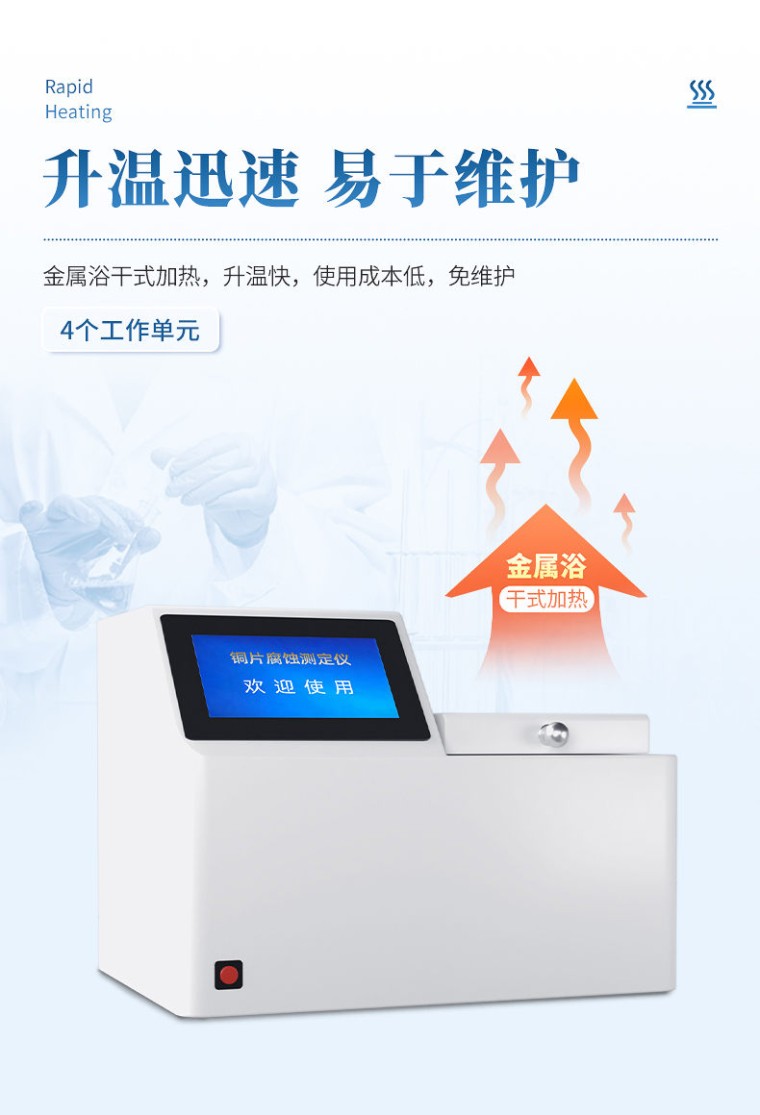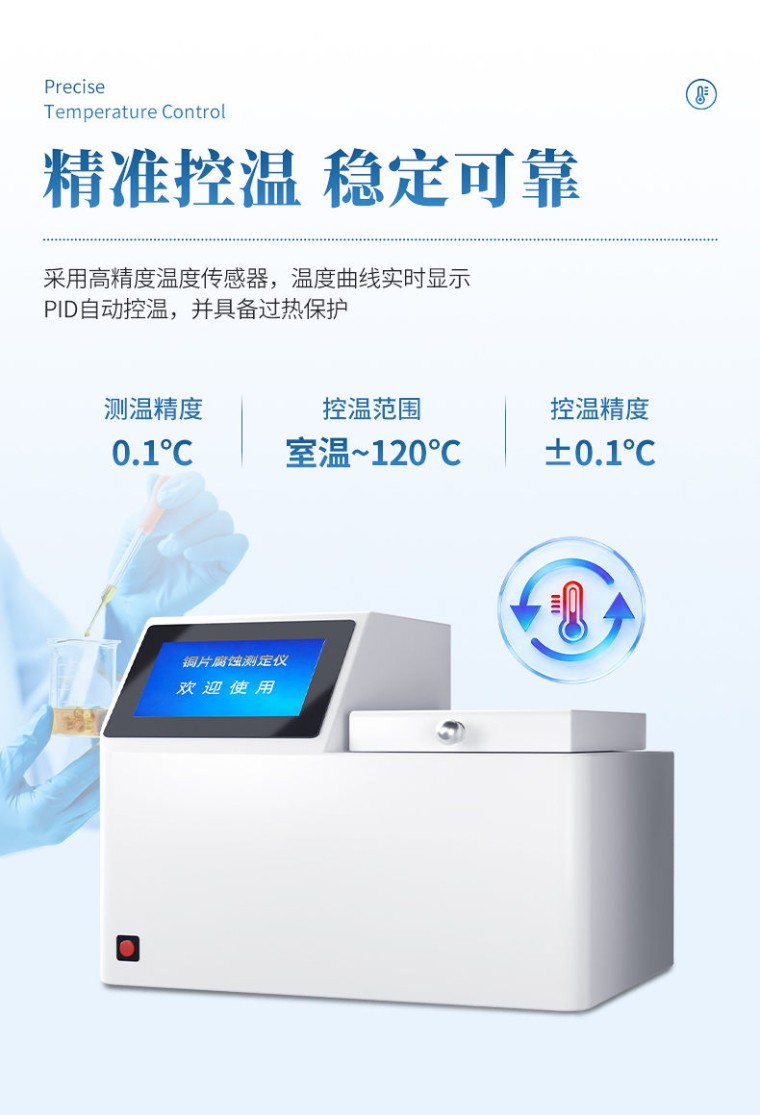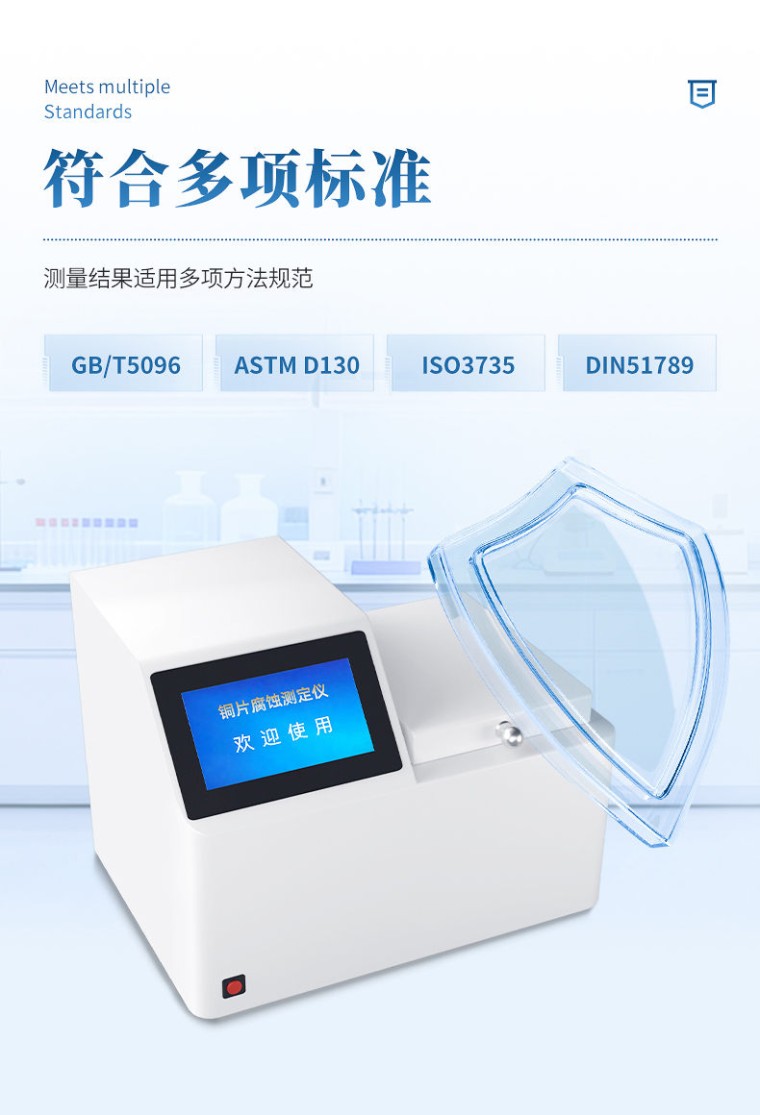 一、产品简介 铜片腐蚀测定仪采用先进的32位MCU,7英寸大屏幕液晶显示,具有测温精度高、升温迅速、稳定可靠、操作简便、易于维护的优点。本机适用于变压器厂、供电部门、炼油厂、铁路、航运、贮油站及商业部门对石油产品腐蚀性质进行监测和控制,进行快速分析的必要仪器。测量结果符合GB/T5096方法规范。 二、主要功能与特点 1. 7英寸彩色触摸屏,分辨率800×480,人机交互简洁易用。 2、 采用32位微处理器作为主控核心,新一代智能型操作系统。 3、 采用高精度温度传感器,温度曲线实时显示。 4. PID自动控温,并具备过热保护。 5、 金属浴加热,升温快,使用成本低,免维护。 6、 带计时器提醒,试验完成蜂鸣提醒。 7、 仪器内置电子版ASTM标准色板,方便使用。 8、 配置RS232接口,可连接LIMS系统。 三、技术指标 1、 适用标准: GB/T5096、ASTM D130、ISO3735、DIN51789 2、 加热方式: 金属浴干式加热 3、 测温精度: 0.1℃ 4、 控温范围: 室温 ~ 120 ℃ 5、 控温精度: ±0.1℃ 6、 控时范围: 1分钟 ~ 99 小时 7、 工作单元: 4个 8、 额定功率: 1100W 9、 外型尺寸: 455×320×335(mm) 10、 重 量: 18 kg 四、使用条件 1、 环境温度: 5℃~40℃ 2、 相对湿度: <80% 3、 输入电源: AC220V±10V 50Hz
