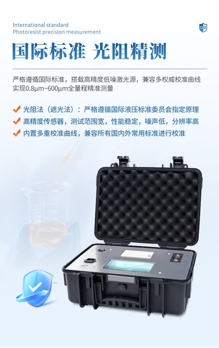 油液清洁度监测仪是采用国际液压标准委员会指定的光阻(遮光)法计数原理,专门用于现场在线测量的、油液污染度等级检测装置。具有体积小、质量轻、检测速度快、精度高、重复性好等优点,可在高温高压等及其恶劣的条件下工作。适用于发动机油、齿轮油、变压器油(即绝缘油)、液压油、润滑油、合成油、水基类(水基液压油、水乙二醇等)、醇类、酮类等一切透光溶剂,可广泛应用于航空航天、石油化工、交通港口、钢铁冶金、汽车制造等领域。 主要特点 用光阻(遮光)法原理,使用高精度激光传感器,体积小、精度高、性能稳定 适用于现场的在线检测,可实时监测用油系统中的颗粒污染度 内置数据分析系统,能显示各通道粒径的真实数据并自动判定样品等级 标准款可直接耐压100公斤,可选配减压阀用于超高压在线测量 具有体积冲洗和时长冲洗模式,方便用户对设备的使用和维护 内置ISO4406、NAS1638、SAE4059、GJB420A、GJB420B、ГOCT17216、GB/T14039等颗粒污染度等级标准 内置校准功能,可按GB/T21540、ISO4402、ISO11171、GB/T18854等标准进行校准,一次测试可以给出所有内置标准结果 可独立设定所有标准任意报警级别,实现污染度或洁净度检测 标准款具有RS232、RS485及USB接口,支持标准Modbus协议可连接电脑、上位机、打印机、PLC系统或其它设备进行数据监控、处理 超大存储,可选择存储在仪器内部或外部存储设备中 坚固外型结构,适合复杂工作环境 下进上出的模式有利于最大限度减小在线气泡对测试结果的干扰 可连续测试也可任意设置测试时间间隔 中英文双系统,客户可自由切换,适合外销出口 触屏或者薄膜按键操作,可自由切换,仪器界面可自由控制远端打印机的开关 可选接工控系统设备,实现远程数据监控、历史数据、曲线查询(选配) 内置水分和温度传感器模块,可同时输出四种参数信息(标准款选配) 技术指标 光 源:半导体激光器 流速范围:5-500mL/min 检测样品粘度:≤650cSt 在线检测压力:0.1~10 Mpa(选配减压装置最高压力可达42Mpa) 粒径范围:1~1000μm 标准款接口:USB接口、RS232接口、RS485接口 数据存储:提供1000组数据存储空间,并支持优盘存储 灵 敏 度:1μm或4μm(c) 极限重合误差:40000粒/ml 计数体积:1~999ml 计数准确性:±0.5个污染度等级 防护等级:IP56/IP67 温度(选配):采集范围:1~100℃ ; 测量精度:1℃ 水活性(选配):采集范围:1~100%RH ; 测量精度:1%RH 含水量(选配):采集范围:1~360ppm ; 测量精度:1ppm 测试时间间隔:1秒~24小时 检测样品温度:0~80℃ 工作温度:-20~60℃ 供 电: AC 220V±10%、50/60Hz或DC9-36V 重 量:1kg 体 积:115×85×60mm
