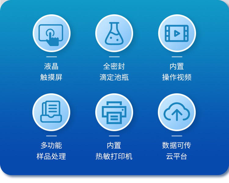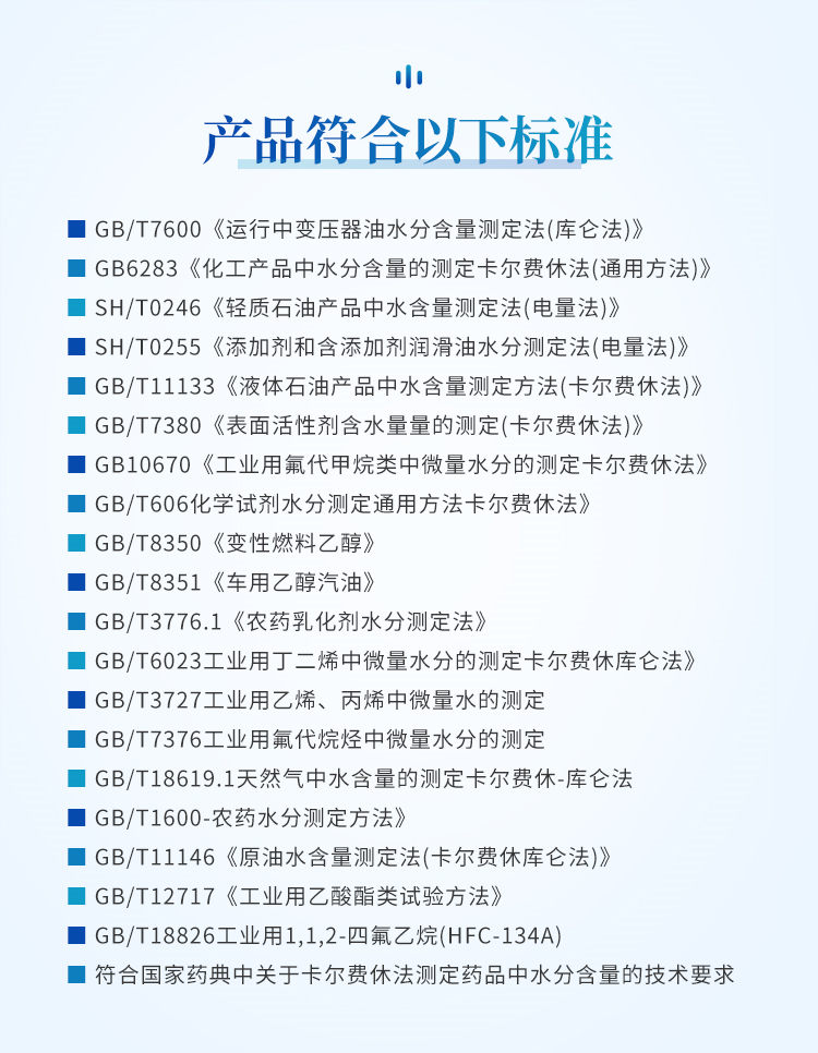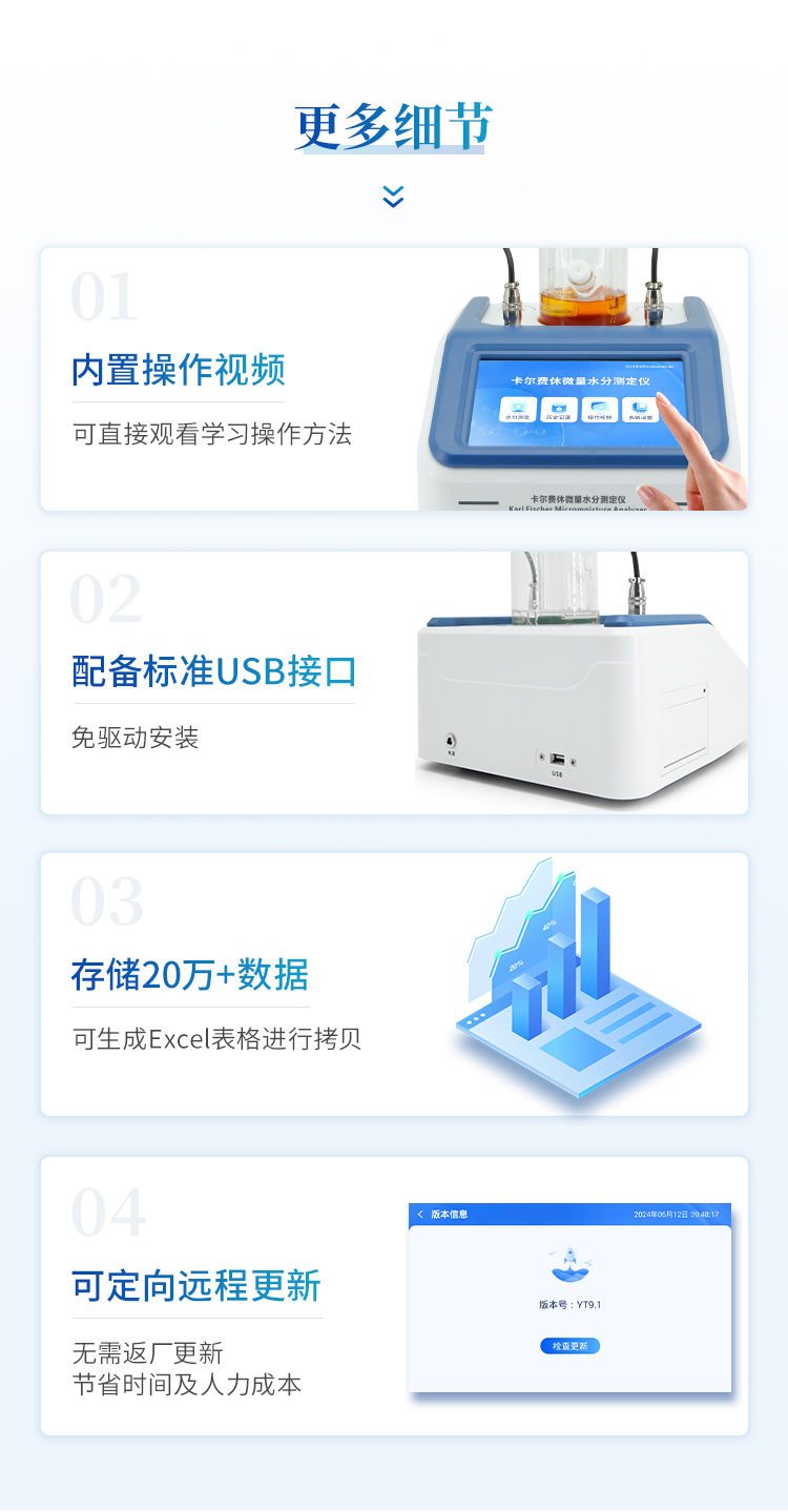 仪器特点: 1、仪器主控芯片采用ARM Cortex-A7,RK3288/4核处理器,主频1.88Ghz,运转速度更快速,稳定性更强。 2、显示方式:7英寸液晶触摸屏显示,人性化中文操作界面,读数直观、简单。 3、仪器采用全密封滴定池瓶,避免试剂与人接触,杜绝环境湿度对检测的影响;检测过程中仪器自动控制,搅拌、测定60秒左右完成,可直接显示测定结果,无需人员频繁操作。 4、仪器内置操作视频,可直接观看学习操作方法。 5、仪器可以测试多种样品,循环检测,即放即检。 6、仪器可对样品信息自由编辑,包括:样品名称、样品编号、检测单位、检测人员、联系方式、受检单位等。 7、仪器可对检测样品测定信息进行设置,例如:电解电流、电解电压、微量水分含量、测定时间、百分含量、进样体积、试样密度、毛重和皮重等。 8、水分检测方式可根据实际需求选择体积法或重量法。 9、内置热敏打印机,可直接打印检测结果,并可根据需求灵活设置打印内容(二维码,样品编号、检测单位、检测人员、联系电话、受检单位、检测日期等)。 10、样品检测结果可通过二维码扫码查看。 11、检测数据可通过历史记录进行检索,通过设置检测日期、样品编号、检测单位、检测人员、样品名称、受检单位等信息查找对应数据。 12、仪器配备标准USB接口,免驱动安装。检测结果存储容量20万条以上,可生成Excel表格进行拷贝。 13、仪器配备WiFi通信模块,可上传数据至云平台,实现电脑端数据查询、浏览、分析、统计等。 14、仪器可定向远程更新,进行升级维护,无需返厂更新,节省时间及人力成本,避免了物流运输导致设备损坏的潜在风险。 技术参数: 1、测量范围:0.01%至100% 2、灵 敏 阈:0.01ug 3、准 确 度:对于5μg-1mg为±2μg,对于1mg以上,为0.2%(不含进样误差) 4、重 复 性:≤2% 5、电解速度:2min 6、搅拌速度:1-10档(可调) 7、零点平衡时间:1min 8、仪器功率:36W 9、使用环境:温度5℃-40℃,湿度<85% 10、外形尺寸:235*270*130(mm) 11、使用电源:12V/3A 12、仪器重量:2kg 我厂产品符合以下标准: 1.GB/T7600《运行中变压器油水分含量测定法(库仑法)》 2.GB6283《化工产品中水分含量的测定卡尔费休法(通用方法)》 3.SH/T0246《轻质石油产品中水含量测定法(电量法)》 4.SH/T0255《添加剂和含添加剂润滑油水分测定法(电量法)》 5.GB/T11133《液体石油产品中水含量测定方法(卡尔费休法)》 6.GB/T7380《表面活性剂含水量量的测定(卡尔费休法)》 7.GB10670《工业用氟代甲烷类中微量水分的测定卡尔费休法》 8.GB/T606化学试剂水分测定通用方法卡尔费休法》 9.GB/T8350《变性燃料乙醇》 10.GB/T8351《车用乙醇汽油》 11.GB/T3776.1《农药乳化剂水分测定法》 12.GB/T6023工业用丁二烯中微量水分的测定卡尔费休库仑法》 13.GB/T3727工业用乙烯、丙烯中微量水的测定 14.GB/T7376工业用氟代烷烃中微量水分的测定 15.GB/T18619.1天然气中水含量的测定卡尔费休-库仑法 16.GB/T1600-农药水分测定方法》 17.GB/T11146《原油水含量测定法(卡尔费休库仑法)》 18.GB/T12717《工业用乙酸酯类试验方法》 19.GB/T18826工业用1,1,2-四氟乙烷(HFC-134a) 20、符合国家药典中关于卡尔费休法测定药品中水分含量的技术要求。