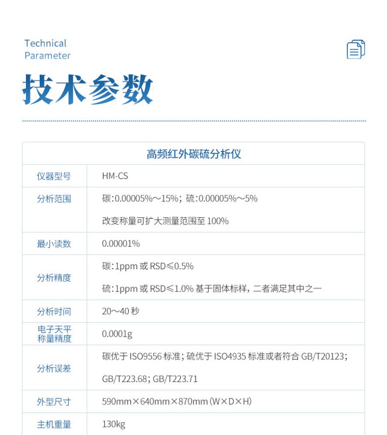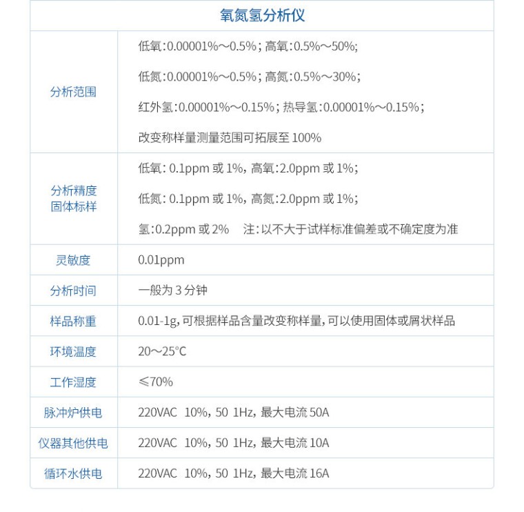 仪器描述及环境要求 1、仪器描述 金属和非金属固体材料中的氧氮氢是采用惰性气体熔融原理来检测,在进行氧氮氢的测定中,将称量后的试样放在石墨坩埚中,在氦气(单测氧可用氩气)气流中通过高温加热熔融。试样中的氧与石墨坩埚中的碳反应生成一氧化碳(CO),试样中的氮以氮气的形式逸出,这些混合气由氦气送到转化炉中,一氧化碳(CO)转化为二氧化碳(CO2),氮气不发生反应。通过转化炉后的混合气体被送到红外检测池中,在这里二氧化碳(CO2)(H2O)被检测。然后,通过红外检测后的混合气体中的二氧化碳(CO2)和水被吸附后,剩余的氮气和氦气混合气体通过热导检测池被检测。快速准确测定钢铁、铸铁、合金、铜、锆、钛、稀土材料和其他无机物中的氧、氮、氢含量。 2、环境要求 1、不要将仪器直接安装在窗户边或者门边,避免对流、灰尘、腐蚀性气体及振动。 2、请远离强电磁场干扰。 3、环境温度:20~25℃。 4、工作湿度:≤ 70%。 5、仪器应放置在平稳的工作台上,无振动,仪器附近应无强光直射及强烈电磁场干扰,环境中应无强烈腐蚀性气体。 6、脉冲炉供电:220VAC 10%,501Hz,最大电流 50A。 7、仪器其他供电:220VAC 10%,501Hz,最大电流 10A。 8、循环水供电:220VAC 10%,501Hz,最大电流 16A。 主要技术参数 1、氧氮氢分析仪为台式一体机。 2、分析范围 低氧:0.00001%~0.5%;高氧:0.5%~50%; 低氮:0.00001%~0.5%;高氮:0.5%~30%; 红外氢:0.00001%~0.15%;热导氢:0.00001%~0.15%; 改变称样量测量范围可拓展至 100%。 3、分析精度:分析精度(固体标样): 低氧: 0.1ppm 或 1% ,高氧:2.0ppm 或 1%; 低氮: 0.1ppm 或 1% ,高氮:2.0ppm 或 1%; 氢:0.2ppm 或 2% 注:以不大于试样标准偏差或不确定度为准。 4、灵敏度 :0.01ppm。 5、分析时间 :一般为 3 分钟。 6、样品称重:0.01-1g,可根据样品含量改变称样量,可以使用固体或屑状样品。 检测系统 1、氧分析采用非色散红外检测系统;氮分析采用高精度热导检测系统;氢分析采用非色散红外检测系统或者高精度热导检测系统。 2、一体化结构红外(氧、氢)分析池(需提供图纸)。 3、氧氮氢三个元素一次性出结果; 红外检测系统 1、标准配置氧、氢分析仪配备独立的红外吸收池,根据用户需求可灵活配置吸收池长度和通道数量(可配备双红外吸收池); 2、检测器:采用热释电固态红外检测器,以及高精度 A/D 采样卡,使整机有极高的检测灵敏度,可有效检测 ppm 级的氧含量; 3、电机:调制系统采用单片机控制的高精度步进电机,达到了调制频率的长期稳定; 4、光源:红外光源选用高效、长寿命的贵金属微型红外发光体及镀金金属反射镜; 5、恒温:整个气室进行恒温控制,保证分析气温度恒定,确保测量精度,采用了温度补偿型半导体检测器,保证仪器受外界影响很小,基线很稳。 高精检测系统 采用高灵敏度热导检测池,池电流连续可调,高精度放大器以及 24 位 A/D采样卡等硬件保证了从超低含量到大量程测定氮的含量。采用低漂移,高精度,大量程,高灵敏度热导检测器故障率低,可靠性强,稳定性好。采用高精度恒温控制系统,温度控制在 0.1℃内。参比气路采用稳定性良好的微流量控制。 脉冲炉 1、电流 0~1500A,功率:10KVA,最高温度高于 3500℃。 2、脉冲电极炉加热温度高,采用程序控制功率,可提供恒功率升温、斜率升温、分段升温等多种程序升温方式,提高分析精度。适合于从铝合金等低熔点材料到钨合金等高熔点材料的快速分析。电极适用多种型号坩埚,根据不同样品的释放情况,可选用包括套坩埚、高温坩埚在内的多种坩埚,有效降低用户使用成本。电极冷却系统采用单循环的独立冷却系统,可直接外接循环水或外水冷装置,具有冷却效果好而且可靠性高的特点。冷却循环水的温度在线实时检测并报警。 3、可自动吹氮气进行对炉膛进行吹扫再配合人工手动刷和除尘装置 保证了清洁工作的便捷、全面及高效;实现程序升温控制,具有高精度的温度控制。 4、电极脉冲炉支架采用整体铸造成型,轻量化设计,提高了机械强度,上下电极的同心度得以保证。(需提供设计图纸) 5、双轴导向一体化气缸(需提供设计图纸),保证了电极平稳升降,确保石墨坩埚和上电极的良好接触,同时保证了石墨坩埚的均匀受力,利于长时间高温加热。 气路 1、采用一体化的整机设计,空间开阔,气路系统连接路线大大减少,整机气路系统更加简洁可靠。气路部件包括电磁阀、气缸、气路管、气路接头全部采用元件,电磁阀寿命达百万次以上。特有的升降系统双轴导向气缸保证了电极平稳升降,确保石墨坩埚和上电极的良好接触,同时保证了石墨坩埚的均匀受力,利于长时间高温加热。带有气幕保护的自动落料炉头,自动空气吹扫机构,有效保障了对氧氮元素分析精度。炉头为分体结构,上下电极易拆卸,更换方便,而且下电极采用高温合金材料, 使用寿命长,使用成本低。(如采用整体炉头,更换电极, 需要专业技术人员操作,很麻烦). 2、进样系统设计上采用开放式,其优点为污染物从炉顶排出,不进入系统 ,操作方便,对系统密封要求不高. (采用封闭式,气路通过一个价格昂贵的六通阀来控制,内部脱出。(有的公司进样装置复杂,有两个汽缸,如样品卡住,需把汽缸打开,很难取出)。采用微流量传感器达到高精度流量控制,将分析气流变化对分析带来的影响降到了最低。气转换都通过此阀, 使得该阀易坏,灰尘等污染物也容易带入系统内部)。这