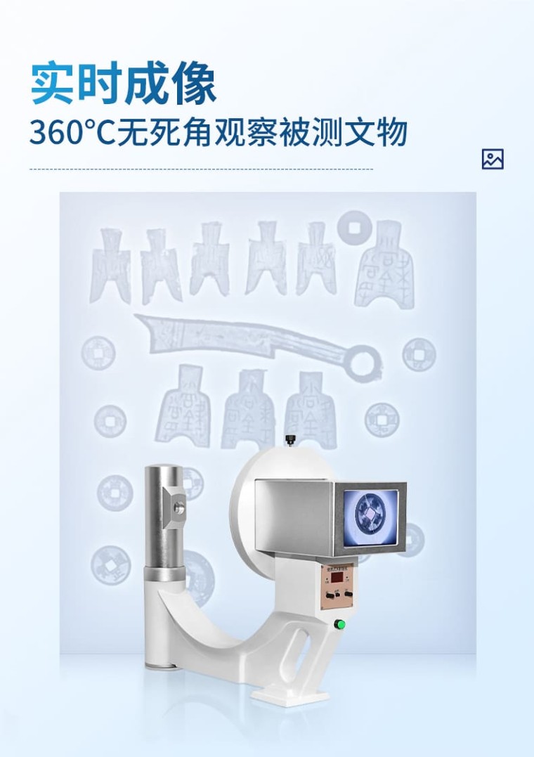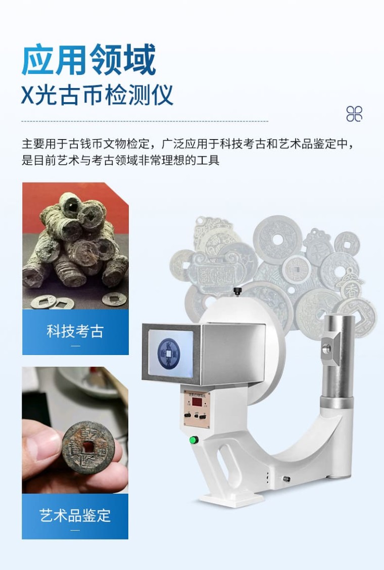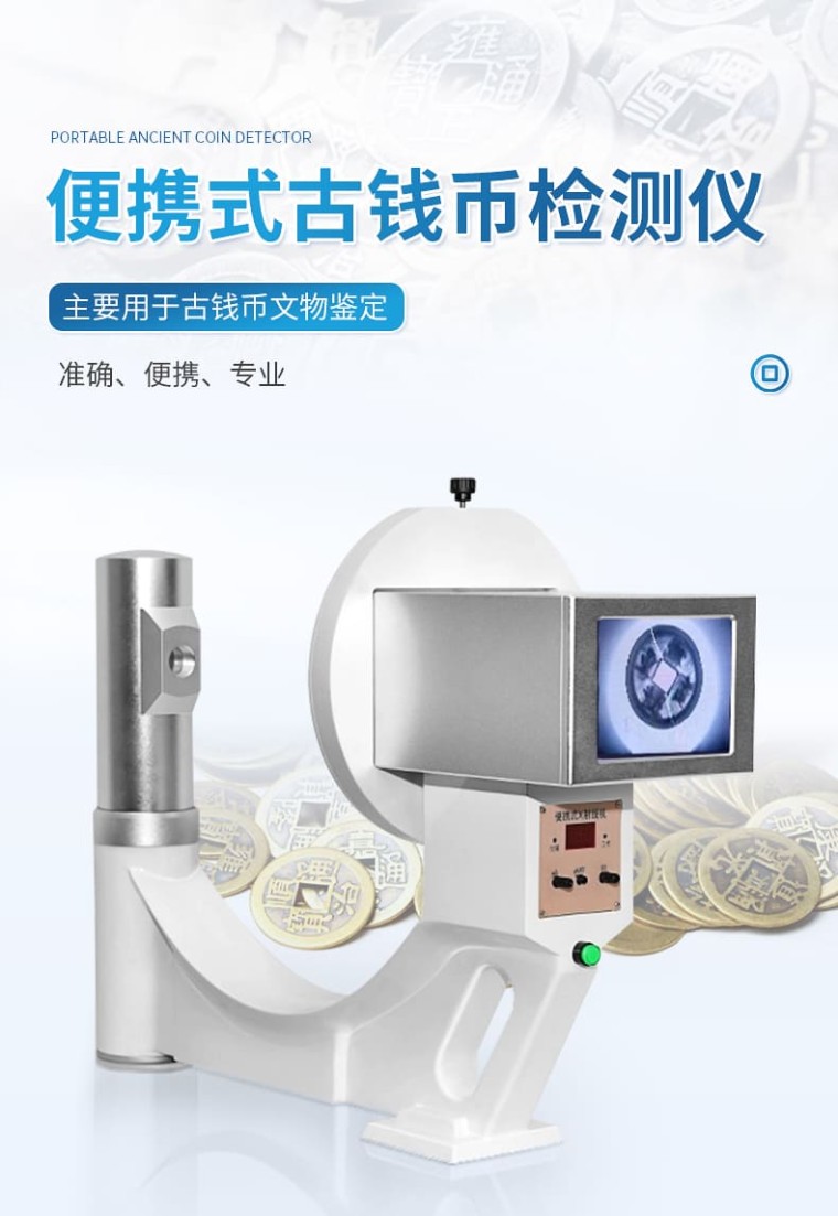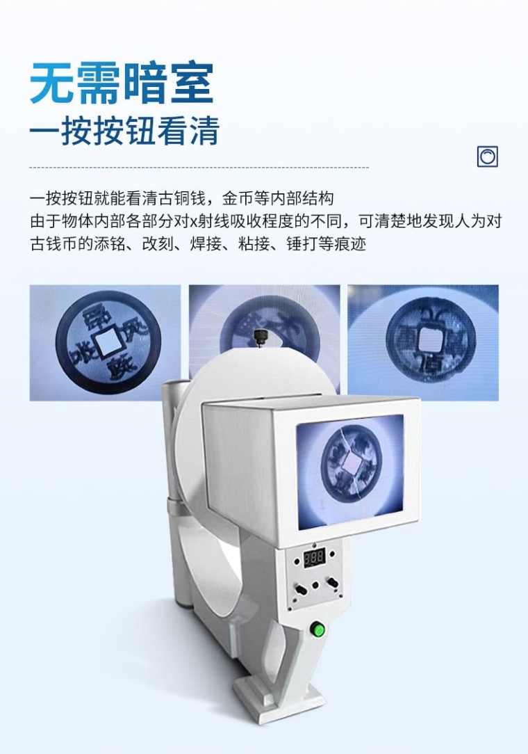 X光古币检测仪主要用于古钱币文物检定,广泛应用于科技考古和艺术品鉴定中,是目前艺术与考古领域非常理想的工具。它以其准确、便携、专业等特点,用在古钱币的修复和鉴定、检测的透视上,一按按钮就能看清古钱币内部的问题,受到古钱币鉴定从业人员的喜爱。 X光古币检测仪检视古钱币的画面是肉眼一般看不到的古钱币锈蚀层下的信息,是对古钱币的一种无损检测。由于古币中各部分金属密度的差异,通过x射线透视检测,它是一种波长很短的不可见电磁波辐射。当被检测的古钱币受到x光照射时,由于物体内部各部分对x射线吸收程度的不同,可清楚地发现人为对古钱币的添铭、改刻、焊接、粘接、锤打等痕迹,也可观察到古钱币是否有裂纹以及裂纹的长度、位置、形状和宽窄等。 一、优点: 1、该机重量轻,仅3.6公斤重,一个手就提得动,便于携带。 2、该机无需暗室,一按按钮就能看清古铜钱,金币等內部结构。 3、该机采用高科技的高增益低照度的工作原理,极大降低射线剂量,对使用者安全。 4、该机实时成像,可以360℃无死角的观察被测文物。 5、该机操作简单,无需培训,使用者上手就会。 6、该机对古钱币鉴定识别简单,通过透视图,就可以鉴定。 二、性能和参数: 输出图像尺寸: 100mmX76mm 观察厚度: ≤320mm 分辩率: >4LP/mm 输出屏光亮度: >40cd/mv2 X球管高压: 45—90KV X球管电流: 0.25—0.5mA X射线漏率: <5mr> 主机重量: 3.6kg 功耗 :200W 电源: 220V50Hz