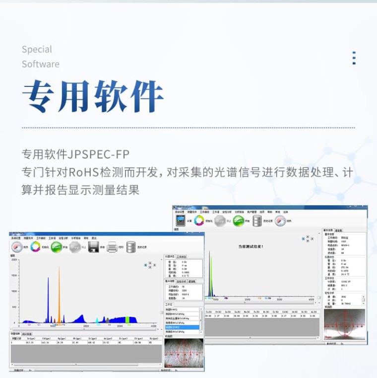 1.产品名称及机型指标介绍: 1.1. 产品名称及型号: RoHS检测仪---HM-350 型 1.2. 制造商:恒美智造 1.3. 仪器规格 仪器腔尺寸 439mmX300mmX150mm 仪器外观尺寸 550mmX410mmX320mm 仪器重量 45kg 1.4. 工作条件: ● 工作温度:15-30℃ ● 相对湿度:40%~50% ● 电 源:AC :220V ±5V 1.5. 技术性能及指标: 1.5.1. 元素分析范围从硫(S)到铀(U); 1.5.2. 元素含量分析范围为1 PPm到99.99%; 1.5.3. 测量时间:100-300秒; 1.5.4. RoHS指令规定的有害元素(限Cd/Pb/Cr/Hg/Br)其检测限度高达1PPM; 1.5.5. 能量分辨率为149±5电子伏特; 1.5.6. 温度适应范围为15℃至30℃; 1.5.7 电源:交流220V±5V;(建议配置交流净化稳压电源。) 1.6.产品特点 1.6.1 HM-350是专门针对RoHS、EN71等环保指令设计得一款产品。 1.6.2打破传统仪器直线的设计,采用流线体的整体化设计,仪器时尚大方。 1.6.3采用美国新型的Si-pin探测器,电致冷而非液氮制冷,体积小、数据分析准确且维护成本低。 1.6.4采用自主研发的SES信号处理系统,有效提高测量的灵敏度,让测量更精确。 1.6.5一键式自动测试,使用更简单,更方便,更人性化。 1.6.6七种光路校正准直系统,根据不同样品自动切换。 1.6.7多重防辐射泄露设计,辐射防护级别属于同类产品Highest。 1.6.8先进的一体化散热设计,使整机散热性能得到极大提高,保证了核心部件的运行安全。 1.6.9独有的机芯温控技术,保证X射线源的安全可靠运行,有效延长其使用寿命,降低使用成本。 1.6.10多重仪器配件保护系统,并可通过软件进行全程监控, 让仪器工作更稳定、更安全。 1.6.11RoHS专用测试软件,标准视窗设计,界面友好,操作方便。 1.6.12本机采用USB2.0接口,有效地保证了数据准确高速有效的传输。 2.仪器硬件部分主要配置 2.1Si-pin电制冷半导体探测器:(**型探测器) 2.1.1. Si-pin电制冷半导体探测器;分辨率:149±5电子伏特 2.1.2. 放大电路模块:对样品特征X射线进行探测;把探测采集的信息,进一步放大。 2.2 X射线激发装置: 2.2.1. 灯丝电流灯丝电流输出MAX:1mA; 2.2.2 .属于半损耗型部件,50W,空冷。 2.3 高压发射装置: 2.3.1. 电压电压输出MAX: 50KV; 2.3.2.电压输出MIN: 5KV,可控调节 2.3.3.自带电压过载保护 2.4 多道分析器: 2.4.1. 将采集的模拟信号转换成数字信号,并将处理结果提供给上位机软件。 2.4.2 .道数MAX:4096; 2.4.3 包含信号增强处理 2.5光路过滤模块 2.5.1 降低X射线光路发送过程中的干扰,保证探测器接收信号准确。 2.5.2 将准直器与滤光处整合; 2.6 准直器自动切换模块 2.6.1多达8种选择,口径分别为8#, 6#, 4#, 3#,2#, 1#, 0.5#,0.2#。 2.7 滤光片自动切换模块 2.7.1六种滤光片的自由选择和切换。 2.8 工作曲线自动选择模块 2.8.1 自动选择工作曲线,摒弃手动选择,避免人为操作失误,将自动化和智能化演绎得更**,使操作更人性,更方便。 3. 专用软件JPSPEC-FP 3.1.1软件简介 专门针对RoHS检测而开发,对采集的光谱信号进行数据处理、计算并报告显示测量结果。 3.1.2功能介绍 ※专门应对欧盟RoHS指令中六种物质涉及的六种元素 Cd, Pb, Hg, Br, Cr,Cl测试,测量时间为100-300秒 ※操作界面简洁直观,使用方便,无需专业人士操作 ※可自动选择适合的校准曲线,测量更方便,更准确。 ※中英文界面自动切换,并具有第三方语言订制功能 ※自动校准仪器。 ※自带样品材质定性分析,防止手动用户选择错误曲线 ※多种报告形式打印。 ※可同时显示多个光谱图 ※独有的机芯温度监控技术,保证X射线源的安全可靠运行,有效延长其使用寿命,降低使用成本。 4. 样品配置 标准样品用于制作工作曲线 4.1 样品腔 开放式大样品腔 4.2 标样 欧盟标样E60K 纯银样品 5. 产品保修及售后 5.1 对客户方操作人员免费进行培训。 5.2 安装、调试、验收、培训及技术服务均为免费在用户方现场对操作人员进行培训。 5.3正常使用,经本公司售后部技术人员确认属工艺或材质缺陷引起的故障,且未经拆修,仪器自验收合格之日起保修一年。 5.4 产品终身维修。(客户必须有填写详细、真实的有效购买凭证,发票和保修卡等) 5.5 免费提供软件升级; 5.6 提供***的技术服务,在接到用户故障信息后,2小时内响应,如有需要,48小时内派人上门维修和排除故障。