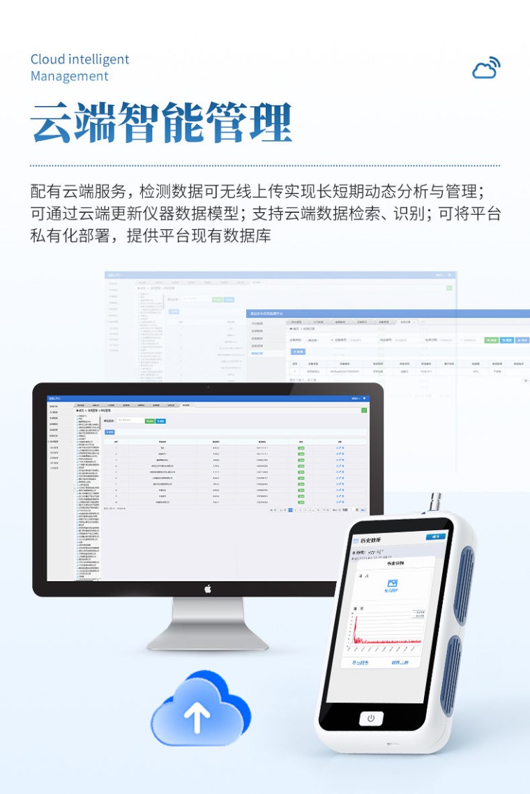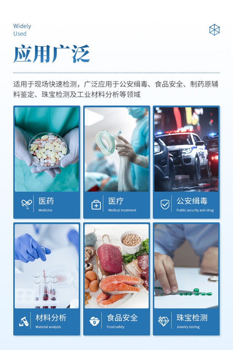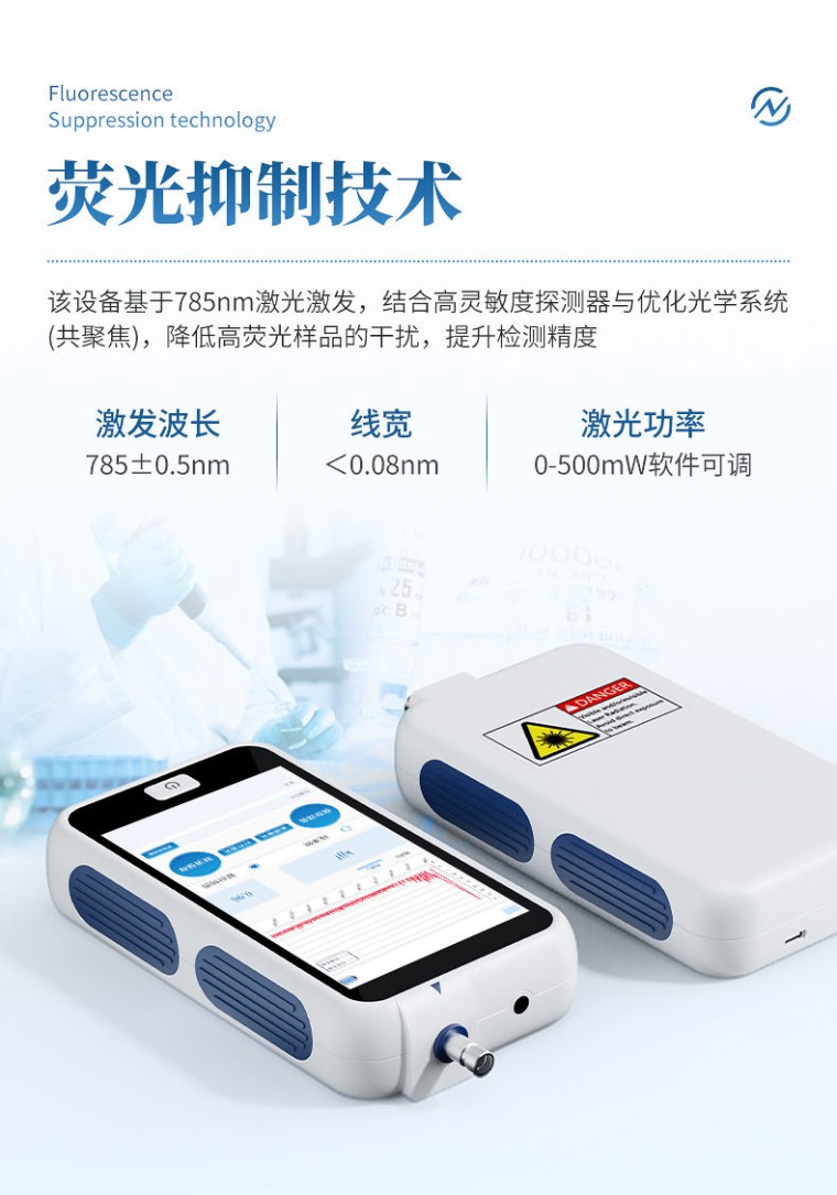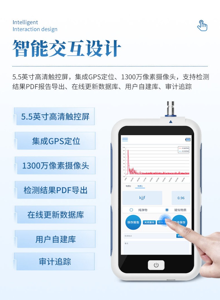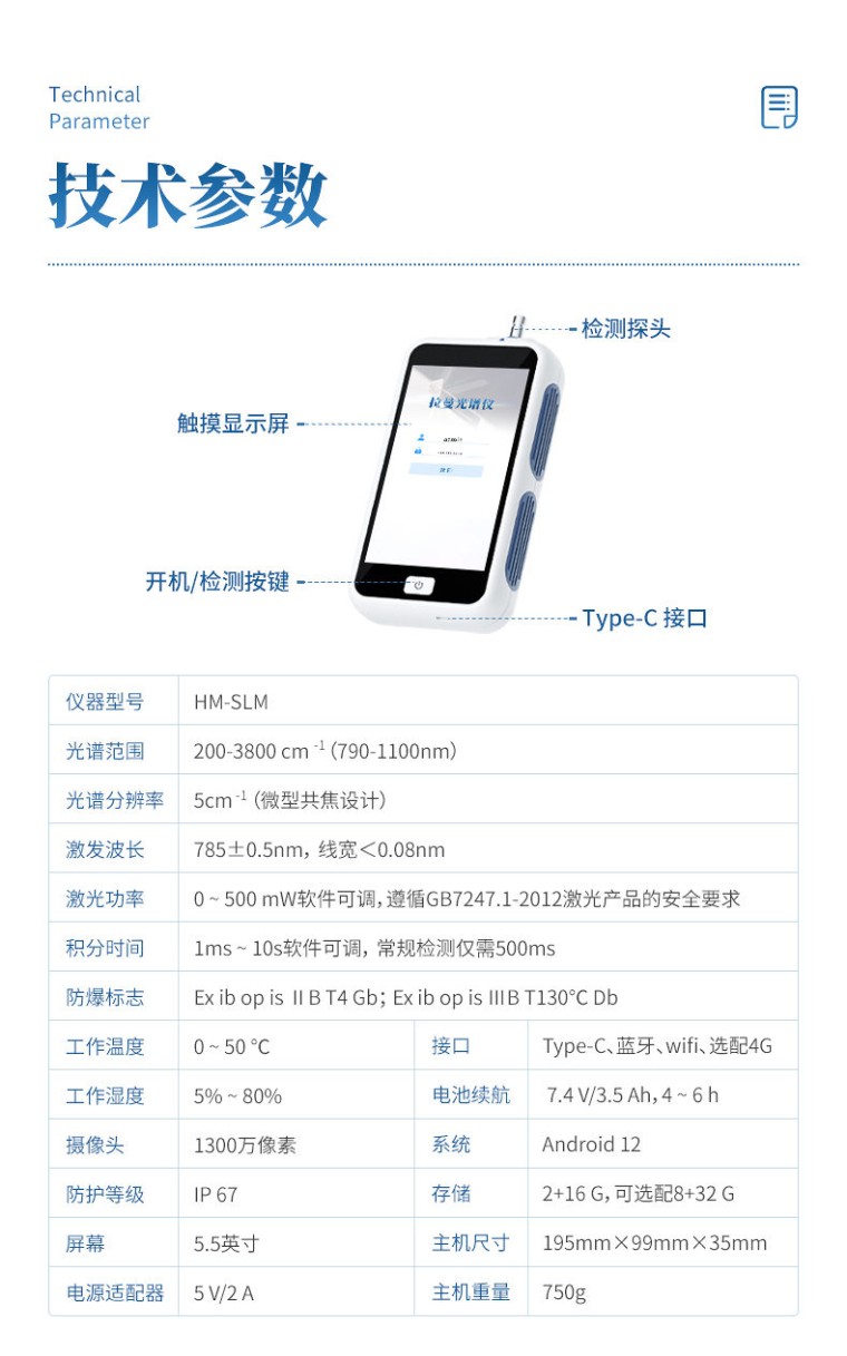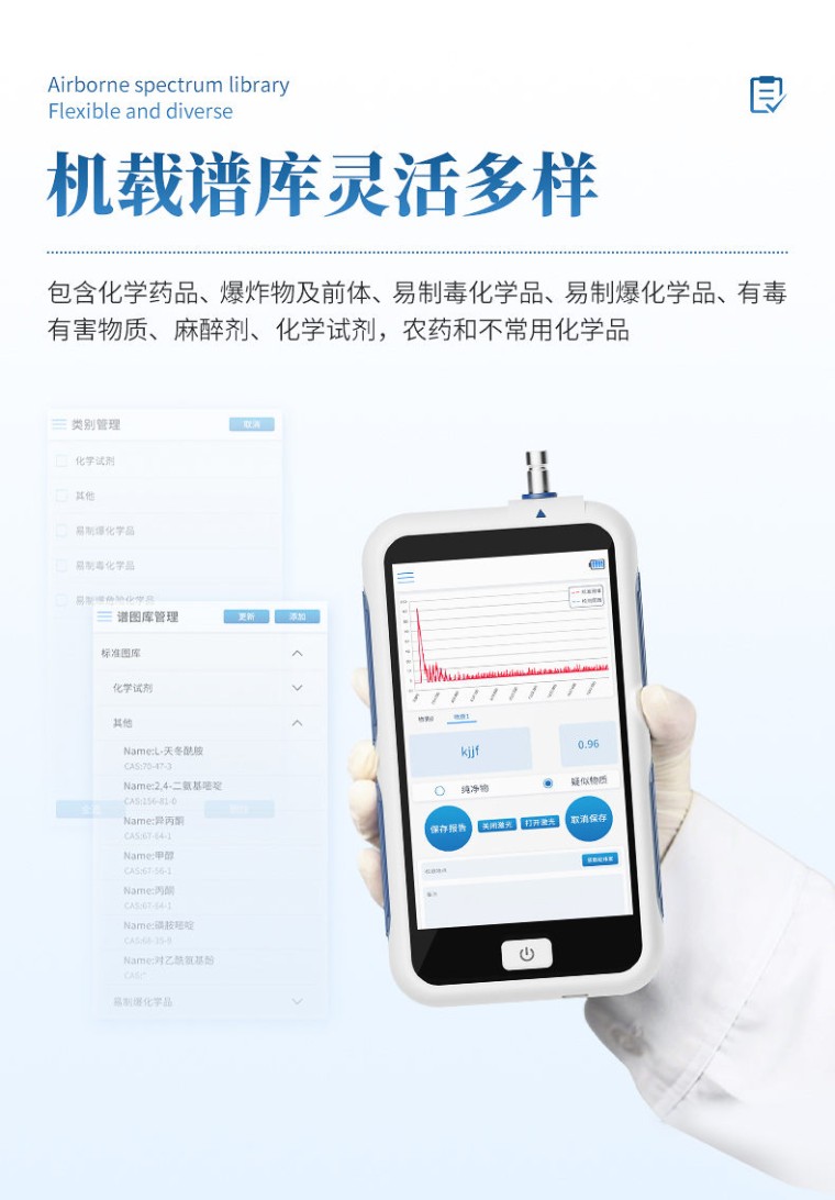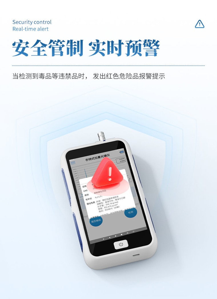 一、产品简介 手持拉曼光谱仪是一种便携式微型共焦拉曼光谱检测设备,基于拉曼散射原理,通过激光激发样品分子振动/转动能级跃迁,获取特征光谱信息,快速识别物质成分,专为快速、无损、高灵敏度的物质分析设计。 适用于现场快速检测,广泛应用于医药、公共安全、化学品检测、食品安全、珠宝检测及工业材料分析等多重领域和行业。 二、认证标准 通过CQC防爆认证 符合:GB/T 3836.1-2021《爆炸性环境 第 1 部分:设备 通用要求》 GB/T 3836.4-2021《爆炸性环境 第 4 部分:由本质安全型“i”保护的设备》 GB/T 3836.22-2023 《爆炸性环境 第 22 部分:光辐射设备和传输系统的保护措施》 三、核心特点 1、云端架构:配有云端服务,检测数据可无线上传实现长短期动态分析与管理;可通过云端更新仪器数据模型;支持云端数据检索、识别;可将平台私有化部署,提供平台现有数据库; 2、荧光抑制:该设备基于785 nm激光激发,结合高灵敏度探测器与优化光学系统 (共聚焦),降低高荧光样品的干扰,提升检测精度; 3、智能交互:高清触控屏,集成GPS定位、高清摄像头,支持检测结果PDF报告导出、在线更新数据库、用户自建库、审计追踪; 4、高效检测:一键式操作,3秒内完成光谱采集(500 ms积分时间),无需直接接触样品,可透过玻璃、塑封袋、饮料瓶等透明、半透明容器检测;支持疑似物分析及用户自建谱图库(内置标准谱图); 5、安全管制:当检测到毒品等违禁品时, 发出红色危险品报警提示; 6、机载谱库:灵活的机载谱库包含化学药品、爆炸物及前体、易制毒化学品、易制爆化学品、有毒有害物质、麻醉剂、化学试剂,农药和不常用化学品。支持搜索,可快速查找标准物质信息。 7、便携性:整机轻巧便捷,高防护等级防尘防水,适应实验室、户外、车间等复杂环境。 四、参数配置 1、光谱范围:200 ~ 3800 cm⁻¹(790 ~ 1100 nm) 2、光谱分辨率:5 cm⁻¹(微型共焦设计) 3、激发波长:785 ± 0.5 nm,线宽<0.08 nm 4、激光功率:0 ~ 500 mW软件可调,遵循GB7247.1-2012激光产品的安全要求 5、积分时间:1 ms ~ 10 s软件可调,常规检测仅需500 ms 6、工作温度:0 ~ 50 ℃ 7、工作湿度:5% ~ 80% 8、摄像头:1300万像素 9、防护等级:IP 67 10. ★防爆标志: Ex ib op is ⅡB T4 Gb;Ex ib op is ⅢB T130℃ Db 11、屏幕:5.5英寸 12、电源适配器:5 V/2 A 13、接口:Type-C、蓝牙、wifi、选配4G 14、电池续航: 7.4 V/3.5 Ah,4 ~ 6 h 15、系统:Android 12 16、存储:2+16 G,可选配8+32 G 17、主机尺寸:195 mm×99 mm×35 mm 18、主机重量:750 g 五、常见故障与解决方法 1、使用探头帽测量玻璃包装样品时荧光强,信号弱? 答:可能是玻璃壁较厚,玻璃的荧光信号强,可更换石英容器进行测量。 2、样品无法匹配谱库 答:(1)激光强度设置过低,一般检测设置80。 (2)检测阈值设置过高,应在0.92最合适。 (3)检查检索范围,是否勾选。 (4)谱图库中无匹配样品,将新测试的样品录入库中即可解决 3、无法开机? 答:电源耗光,充电。 4、偶尔图谱不正常? 答:电磁噪声干扰,远离电磁干扰影响严重的地方(还有可能是宇宙射线等干扰,好多文献上有这个词,不好验证) 5、检测速度慢? 答:(1)积分时间过长; (2)是否开启了云端检测大约15秒。 6、识别错误 答:待测样品与库里面的图谱相似度极高,将新测试的样品录入库中即可解决