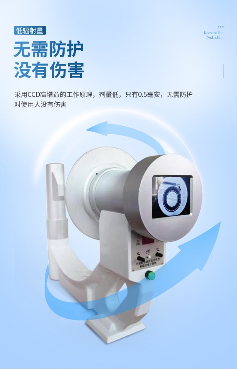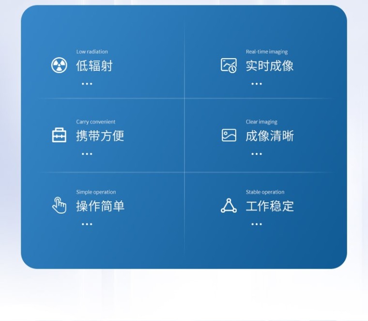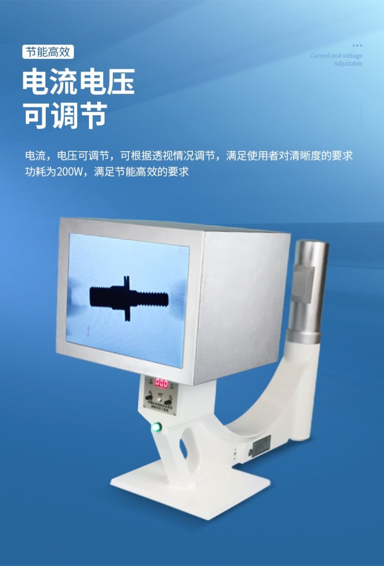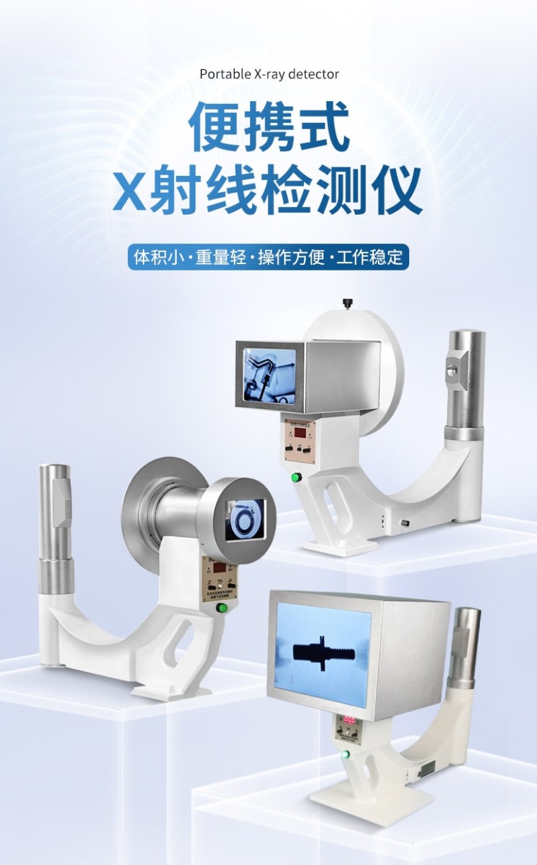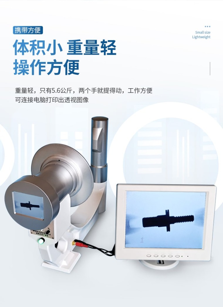 便携式X光机广泛应用于工业产品、电子元器件的内部检测,实验、科研、教学、工程、考古、鉴别等活动,宠物医院、兽医医院、饲养场、动物园,野外作业、抢险救灾、地震救援等现场处置,名贵中草药异物检测,治安反、反恐领域的安检等,是进行无损检测的最理想设备。它具有体积小、重量轻、操作方便、工作稳定等特点,特别适应各种室外作业并与发电机组配合作业。 主要优点: 该机采用CCD高增益的工作原理,剂量低,只有0.5毫安,无需防护,对使用人没有伤害。 该机重量轻,只有5.6公斤,两个手就提得动,工作方便。可连接电脑打印出透视图像。 该机工作无需暗室,明室就可使用。 该机实时成像,一按按钮就可以看到所需透视的工件内部情况。 该机电流,电压可调节,可根据透视情况调节,满足使用者对清晰度的要求。 该机可药水消毒,用在无菌环境。。 该机供电为国标市电,可用于任何场合。 该机功率为200W,满足节能高效的要求。 该机成像清晰,是大型X光机成像的八成清,普通成像足够使用。 该机操作简单,使用人看一遍就会使用。 该机质量可靠,维修售后有保障,解决了使用者的后顾之忧。 使用中注意事项: 设备在开始使用之前,要先插电源和主机间的插头,然后再插网电电源插头,结束时要反过来,须先拔掉网电源插头,再拔电源和主机间的插头:特别注意,在电源盒接通网电源的时候,不可按住主机上的按钮开关,否则可能会使仪器造成严重损坏。 设备在不使用时,须放在铝箱中,如果暂时不用,须横放在桌上以免损坏,只要不在照射时,遮光罩须盖上,平时铝箱存放时要避免摔倒,以免损坏仪器。 机器应定时进行清洁保养,如接触动物血液后须马上擦洗,可用酒精拧稍干后擦洗,擦洗时不使水形成水滴以防止水渗入机器内部。 平时要注意不要让异物如水、石膏、酒精、血等进入电源开关,按钮或电源插头,以防止出现电路故障,从而影响使用。 如果在使用过程中发现铝箱中有油迹,可能说明球管已经漏油,应马上停止使用并请立即联系生产商。 本机使用时电源插座须使用接地良好的三芯插座,否则易出现高压静电情况并且有可以导致元器件的损坏为延长机器使用寿命,使用本机时请避免连续开机过长,中间须间隔至少5秒以上,以辟免前次的高压在关机后未完全那退完与后一次高压积累,成瞬间高压,击穿X射线球管,造成人为机器故障。 对射线敏感者不得使用,对眼睛和生殖器部位,幼儿慎用。 机器结构较为紧密,又涉及高压,不允许用户自行拆卸,如用户发现诸如显示器不亮,指示灯不亮,显示器发暗等情况请立即停止使用并及时与生产厂家取得联系。以免引起故障。 如果使用中发现图象出现月型缺损,一般情况下说明射线部分已经发生位置偏移,这将可能导致出现漏射线超标的情况发生,立刻停止使用,马上与生产商联系。