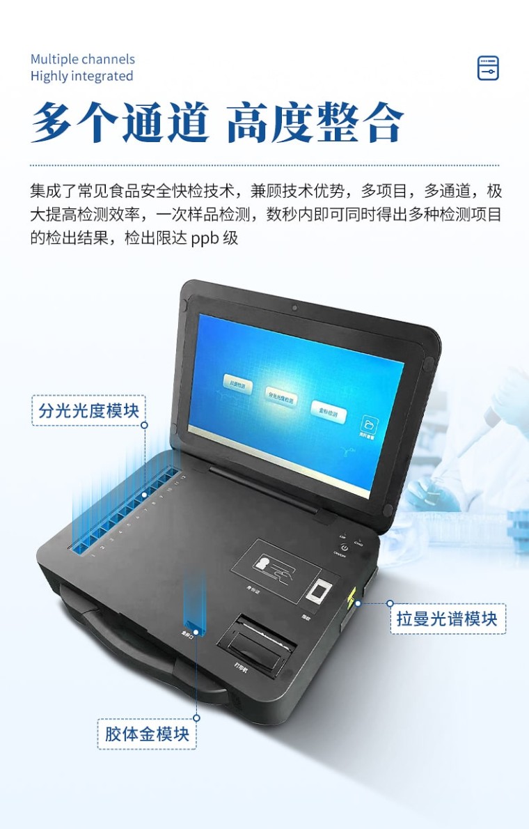 可快速准确的检测出日常食物中的非法添加,化学添加和掺杂物质,该仪器基于激光拉曼指纹光谱分析技术和网络数据核查技术,结合增强试剂和前处理设备,可以在几分钟快速实现食品安全的快速检测。专门为现场执法、快筛检测而设计,易于上手,操作简单。结合增强试剂和前处理设备,可以在几分钟快速实现食品安全的快速检测。 食品安全被视为一个世界性的难题,事关国计民生。近年来,三聚氰胺、苏丹红、瘦肉精和地沟油等食品安全问题频发,严重影响了我国食品业的发展。常规的实验室食品安全检测方法由于数量少、成本高、检测周期长,无法满足现场快速检测的需求,发展快速、准确的非法添加物检测技术已成为当前的热点研究方向。拉曼光谱法作为一种快速、无损、安全的检测技术,具有快速正确、重现性好、样品前处理简单、紧凑便携、适用广泛等特点,结合专用的表面拉曼增强试剂和简易的样品前处理设备,能够简单、精准、高效地检测食品中的非法/滥用添加剂、农药/兽药残留、掺假有害物、有毒化学品等项目的检测。 检测项目: 农药残留(噻菌灵、多菌灵、敌草快、苯醚甲环唑、甲基硫菌灵等)、兽药残留(孔雀石绿及其代谢物,结晶紫,恩诺沙星,环丙沙星,恶喹酸,呋喃唑酮等)、添加剂(硫氰酸钠,苯甲酸,山梨酸,咖啡因等),三聚氰胺,西布qu明,西地na非等200多种残留及添加剂检测项目,并可根据客户需要定制项目。 特点列表: ◆ 高稳定性,光谱响应稳定性<2%@2hrs; ◆ 高分辨率,分辨率**可达4cm-1; ◆ 配置功能强大的Uspectral Plus和FOODSAFE两款光谱仪分析软件,具备丰富的数据处理能力; ◆ 内置现场打印报告功能,现场查验,携带方便; ◆ 配置大屏显示,可显示操作步骤,方便外出使用; ◆ 可适配光谱范围在200cm-1~3000cm-1。 技术参数: 尺寸:479×387×155mm 重量:11kg 光谱范围:200-3000cm-1 光谱分辨率:<6cm-1 光谱频移示值误差:<1cm-1 激发波长和线宽:785±0.5nm,线宽≤0.08nm 激光器使用寿命:10,000.00hrs 输出功率:0-500mW( <500mw, 可调) 积分时间:1ms-65s 电池:可充电锂电池,续航时间>5 小时 数据传输:USB2.0 软件功能: 软件有六个模块,数据检测、数据分析、用户管理、软件设置、舆情搜索和限量比较,数据检测模块包括样本的检测和检测记录的查询;数据分析模块包括管理员的建库和谱库查询修改;用户管理模块包括本机用户的新增以及用户账号信息修改;软件设置包括光谱仪和激光器等参数设置;舆情查看模块能搜索食品安全相关热点新闻,软件会向智检E+云平台发起数据请求,获取云平台中的搜索到的新闻信息;限量比较模块会从智检E+云平台获取不同地区的物质限量标准值。