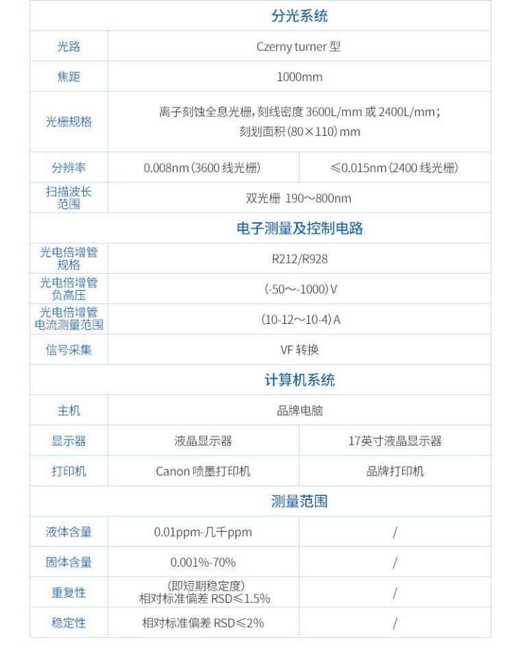 HM-ICP1(石化)单道扫描电感耦合等离子体发射光谱仪是针对石化行业的测试要求,倾力打造的一款专用型的化学分析仪器。主要用来测定各类油品及其相关产品中元素检测的含量。 仪器创新性地采用了油品直接进样技术,半导体制冷的超低温雾室,配合氧气辅助进样,消除了有机样品积碳严重的现象,仪器的适用性大大提升。 性能特点: 1、高精度的气流控制系统 仪器工作中的等离子气、辅助气、载气、氧气全部采用高精度的质量流量控制器(MFC)来控制,具有流量连续可调、输出气流的精度高,保证了测试数据的准确性。 2、精度*的恒温系统 仪器整体光路采用精密恒温系统保护,温度的控制可根据客户实验室实际环境温度实时设定,无需长时间不间断的开可调,控温精度≤±0.1℃,精密的恒温系统保证了光路的稳定性,测试数据更稳定。 3、仪器自动化程度高 仪器的自动化程度*,除了电源开关外,所有操作均由软件完成。智能化的软件,可实时对各项操作进行实时反馈及信息提示。 4、全自动点火及匹配技术 软件可全自动一键点火,所有的参数设置变化,均自动完成。配合先进的自动匹配技术,点火成功率高,操作简便。 5、智能化的火焰监视功能 仪器配置了灵敏度*的光纤传感器,可在仪器工作状态下,实时监测火焰的工作情况,如遇异常熄火情况,可自动关闭仪器。 6、安全可靠的固态射频电源 仪器采用的射频电源,具有体积小、输出效率高、输出功率稳定,带有水路、气路及过载等各类安全保护功能,大大提升仪器的安全性,减小了仪器的故障率。 7、蠕动泵进样装置 仪器配置了四通道十二滚轴的高精度蠕动泵,可同时保证进样的精度和防止积液,蠕动泵的转速连续可调,满足客户的多种测试要求。 8、性能优异的专用进样装置 针对油品挥发性较强的特性,配置了自主研发的制冷系统,把样品冷却至-20℃进样,保证了样品的稳定性,增加了雾化效率,测试结果更加稳定、精准。 9、超高分辨率的光路系统 仪器配置了超高分辨率的4320刻线的进口光栅,配合*的光路调节技术,把普通仪器的分辨率约0.008nm降低至0.005nm以内,较高的分辨率保证了测试元素之间没有相互干扰。 10、观测位置自动调节 仪器采用二维的移动平台设计,可通过软件实时调节炬管的位置,通过反馈的信号值找到正确的观测位置,以获取较好的灵敏度,得出准确的测试效果。 11、灵敏度*的检测器 仪器配置了高灵敏度进口光电倍增管(PMT)作为检测器,可针对不同的待测元素自动设置测试参数,以达到理想的检测状态,给出准确的测试结果。无需制冷,无需吹扫,使用寿命长。 12、超低的使用成本 仪器非工作状态下仪器电源、冷却水箱、气体全部关闭,不产生任何费用,仪器工作即开即用,无需长时间的光路预热。使用氩气纯度为99.99%即可,无需99.999%的高纯氩,成本节约至少三分之一。 产品规格与技术指标: 1、固态电源: 工作频率: 27.12MHz 频率稳定性:<0.05% 匹配方式: 自动匹配 输出功率: 800W ~1600W,连续可调,电源效率大于 65% 输出功率稳定性:≤0.05% 输出工作线圈内径 25mm、3 匝,配三同心外径 20mm 的石英炬管 同轴型喷雾器外径 6mm,旋流型雾化室 有机样品直接进样系统,制冷温度可达-20℃。 2、扫描分光器: 光路:Czerny turner 型 焦距:1000mm 光栅规格:离子刻蚀全息光栅,刻线密度 3600 L/mm 或 2400 L/mm;刻划面积(80 ×110)mm 分辨率: ≤0.015nm(2400 线光栅) 扫描波长范围:2400 线光栅:(190~800) nm 3、电子测量及控制电路: 光电倍增管规格:R212/R928 光电倍增管负高压:(-50~-1000)V 光电倍增管电流测量范围:(10-12~10-4)A 信号采集:VF 转换 4、计算机系统: 主机:品牌电脑 显示器:17 英寸液晶显示器 打印机:品牌打印机 仪器优势: ● 测试元素多,最多可测 70 余种元素。 ● 多元素同时测试,一次进样所有元素同时测试。 ● 分析速度快,每分钟约 5 个元素,最快测试速度可到每分钟 10 个元素。 ● 检出限低,绝大多数元素可达 ppb 级。 ● 线性范围宽,可达 5-6 个数量级,可以实现高低含量同时测试,无需更换标 准曲线。 ● 油类样品无需消解,简单处理后即可直接上机测试。 应用领域: 可实现汽油、柴油直接进样测定,无需复杂的消解操作,可测定硅、磷、铁、 锰、铅等元素。 可测定润滑油及其添加剂中二十余种磨损元素的含量,只需简单稀释即可上 机测试。 可选配高盐雾化器,直接测定使用后的润滑油中磨损元素的含量。 可测定原油及其附属产品中的三十余种元素含量。 甲醇及乙醇等石化原料产品中元素含量。 车用尿素中钠、钾、钙、镁、铝、铁、镍、铜、锌、铬等元素。 油田示踪剂中稀土元素的测定。
