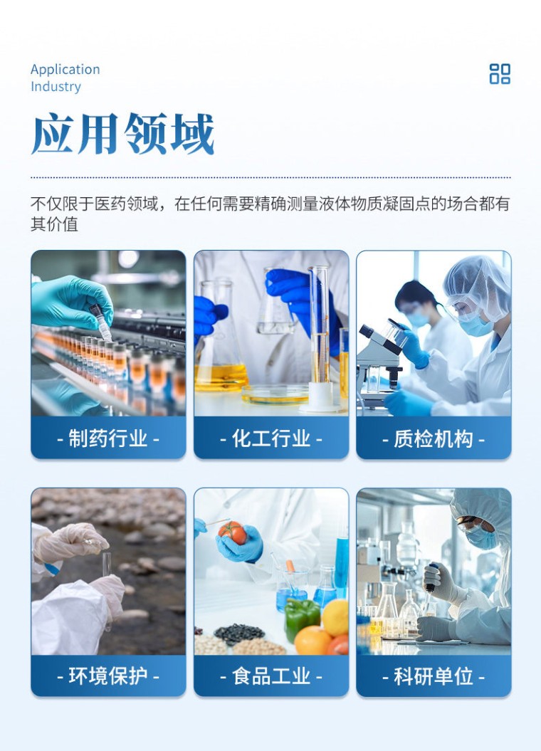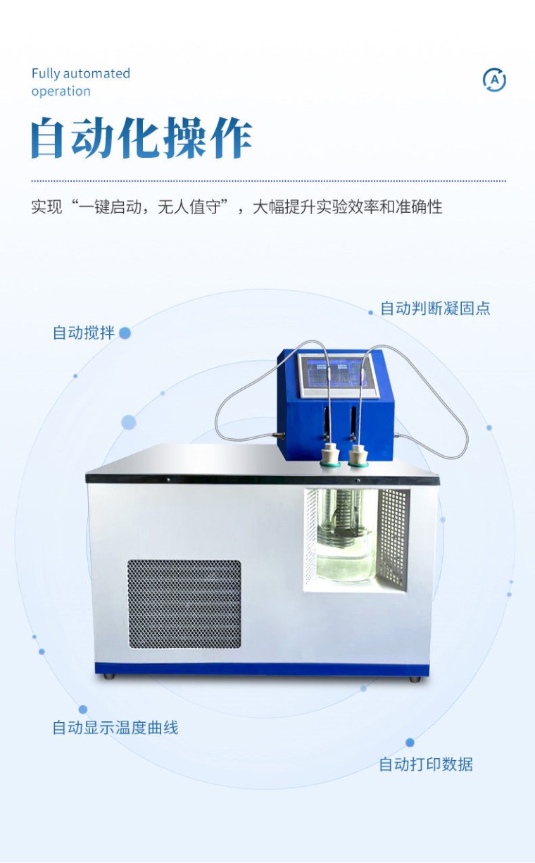 本仪器按《中华人民共和国药典》2020年版四部 通则 0613凝点测定法设计制造,测定药物由液体凝结为固体时候,在短时间内停留不变的最高温度。某些药品具有一定的凝点、纯度变更,凝点亦随之改变。测定凝点可以区别或检查药品的纯杂程度。 一、主要技术特点 1、型号规格: HM-YNQ1 2、控温范围: - 20℃~90度 3、控温方式: 数显PID温控仪 4、控温精度: ±0.1℃ 5、加热方式: 不锈钢电热管加热 6、制冷方式: 进口压缩机制冷 7、观察方式: 双层保温杜瓦瓶透明观察 8、工作方式: 双孔 9、试样搅拌方式:自动机械搅拌 10、制冷控制: 进口磁力泵 11、加热功率: 800W 12、制冷功率: 500W 13、整机功率: 1400W 14、工作电源: AC220V±10% 50HZ 15、工作环境: 相对湿度:〈80% 二、主要技术参数及指标 1、本仪器成套分为两部分,左边部分为冷浴做样部分,右边为加热做样部分。做样系统为左右式的整体结构,仪器下部为电路控制部分,操作简单、方便。 2、仪器采用数显PID温控仪控温,控温精度可达±0.1℃,其温度显示直观,读数准确,还可调整因温度传感器老化产生的误差。因控温精度的要求传感器采用Pt100,感温灵敏分辨率高,抗干扰强、控温精度高。 3、本仪器的冷浴是采用双层真空保温瓶,能很好的透明观察试样,保温性能良好。 4、本仪器搅拌方式采用自动机械搅拌。 5、不需循环冷却水,采用风机风冷,接通电源即可制冷。 6、仪器采用铜管做成冷室,恒温冷却循环浴,高能效的制冷器也可兼做其它循环冷却用。 7、本仪器采用优质钢板成型加工,表面采用静电喷涂工艺、坚固耐用,抗腐蚀性强。 8 、本仪器使用和维修均很方便。