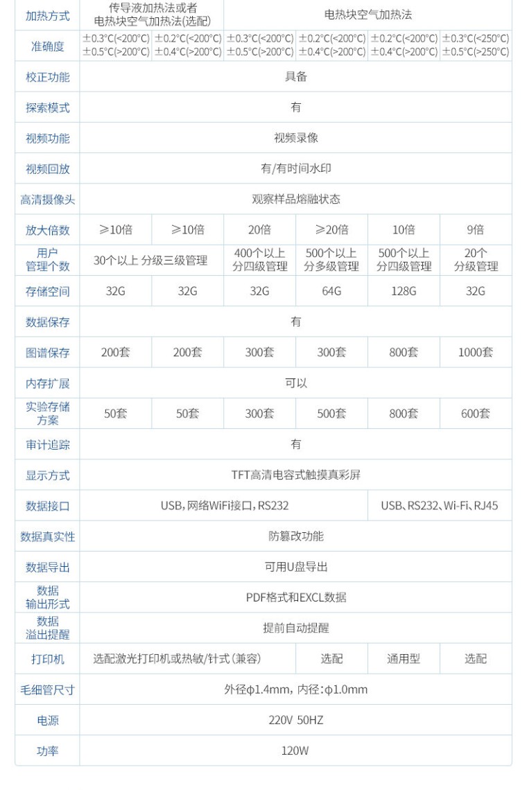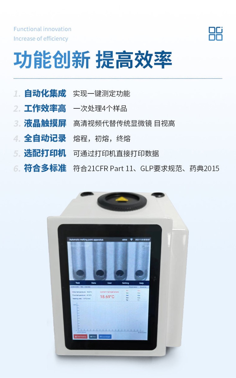 全自动视频熔点沸点浊点滑点仪结合高精度控温技术和高清视频摄像技术,不但为用户提供准确、稳定、可靠的测试结果,还为用户带来高效便捷的测试感受。高清视频可方便清晰的看到样品熔化沸腾的全过程,自动检测实时图谱显示,方便用户准确测得样品熔点、沸点、浊点、滑点。 使用领域: 熔点仪在化学工业、医药研究中据有重要地位,是生产食品、药物、香料、染料及其他有机晶体物 质的必备仪器。 提高效率创新点: 1:高清视频代替传统显微镜 目视; 2:一次处理4个样品(3小1大孔); 3:高自动化集成,实现一键测定功能; 4:全自动记录熔程,初熔,终熔; 5: 熔点、沸点、浊点、滑点; 6: 配备高清摄像镜头模块。 主要技术指标: 温度范围:室温-420℃ 测试模式:熔点、沸点、浊点、滑点 检测方式:全自动(兼容手动) 处理能力:4个/批(同时可以做四个样) 温度分辨率:0.1℃ 升温速率:0.1℃--20℃ (200档 无极可调) 控温方式:PID精确控温 炉体全密闭设计 准确度:±0.3℃(<250℃) ±0.5℃(>250℃) 重复性:0.1℃/Min时熔点重复性±0.1℃ 探索模式:有 视频功能:拍照 摄像 视频回放:有 放大倍数:9 用户管理个数:20个 分级管理 存储空间:32G(高配极速) 数据保存:1000 图谱保存:1000套 实验方案:600套 显示方式:TFT高清真彩屏 数据接口:USB RS232 Wi-Fi、RJ45 毛细管尺寸: 外径φ1.4mm,内径:φ1.0mm 电源:220V 50HZ 功率:120W