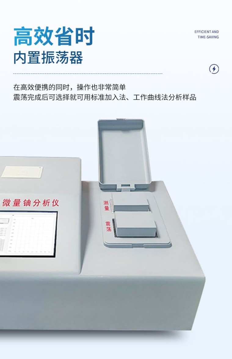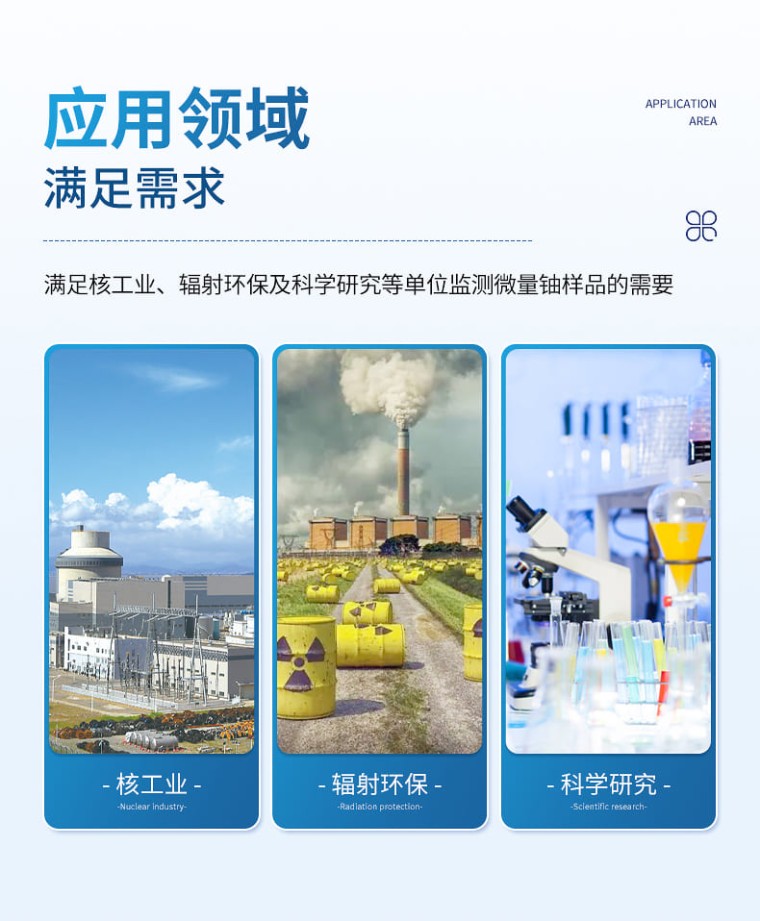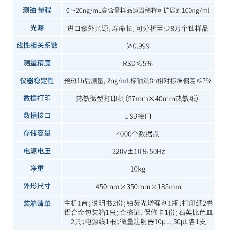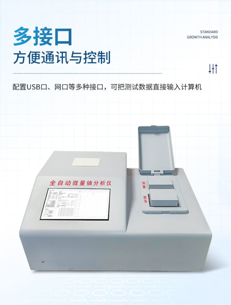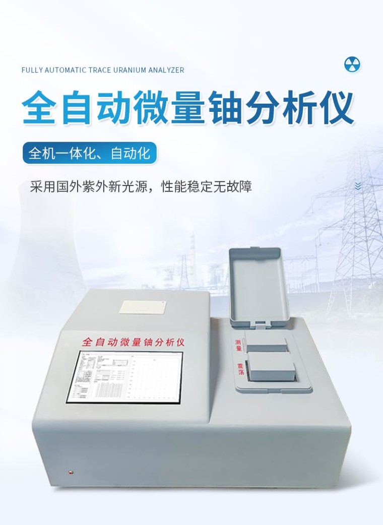 一、概述 为了满足核工业、辐射环保及科学研究等单位监测微量铀样品的需要,我公司**研制成功全自动微量铀分析仪。仪器设计采用国外**公司生产的紫外新光源,该光源的主要特点是性能稳定无故障;所用的脉冲光管寿命≥5 年,如用标准加入法能分析8万个样品。电路设计采用新型的单片机,测试时的所有操作只要按中文提示轻轻点击液晶触摸屏上的对应选项,设备内置震荡功能,避免了外部使用振荡器的问题,全机一体化、自动化。震荡完成后可选择就可用标准加入法、工作曲线法分析样品。并由单片机自动作出回归曲线,线性回归方程式,直接进行数据处理,液晶屏显示及打印机打印能同时给出样品测试的最终结果。该仪器设有以太网100Base-T4网口。可把测试数据直接输入计算机,是同类仪器的升级换代产品。 二、仪器主要技术指标 2.1仪器特点: 1、高效省时 内置振荡器,在高效便携的同时,操作也非常简单。 2、自适应 根据样品含量高低自动选择合理的测量范围。 3、多接口 配置USB口、网口等多种接口,方便通讯与控制。 4、全自动 7寸彩屏显示,测量完成后直接出结果,自带热敏打印机,直接出测量报告。 5、产品寿命长 进口紫外光源,寿命长,可分析至少8万个铀样品 2.2主要参数: 1、测量对象: 直接测量液体样品,对于固体样品只要稍加处理转化为液体后也可快速测定。 2、检测下限: ≤0.01ng/mL(以标准偏差的三倍定义) 3、测铀 量程: 0 ~20ng/mL高含量样品适当稀释可扩展到100ng/ml 4、线性相关系数: ≥0.999 5、测量精度: RSD≤5% 6、仪器稳定性: 预热 1h 后测量,2ng/mL标铀测8h相对标准偏差≤7% 7、数据打印: 热敏微型打印机(57mm×40mm热敏纸) 8、数据接口: USB接口 9、存储容量: 4000个数据点 10、电源电压: 220v 土 10% 50Hz 11、净重: 10kg 12、外形尺寸: 450×350× 185 mm