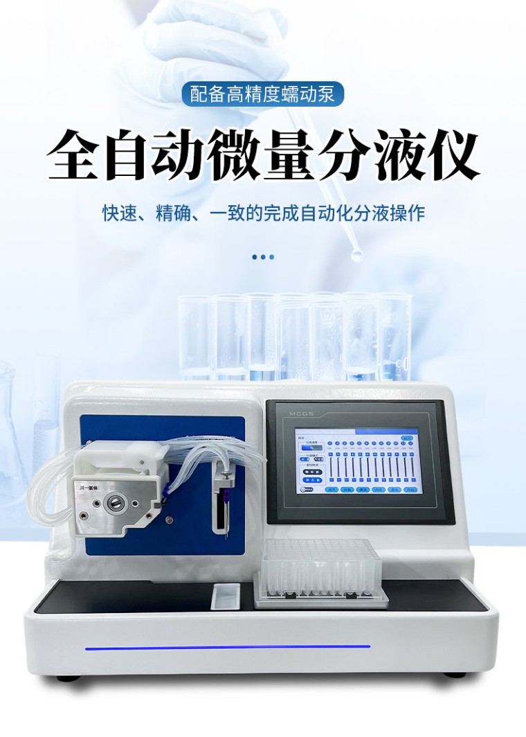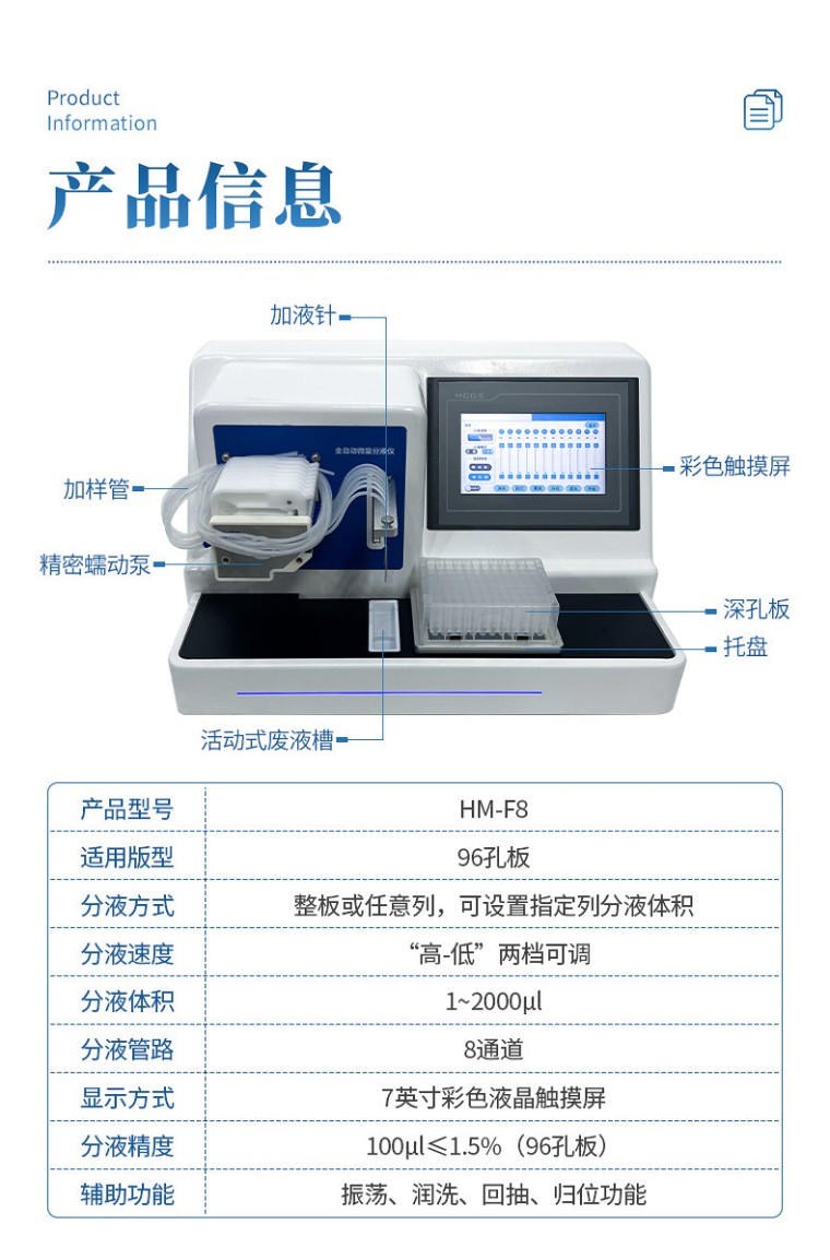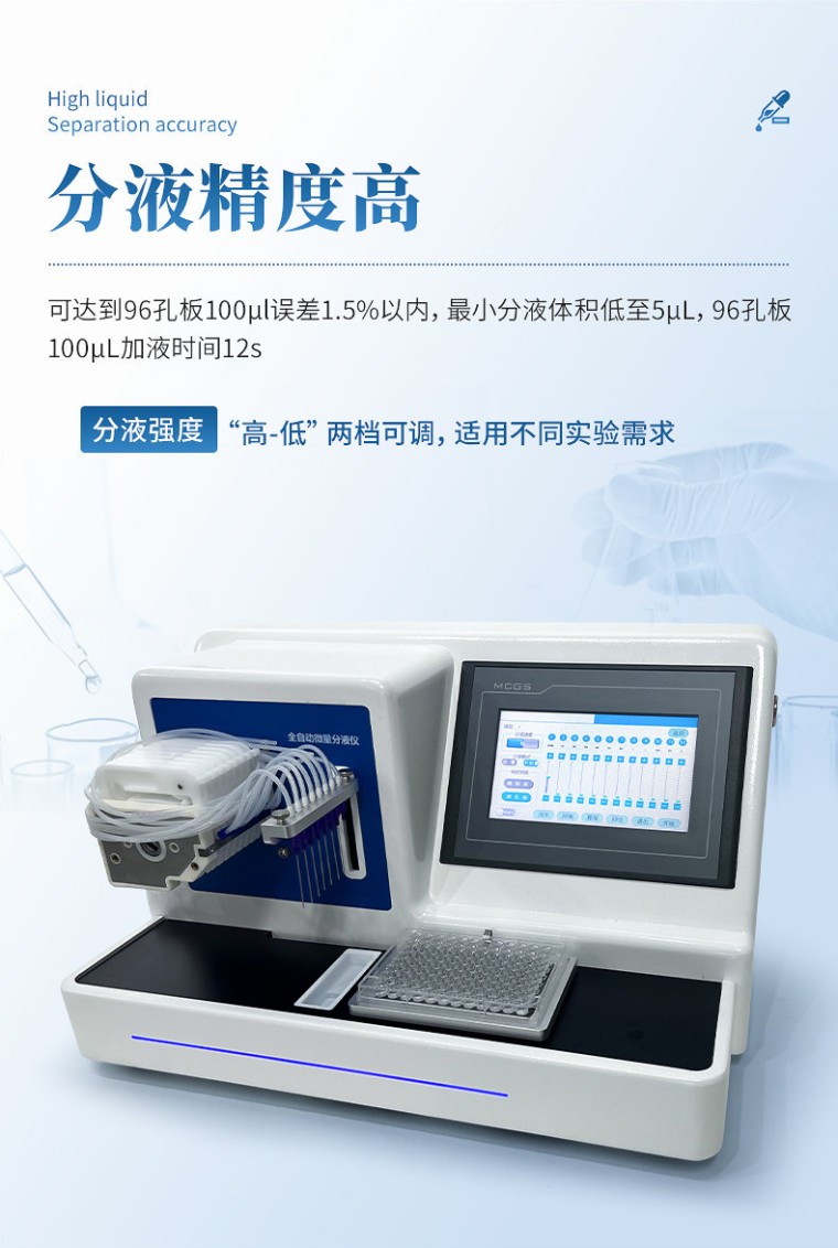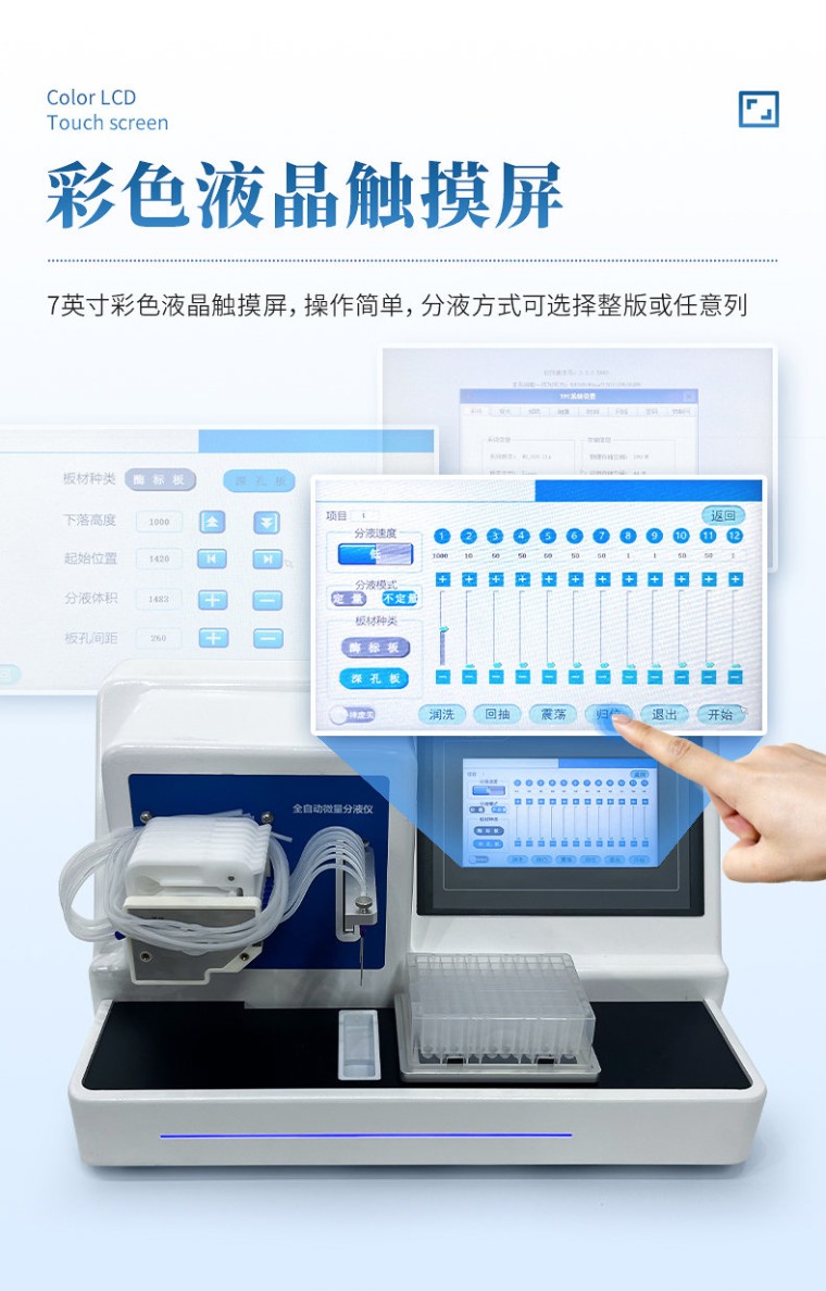 产品说明: 微量自动分液仪(以下简称“分液仪”)是一种配备高精度蠕动泵的分液设备,能够快速、精确、一致的完成自动化分液操作。可广泛应用于疾控筛查、食品检测、动物检疫、生命科学研究等领域。解放实验员双手,在提高效率的同时避免错误。 主要特征: 1、微量自动分液仪采用精密蠕动泵进行非接触式分液,整机精致小巧; 2、分液精度高,可达到96孔板100μl误差1.5%以内,最小分液体积低至5µL,96孔板100µL加液时间12s。 3、分液强度高低两档可调,适用不同实验需求。 4、采用7英寸彩色液晶触摸屏,操作简单,分液方式可选择整版或任意列。 5、活动式废液槽,方便废液排放,可连接管路自动回收废液至废液瓶内。 技术参数: 适用版型:96孔板 分液方式:整板或任意列,可设置指定列分液体积 分液速度:“高-低” 两档可调 分液体积:1~2000µl 分液管路:8通道 显示方式:7英寸液晶触摸屏 分液精度:100µl≤1.5%(96孔板) 辅助功能:振荡、润洗、回抽、归位功能