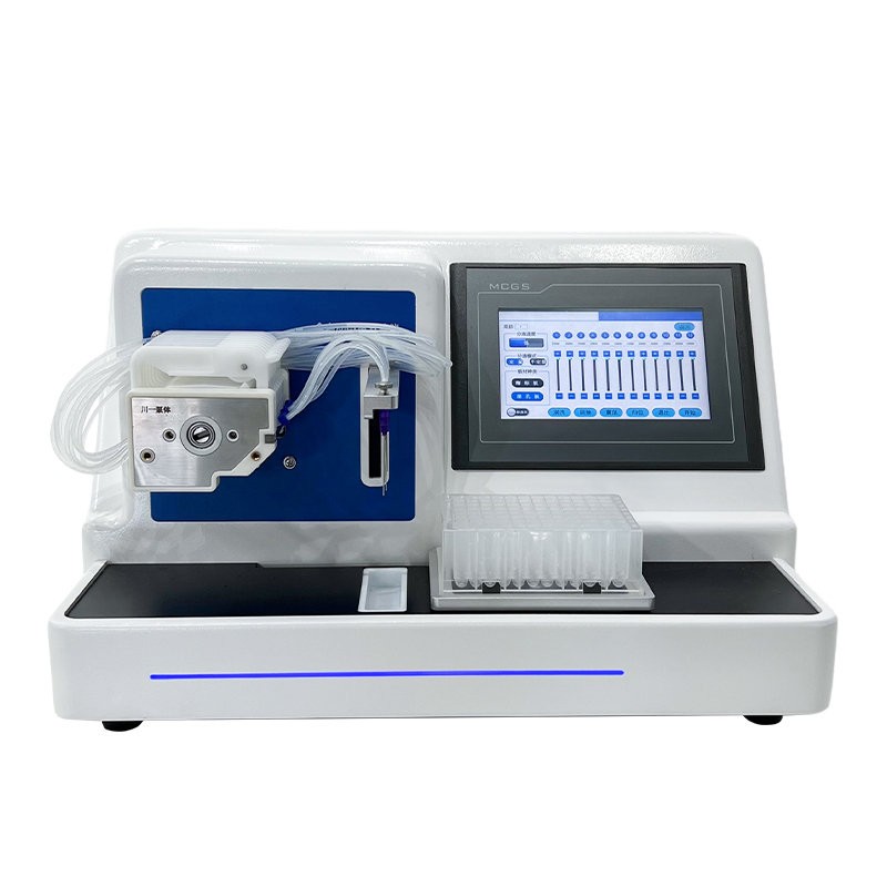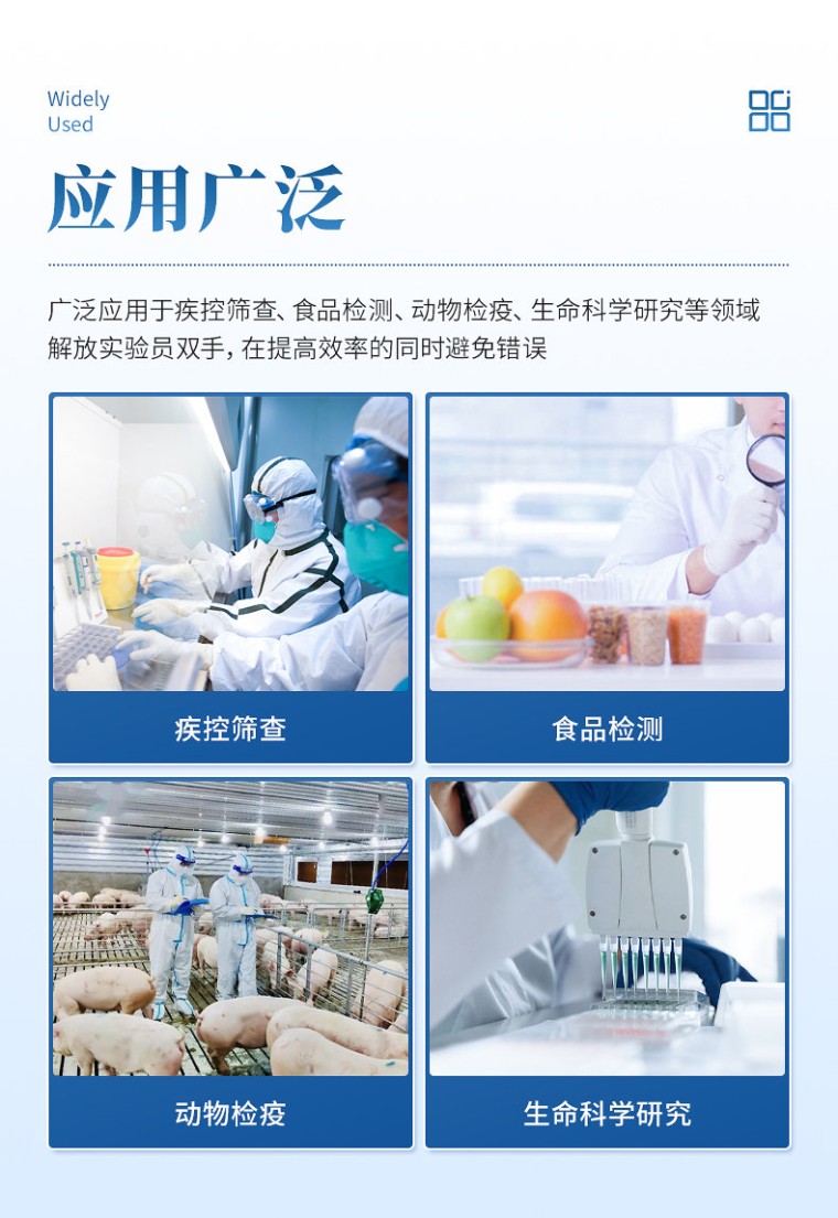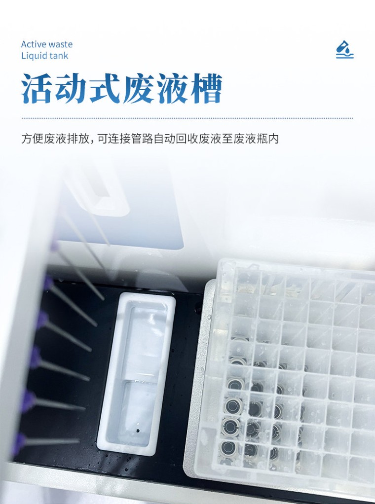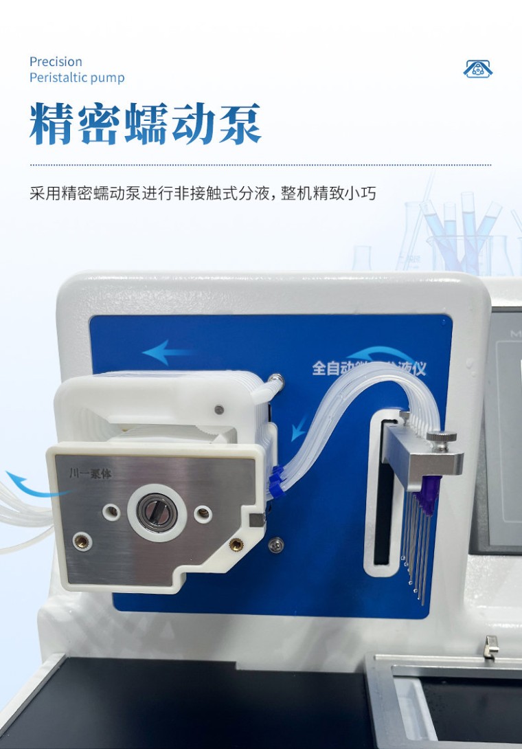 产品说明: 微量自动分液仪(以下简称“分液仪”)是一种配备高精度蠕动泵的分液设备,能够快速、精确、一致的完成自动化分液操作。可广泛应用于疾控筛查、食品检测、动物检疫、生命科学研究等领域。解放实验员双手,在提高效率的同时避免错误。 主要特征: 1、微量自动分液仪采用精密蠕动泵进行非接触式分液,整机精致小巧; 2、分液精度高,可达到96孔板100μl误差1.5%以内,最小分液体积低至5µL,96孔板100µL加液时间12s。 3、分液强度高低两档可调,适用不同实验需求。 4、采用7英寸彩色液晶触摸屏,操作简单,分液方式可选择整版或任意列。 5、活动式废液槽,方便废液排放,可连接管路自动回收废液至废液瓶内。 技术参数: 适用版型:96孔板 分液方式:整板或任意列,可设置指定列分液体积 分液速度:“高-低” 两档可调 分液体积:1~2000µl 分液管路:8通道 显示方式:7英寸液晶触摸屏 分液精度:100µl≤1.5%(96孔板) 辅助功能:振荡、润洗、回抽、归位功能