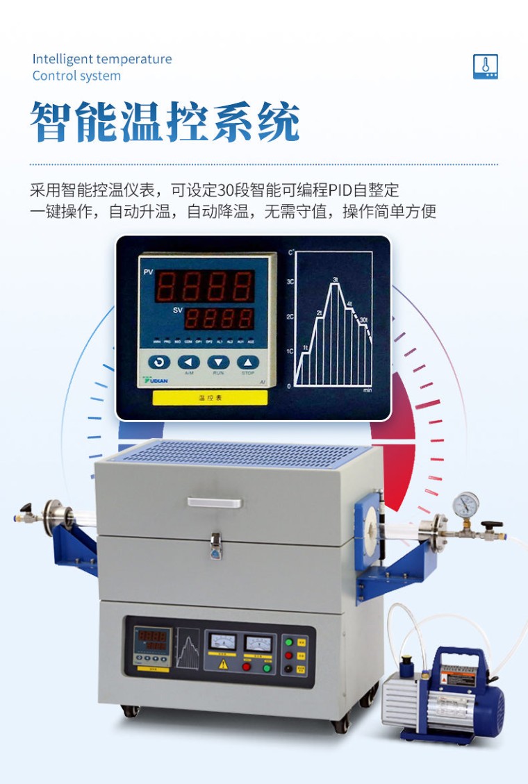 温度控制采用国内宇电仪表厂家的智能控温仪表,可设定 30段智能可编程PID自整定,一键操作, 自动升温, 自动降温,无需守值,操作简单方 便。