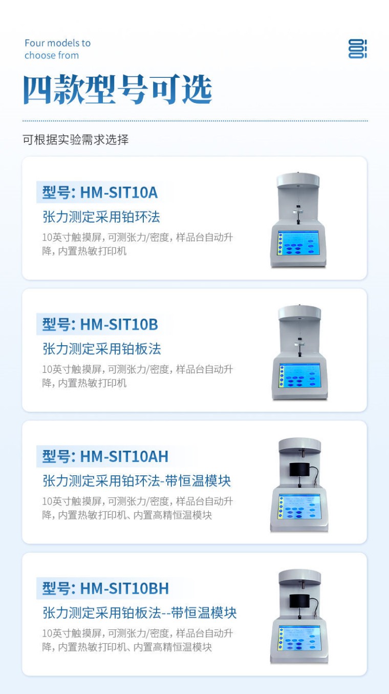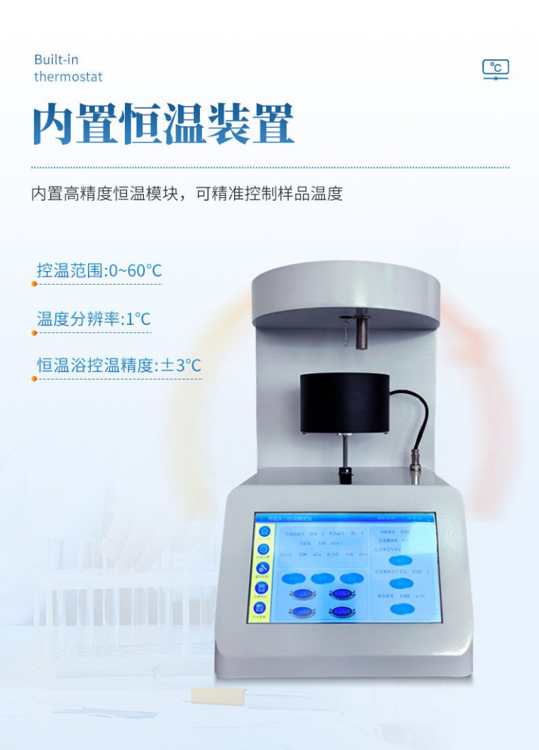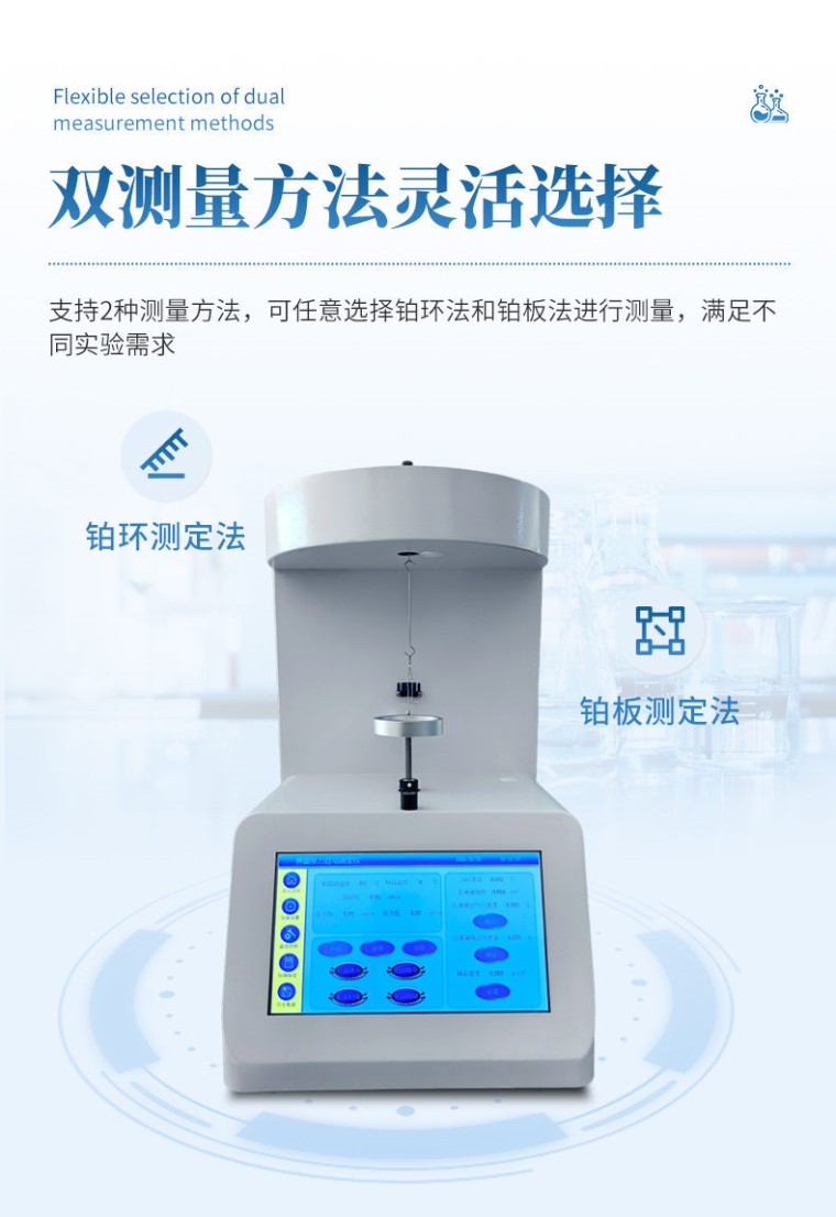 一、仪器简介 表面张力仪是一款用于测定表面张力、界面张力及液体密度的专用检测设备,严格符合多项国家及国际标准要求,可广泛应用于石油产品、表面活性剂、天然胶乳等各类样品的相关指标检测。具体符合标准包括:GB6541-1986《石油产品油对水界面张力测定法》(圆环法)、GB/T22237-2008《表面活性剂 表面张力的测定》、GB18396-2001《天然胶乳 环法测定表面张力》、ISO 6295-1983《石油产品、矿物质润滑油 油对水的界面张力的测定 圆环法》等。 二、仪器原理 表面张力仪核心采用铂环法与铂板法两种经典测量原理,基于表面张力的力学测量方式,通过高精度传感器捕捉铂环或铂板与样品液面接触时的张力信号,经系统精准计算转化为表面/界面张力数值;液体密度测量采用高精度密度传感技术,结合恒温控制模块,确保密度测量的准确性;恒温装置通过闭环控温系统,稳定维持样品测试所需温度,为各项指标检测提供稳定环境,保障测量数据的可靠性与重复性。 三、仪器特点 1、 操作屏幕:配备10寸大屏幕触摸屏,操作便捷、界面直观。 2、 支持2种测量方法:可任意选择铂环法和铂板法进行测量。 3、 可同时测表界面张力和密度:集成两项测量功能,无需额外设备。 4、 全自动测量,自动升降:样品台自动升降,全程全自动无人工干预。 5、 内置打印机:内置热敏打印机,可自动打印测量结果。 6、 数据储存量大:内置大容量存储,可长期留存大量测量数据。 四、技术参数 显示方式:10寸触摸显示屏; 测量方法:测量方法:铂环法和铂板法兼用(标配铂金板); 测量项目:界面张力和液体密度; 操作方式:样品台自动升降,全自动测量; 张力测量范围:2~500mN/m; 张力精度:0.1mN/m; 张力分辨率:0.01mN/m; 密度范围:0~5g/cm3 密度分辨率:0.001g/cm3; 移动行程:0~75mm; 内置储存:>10000条; 打印方式:标配内置热敏打印机; 工作温度:5℃~35℃; 工作湿度:最高80%; 电源交流电:220V±5%,50Hz/60Hz; 功率:100W;