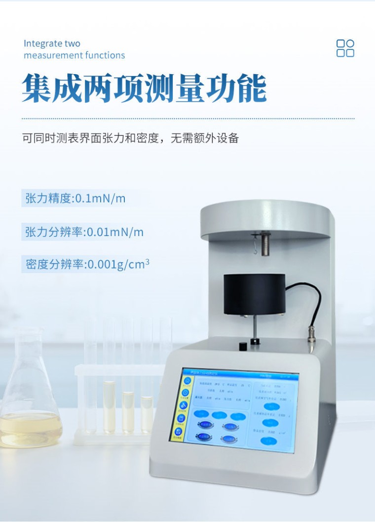 一、仪器简介 界面张力测定仪是一款用于测定表面张力、界面张力及液体密度的专用检测设备,严格符合多项国家及国际标准要求,可广泛应用于石油产品、表面活性剂、天然胶乳等各类样品的相关指标检测。具体符合标准包括:GB6541-1986《石油产品油对水界面张力测定法》(圆环法)、GB/T22237-2008《表面活性剂 表面张力的测定》、GB18396-2001《天然胶乳 环法测定表面张力》、ISO 6295-1983《石油产品、矿物质润滑油 油对水的界面张力的测定 圆环法》等。 二、仪器原理 界面张力测定仪核心采用铂环法与铂板法两种经典测量原理,基于表面张力的力学测量方式,通过高精度传感器捕捉铂环或铂板与样品液面接触时的张力信号,经系统精准计算转化为表面/界面张力数值;液体密度测量采用高精度密度传感技术,结合恒温控制模块,确保密度测量的准确性;恒温装置通过闭环控温系统,稳定维持样品测试所需温度,为各项指标检测提供稳定环境,保障测量数据的可靠性与重复性。 三、仪器特点 1、 操作屏幕:配备10寸大屏幕触摸屏,操作便捷、界面直观。 2、 支持2种测量方法:可任意选择铂环法和铂板法进行测量。 3、 可同时测表界面张力和密度:集成两项测量功能,无需额外设备。 4、 全自动测量,自动升降:样品台自动升降,全程全自动无人工干预。 5、 内置打印机:内置热敏打印机,可自动打印测量结果。 6、 数据储存量大:内置大容量存储,可长期留存大量测量数据。 7、 内置恒温装置:高精度恒温模块,可精准控制样品温度。 四、技术参数 显示方式:10寸触摸显示屏; 测量方法:测量方法:铂环法和铂板法兼用(标配铂金板); 测量项目:界面张力和液体密度; 操作方式:样品台自动升降,全自动测量; 张力测量范围:2~500mN/m; 张力精度:0.1mN/m; 张力分辨率:0.01mN/m; 密度范围:0~5g/cm3 密度分辨率:0.001g/cm3; 控温范围:0~60℃ 温度分辨率:1℃; 恒温浴控温精度:±3℃; 移动行程:0~75mm; 内置储存:>10000条; 打印方式:标配内置热敏打印机; 工作温度:5℃~35℃; 工作湿度:最高80%; 电源交流电:220V±5%,50Hz/60Hz; 功率:100W;