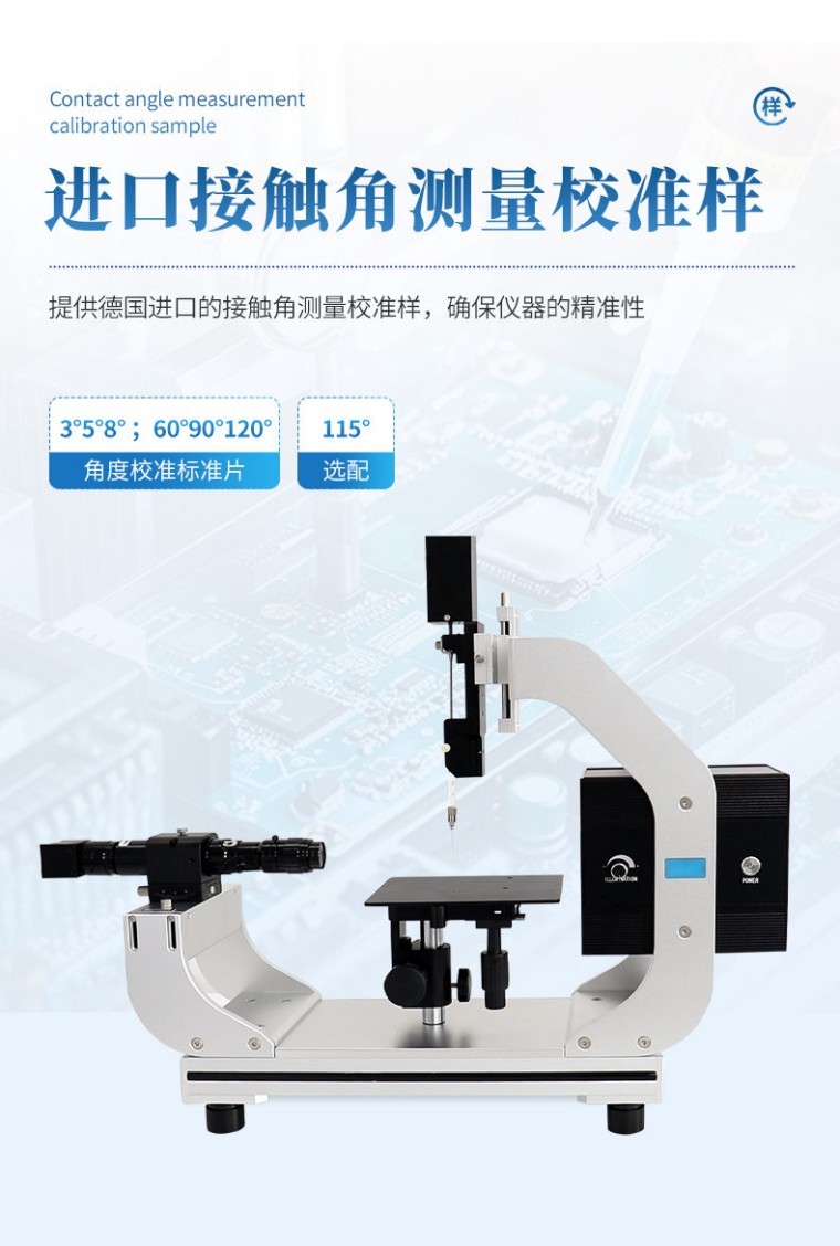 五·符合国家的相关标准(Accord with national standard) 1.GB/T 24368-2009(玻璃表面疏水污染物检测); 2.SY/T5153-2007(油藏岩石润湿性测定方法); 3.ASTM D 724-99(2003)(纸的表面可湿性的试验方法); 4.ASTM D5946-2004(塑料薄膜与水接触角度的测量); 5.ISO15989(塑料薄膜和薄板电晕处理薄膜的水接触角度的测量); 六·产品特点(Product features) 1、 主机采用高强度航空铝合金结构搭配模块化设计理念,自主研发的集成芯片电路控制,采纳国际顶尖进口接触角设备的设计精华与配置,保证仪器具有极强的稳定性; 2、 采用工业级密集可调LED冷光源系统(寿命25000H以上),保证成像更清晰,同时避免额外热度所导致的小液滴挥发; 3、采用高性能日本原装进口工业机芯,工业级远心变焦变倍镜头,基本可达到图像无失真情况,确保成像效果; 4、 采用USB2.0标准接口,数据传输速度快,兼容性高,成像稳定性强; 5、 提供德国进口的接触角测量校准样,确保仪器的精准性,角度校准标准片3°5°8° ;60°90°120°;115°(选配); 6、 采集系统设计灵活,适用于绝大部分测量环境,简单应付多种复杂的样品表面测量; 7、拥有先进接触角分析方法,满足所有种类液滴成像的准确拟合,其中包括恒美独有的微分椭圆与微分圆特殊液体成像拟合方法; 8、 采用国际**的计算方法,软件已实现全自动拟合避免人为操作造成的误差; 9、具备双边接触角测量快速拟合功能,更全面量分析液体与固体的表面润湿性能、更准确的分析表面的实际润湿情况; 10、 动态拍摄、视频快速测试数据,可以连续性记录测试接触角的变化,再由软件自动批量拟合; 11、 软件自动生成报告,其中涵盖 Word形式、Excel形式、谱图形式等多种数据报告; 12、 具备前进后退角测量功能,便于高效的测量样品表面稳定性能; 13、 具备多种可选配功能件,我司研发团队雄厚可满足客户提出来的各种定制测量要求; 七·售后(After-sales service) 1、 常规型号,闪电发货; 2、 仪器整机两年质保; 3、 提供售前免费实验服务; 4、 仪器软件终身免费在线升级; 5、 总部定期操作及理论知识培训; 6、 仪器终身校准维护保养服务;