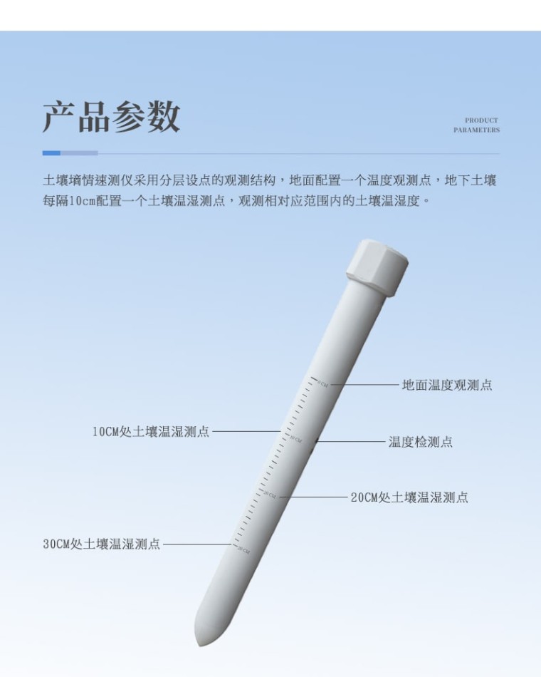 一、产品概述 管式土壤墒情监测设备是一款基于介电常数原理而研发的传感器,可以针对不同土层的水分、温度含量进行快速、准确、全面监测。该传感器监测层数支持定制,最低可测三层土壤温湿度,最高可测十层土壤温湿度。 该产品可快速、全面了解土壤墒情信息,为抗旱救灾提供决策支持,最大限度地减轻灾害损失。产品采用标准的Modbus-RTU485通信,最远可通信2000米,支持二次开发。 产品适用于农业农村局、高校、科研院所、水利局、环保局、企事业单位。 二、产品特点 1、外壳采用PVC塑料管,内部发射近1G赫兹的高频探测波,可以穿透塑料管,有效感知土壤环境。 2、不受土壤中盐离子的影响,化肥、农药、灌溉等农业活动不会影响测量结果,数据精准。 3、传感器的电极没有直接与土壤接触,避免电力对土壤及土壤中的植物的干扰。 4、产品采用标准的Modbus-RTU485通信模式,最远通信2000米。 5、支持10-30V宽电压充电。 6、一体式可同时监测五层土壤温湿度。 三、技术参数 1、工作温度:-40℃-80℃ 2、土壤湿度:0~100%(±5%) 3、土壤温度:-15℃~35℃(±0.5℃) 4、测点间距:10cm 5、供电方式:10-30V宽直流供电 6、外壳:PVC塑料管 7、防护等级:地面以下部分IP68 8、输出信号:RS485(Modbus协议) 9、功耗:0.96W 四、设备安装说明 1、使用土钻在合适的位置打孔 1.1将土钻竖直于地面,双手紧握手柄顺时针下压慢速转动。(注意:不要太用力,务必慢速多转几圈,防止钻头跑偏至孔洞打歪) 1.2.将取土钻从孔洞中取出,放入桶中将土钻中的土收集到桶中用以下一步和泥浆。(注意:因为**钻土因为杂质过多故不做收集) 1.3.反复持续上述打孔、取土,并在此过程中尝试性地将传感器轻放入孔洞中(请勿将设备用力触底),以测试孔洞的深度是否合适;若有卡顿,则使用土钻修正,保证传感器放入、取出都比较顺畅;直到孔深与传感器所标识的安装位置齐平,打孔完成 2、制作泥浆 2.1挑出土钻取出的土壤中的杂质,石子、草根、不容易溶解的土块等。将土壤搓细,以便和泥浆 2.2倒入适量水,充分搅拌至粘稠状;壤土泥浆一般不能稠于“芝麻酱”状;和泥浆完成 3、灌浆安装 3.1将泥浆缓慢倒入孔洞,大概到孔洞1/2的位置;可根据实际情况酌情增减 3.2将传感器慢慢放入孔洞中,向一个方向慢慢转动并下压,速度过快可能会导致气泡不能被完全排出(注意:再转动下压的过程中不可以上拔传感器,防止气体再次吸入孔中) 3.3当传感器安装到正确的深度后,设备周围会溢出一些泥浆,灌浆完成; 此时传感器安装深度与洞口齐(注意:将传感器周围3CM以外多余的泥浆清除,防止结块影响水分下渗)