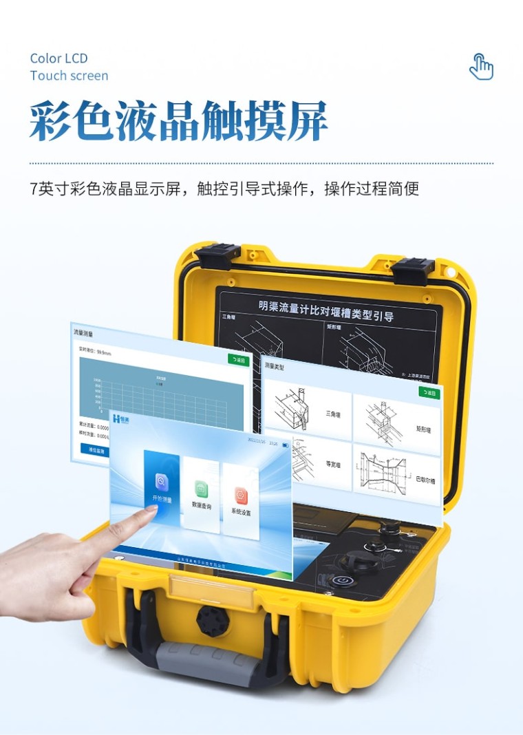 一、产品简介: 便携式明渠流量计是专为水文监测、江河流量监测、农业灌溉及市政给排水等行业设计的一种高精度测量仪表,它采用超声波技术和特殊的微功耗设计方案,结合全数字信号处理技术,确保了测量的稳定性与可靠性。该设备具有广泛的测量范围和较高的测量精度,支持实时数据显示、数据记录、导出及打印等功能,操作简便且准确度高,非常适合于需要频繁移动进行测量的场合。同时,它依据JJG711-1990检定规程,并参照HJ353-2019、HJ354-2019、HJ355-2019以及HJ15-2019中对流量监测单元的相关要求进行比对验收,确保了其在水利工程、环境监测、农业灌溉等领域的适用性和准确性。 二、应用范围: 水利工程部门:监测河流、渠道、水库的水流速度与流量; 环保部门、水质监测站以及相关环保企业:使用此类设备来监控城市排水系统、工业废水排放的流速和流量; 第三方检测机构:现场校准比对在线明渠流量计仪表设备; 应急管理部门:快速评估水流状况,为防洪减灾提供数据支持。 三、执行标准: JJG711-1990《明渠堰槽流量计》; HJ15-2019《超声波明渠污水流量计技术要求及检测方法》; HJ353-2019《水污染源在线监测系统(CODCr、NH3-N等)安装技术规范》; HJ354-2019《水污染源在线监测系统(CODCr、NH3-N等)验收技术规范》; HJ355-2019《水污染源在线监测系统(CODCr、NH3-N等)运行技术规范》; 四、产品特点: 1、适用于三角堰、矩形堰、等宽堰和巴歇尔槽四种堰槽类型; 2、高精度信号采集模块,配合滤波算法,测量数据准确; 3、7英寸彩色液晶显示屏,触控引导式操作,操作过程简便; 4、采用高性能数据处理器,快速处理数据; 5、带有曲线显示,测量时可以直观查看液位和流量变化趋势; 6、仪器自带微型热敏打印机,可以现场打印测量报告; 7、大容量数据存储,最大可储存10000次历史测量数据; 8、可直接将数据导出到U盘,便于用户对数据进行统计分析; 9、内置大容量锂电池,一次充电可连续测量48小时; 10、手提箱式设计,整机重量轻,方便用户携带,防水等级IP65。 11、标配GPS定位功能,也可定制北斗定位或其他定位功能; 12、具有WIFI连接功能,支持远程OTA升级程序; 13、开机密码进入,有效保护测量比对数据及结果; 五、技术参数 1、流量测量范围:0~40m3/s; 2、液位测量范围:10cm~1m; 3、流量测量误差:≤±1%; 4、液位测量误差:±0.5mm; 5、内置电池规格:12.6V/4.8Ah,待机时间>48小时; 6、外部充电器规格:12.6V/2A; 7、数据输出方式:USB; 8、数据打印:内置热敏打印机; 9、定位方式:标配GPS定位; 10、工作环境温度:-20~50℃ 11、主机尺寸:274*225*113mm; 12、三脚架尺寸:700*200*130mm; 13、整机重量:6.6kg(含三脚架、传感器); 14、包装箱尺寸及重量:(子母件)支架包:830*170*250mm 4.5kg 机器: 320*170*275mm 3kg