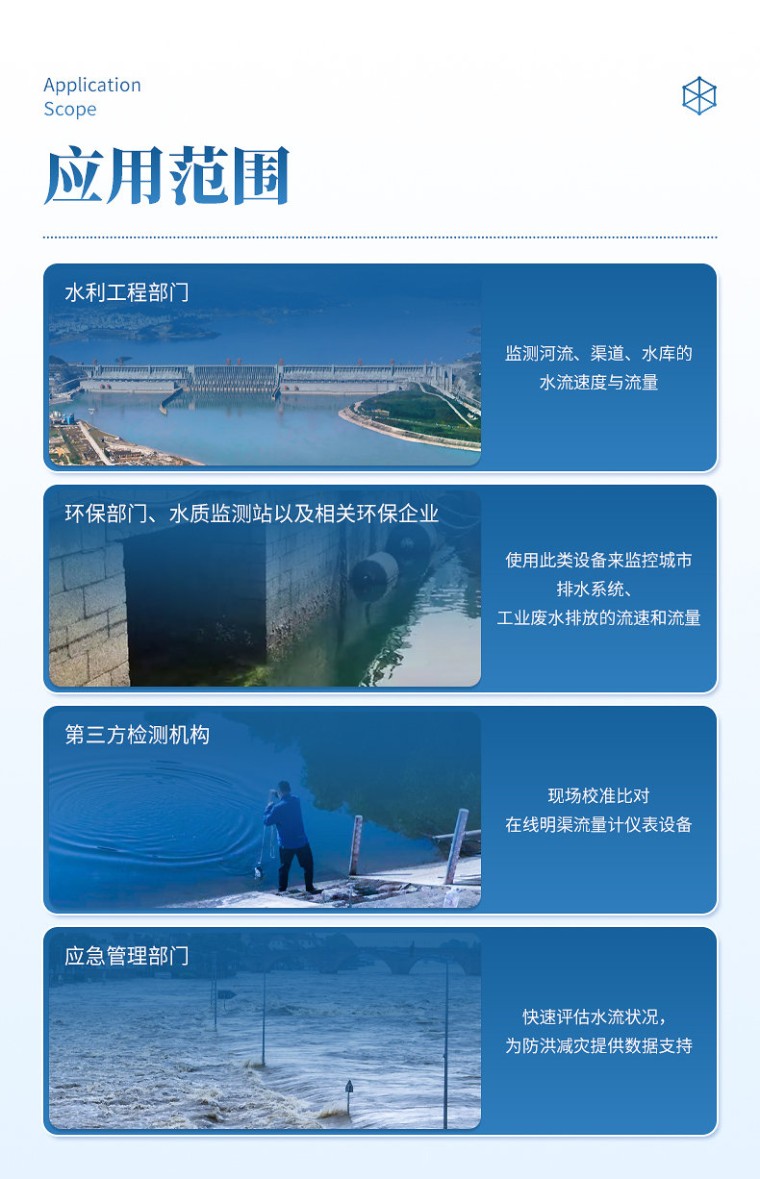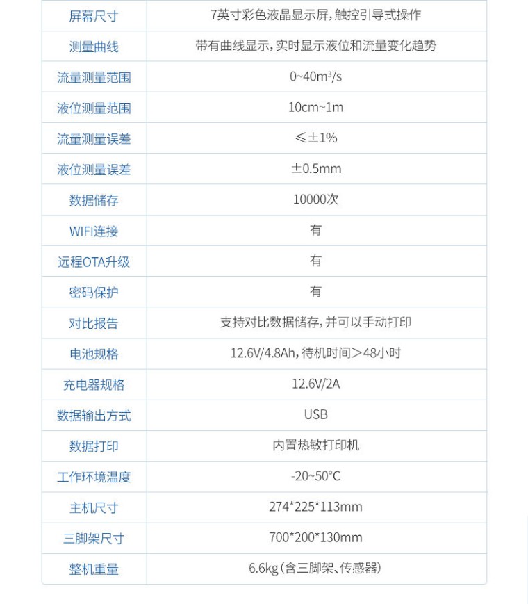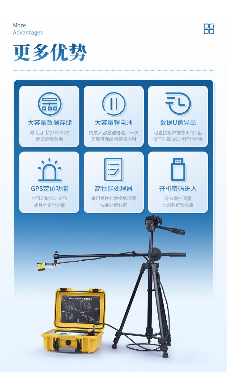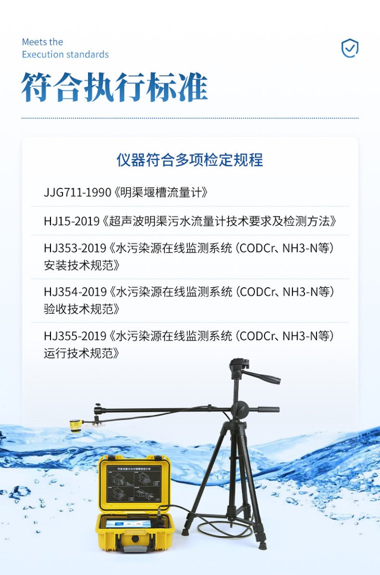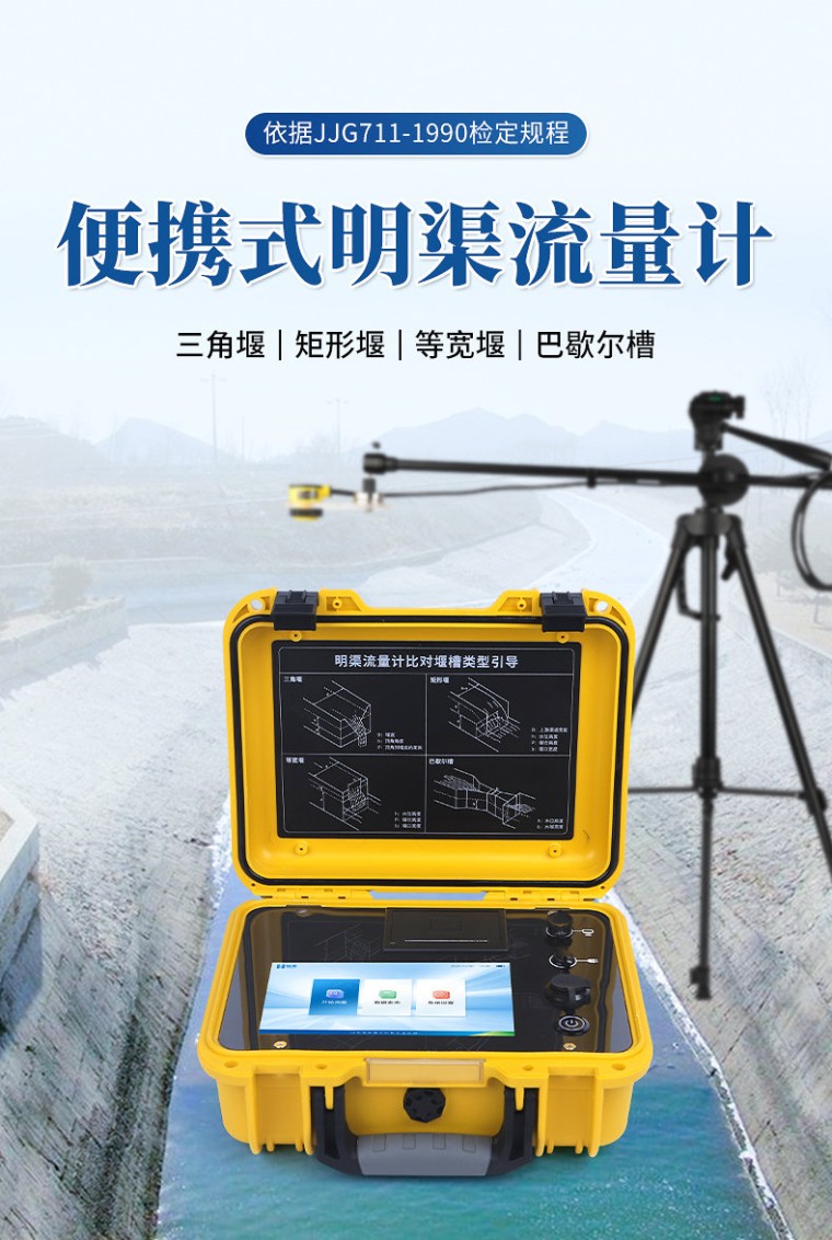 一、产品简介: 便携式明渠流量计是专为水文监测、江河流量监测、农业灌溉及市政给排水等行业设计的一种高精度测量仪表,支持10种堰槽类型的测量,采用超声波技术和特殊的微功耗设计方案,结合全数字信号处理技术,确保了测量的稳定性与可靠性。该设备具有广泛的测量范围和较高的测量精度,支持实时数据显示、数据记录、导出及打印等功能,操作简便且准确度高,非常适合于需要频繁移动进行测量的场合。同时,它依据JJG711-1990检定规程,并参照HJ353-2019、HJ354-2019、HJ355-2019以及HJ15-2019中对流量监测单元的相关要求进行比对验收,确保了其在水利工程、环境监测、农业灌溉等领域的适用性和准确性。 二、应用范围: 水利工程部门:监测河流、渠道、水库的水流速度与流量; 环保部门、水质监测站以及相关环保企业:使用此类设备来监控城市排水系统、工业废水排放的流速和流量; 第三方检测机构:现场校准比对在线明渠流量计仪表设备; 应急管理部门:快速评估水流状况,为防洪减灾提供数据支持。 三、执行标准: JJG711-1990《明渠堰槽流量计》; HJ15-2019《超声波明渠污水流量计技术要求及检测方法》; HJ353-2019《水污染源在线监测系统(CODCr、NH3-N等)安装技术规范》; HJ354-2019《水污染源在线监测系统(CODCr、NH3-N等)验收技术规范》; HJ355-2019《水污染源在线监测系统(CODCr、NH3-N等)运行技术规范》; 四、产品特点: 1、支持10种堰槽测量(三角堰、矩形堰、等宽堰、巴歇尔槽、无喉道堰、矩形宽顶堰、圆缘宽顶堰、三角形剖面堰、平坦V型堰、梯形薄壁堰); 2、高精度信号采集模块,配合滤波算法,测量数据准确; 3、实时显示并记录环境大气压值和温度值,并通过算法纳入数据体系,使数据的可信度更高; 4、7英寸彩色液晶显示屏,触控引导式操作,操作过程简便; 5、采用高性能数据处理器,快速处理数据; 6、具有连续测量功能,自定义测量时长; 7、带有曲线显示,测量时可以直观查看液位和流量变化趋势; 8、仪器自带微型热敏打印机,可以现场打印测量报告; 9、大容量数据存储,最大可储存10000次历史测量数据; 10、可直接将数据导出到U盘,便于用户对数据进行统计分析; 11、内置大容量锂电池,一次充电可连续测量48小时; 12、具有GPS、北斗、QZSS定位功能,方便不同用户需求; 13、具有WIFI连接功能,支持远程OTA升级程序; 14、开机密码进入,有效保护测量比对数据及结果; 15、手提箱式设计,整机重量轻,方便用户携带,防水等级IP65。 五、技术参数