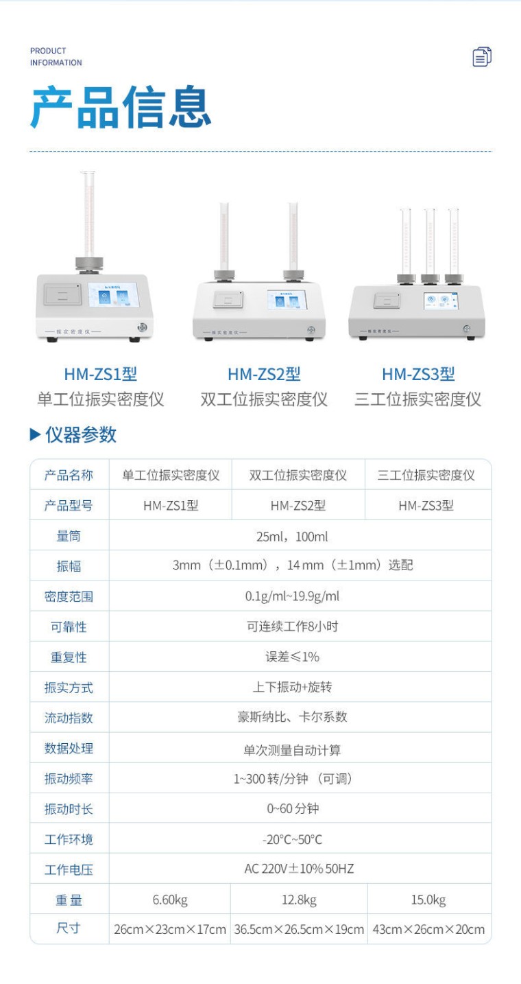 产品简介: 振实密度测试仪(Tap Density Tester)是一种通过模拟实际工况中的振动条件,精确测定粉末或颗粒材料在振实状态下密度的高精度仪器。其核心功能是评估材料在压实过程中的体积变化,为工业生产、研发和质量控制提供关键数据支持。 应用范围: 广泛应用于国防工业、造纸、水泥、电池、涂料以及各种金属和非金属行业,是进行密度检测的理想设备。金属粉末:如铝粉、锆粉、镍粉、钨粉、锡粉、锌粉、钼粉、镁粉、铜粉以及其它稀有金属粉。非金属粉末:如滑石粉、高岭土、碳酸钙、煤粉、荧光粉、水镁石、方解石、硅灰石、电气石、金刚石、重晶石、萤石、沸石、碳化硼、黏土、石墨、石英、石膏、膨润土、硅藻土、硅酸锆、刚玉、云母、粘土、钛白粉等。 执行标准: 1、GB/T 5162-2021/ISO3953:2011 金属粉末 振实密度的测定。 2、GB/T 21354-2008/ISO3953:1993 粉末产品 振实密度测定通用方法。 3、ISO 787-11 Determination of tamped volume and apparent density after tamping. 4、中国药典2020版。 振动原理: 将定量的粉末置于量筒中,在保持颗粒原始形态下,通过振动装置均匀往复的上下直线运动,使颗粒间隙趋于一极限值,直到粉末的体积不再减小为止。粉末的质量除以振实后的体积,得到的就是样品的振实密度。 仪器优势: 1、使用5.0寸触摸屏,提供便捷、简单的人机交互方式; 2、使用嵌入式微处理器,具有高性能、低功耗的特点; 3、使用长寿命、高可靠性的电机及驱动组件、具备优秀的启停响应能力; 4、操作界面直观易用,具有连贯性、逻辑性,具备人性化的美学设计; 5、内置嵌入式微型小票打印机; 6、测量结果精确到小数点后3位; 7、仪器运行稳定,结构牢固,外型美观。 技术参数: 量 筒:25ml,100ml 振 幅:3mm(±0.1mm),14 mm(±1mm)选配 密度范围:0.1g/ml~19.9g/ml 重 复 性:误差≤1% 可 靠 性:可连续工作8小时 振实方式:上下振动+旋转 流动指数:豪斯纳比、卡尔系数 数据处理:单次测量自动计算 振动频率:1~300 次/分钟 (可调) 振动时长:0~60 分钟 工作环境:-20℃~50℃ 工作电压:AC 220V±10% 50HZ 重 量:12.8kg 尺 寸:36.5cm×26.5cm×19cm