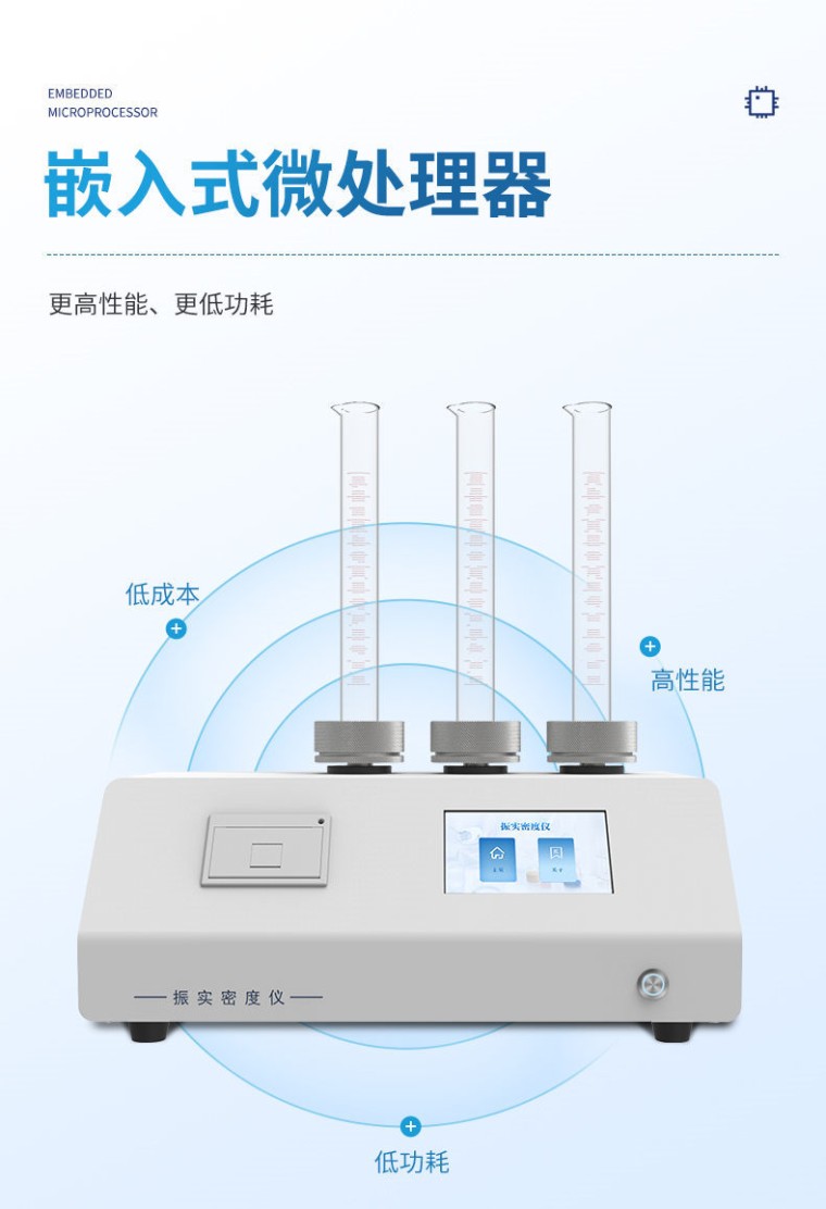 产品简介: 粉末密度测定仪是一种通过模拟实际工况中的振动条件,精确测定粉末或颗粒材料在振实状态下密度的高精度仪器。其核心功能是评估材料在压实过程中的体积变化,为工业生产、研发和质量控制提供关键数据支持。 应用范围: 广泛应用于国防工业、造纸、水泥、电池、涂料以及各种金属和非金属行业,是进行密度检测的理想设备。金属粉末:如铝粉、锆粉、镍粉、钨粉、锡粉、锌粉、钼粉、镁粉、铜粉以及其它稀有金属粉。非金属粉末:如滑石粉、高岭土、碳酸钙、煤粉、荧光粉、水镁石、方解石、硅灰石、电气石、金刚石、重晶石、萤石、沸石、碳化硼、黏土、石墨、石英、石膏、膨润土、硅藻土、硅酸锆、刚玉、云母、粘土、钛白粉等。 执行标准: 1、GB/T 5162-2021/ISO3953:2011 金属粉末 振实密度的测定。 2、GB/T 21354-2008/ISO3953:1993 粉末产品 振实密度测定通用方法。 3、ISO 787-11 Determination of tamped volume and apparent density after tamping. 4、中国药典2020版。 振动原理: 将定量的粉末置于量筒中,在保持颗粒原始形态下,通过振动装置均匀往复的上下直线运动,使颗粒间隙趋于一极限值,直到粉末的体积不再减小为止。粉末的质量除以振实后的体积,得到的就是样品的振实密度。 仪器优势: 1、使用5.0寸触摸屏,提供便捷、简单的人机交互方式; 2、使用嵌入式微处理器,具有高性能、低功耗的特点; 3、使用长寿命、高可靠性的电机及驱动组件、具备优秀的启停响应能力; 4、操作界面直观易用,具有连贯性、逻辑性,具备人性化的美学设计; 5、内置嵌入式微型小票打印机; 6、测量结果精确到小数点后3位; 7、仪器运行稳定,结构牢固,外型美观。 技术参数: 量 筒: 25ml,100ml 振 幅: 3mm(±0.1mm),14 mm(±1mm)选配 密度范围: 0.1g/ml~19.9g/ml 重 复 性: 误差≤1% 可 靠 性:可连续工作8小时 振实方式: 上下振动+旋转 流动指数:豪斯纳比、卡尔系数 数据处理:单次测量自动计算 振动频率: 1~300 次/分钟 (可调) 振动时长: 0~60 分钟 工作环境: -20℃~50℃ 工作电压: AC 220V±10% 50HZ 重 量: 15.0kg 尺 寸: 43cm×26cm×20cm