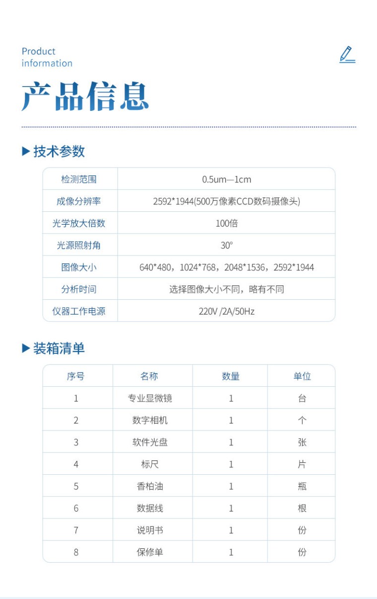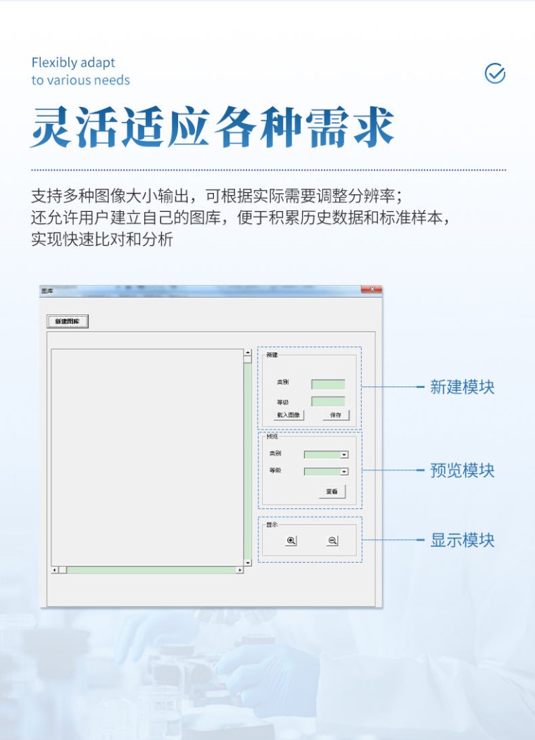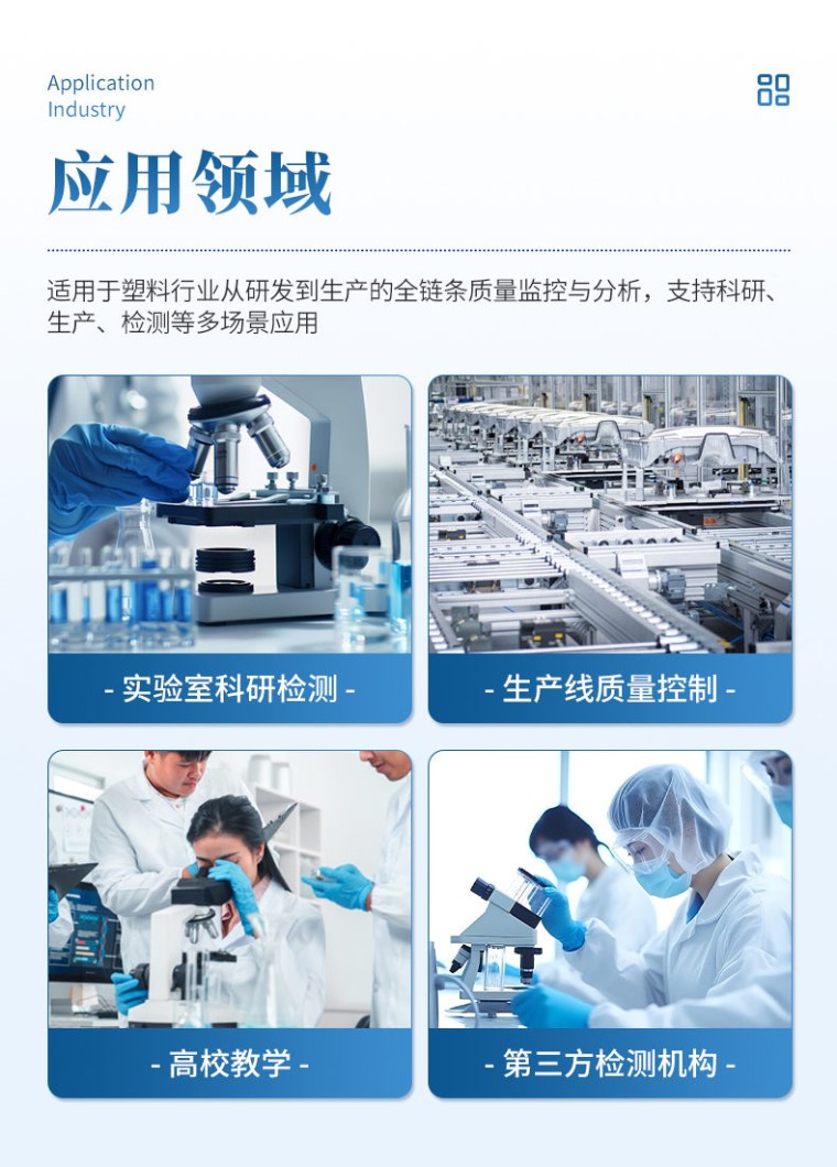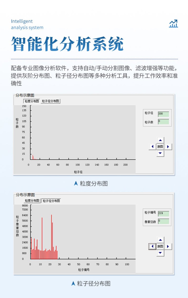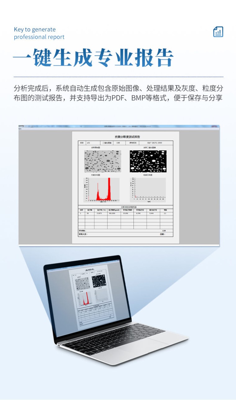 HM-TF炭黑分散度检测仪是我司根据国际标准GB/T 18251-2019针对聚烯烃管材、管件和混配料中颜料或炭黑分散的检测仪器。 该仪器适配基于HM-TF的软件及相应的显微镜,通过对炭黑粒团的尺度、形态、及散布情况的测量,可以建立起这些参数与力学性能、抗静电性能、吸湿性能等宏观性能指标的内在联系。 HM-TF对塑料材料的品质保障、生产工艺、新品研发产生积极影响,同时推进企业和行业技术水平的快速提升。 主要特点 采用专业图像分析法由计算机完成炭黑分散度等级的判定,检测精度高 对目标炭黑粒径可从微米级到毫米级进行分析; 配备专业显微镜,配以500万CMOS图像传输器; 可单张保存图像,图像大小由640*480,1024*768,1280*1024,2592*1944四种大小可供选择; 丰富的图像处理功能,满足多种图像处理需要; 软件具有自动和手动两种方式进行炭黑图像分割; 软件可满足对局部分析的要求; 配备测微标尺,可进行像素点尺寸校准,并且软件具有移动标尺功能,可进行任意两点距离测量; 客户可以自行建立标准图库; 输出结果涵盖炭黑粒团的个数、粒径、面积等,并可以数据报表和excel的形式进行输出; 提供图像灰阶分布图、粒子径分布图、粒度分布图; 报告结果包括:样品名、标准名、原始图像、灰阶图等。报告输出格式多样,可以选择图片格式或pdf格式进行保存; 软件试用各种主流操作系统,与win7/win10/winXP等有很好兼容性; 采用usb2.0数据接口,可适配多种采集设备(如:摄像头或数码相机)。 技术参数