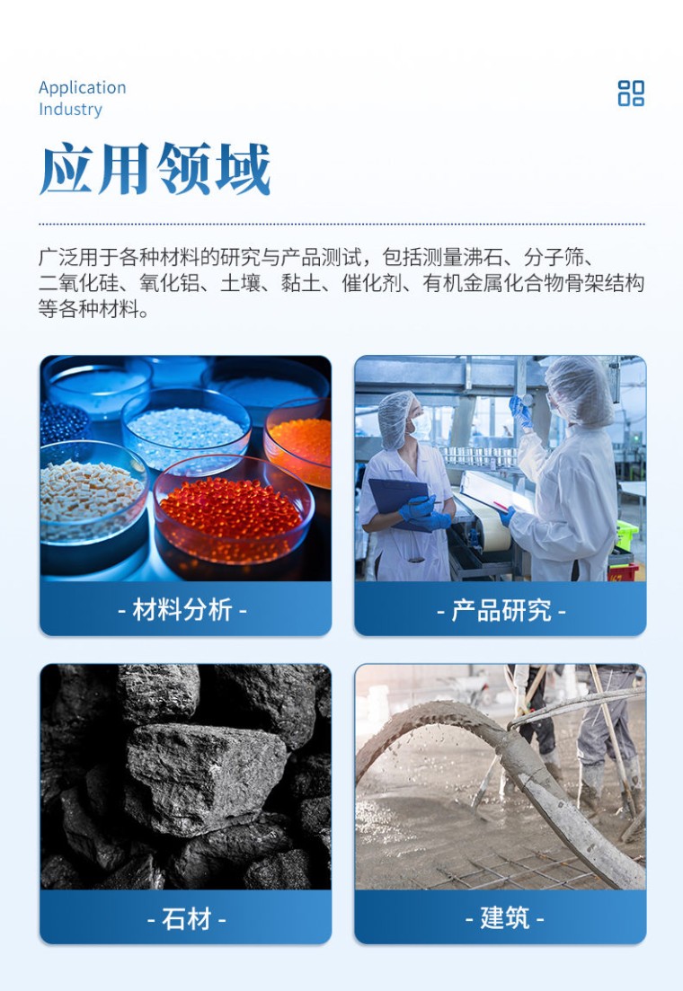 一、仪器简介: 全自动比表面积及孔隙度分析仪符合ISO9277,ISO15901国际标准和GB/T19587等国家标准,依据静态容量法通过质量平衡方程,静态气体平衡和压力测定来测试吸附过程。测试过程在液氮温度下进行。已知量气体由歧路充入样品管后,会引起压力下降,由此计算吸附平衡时被吸附气体的摩尔质量。通过测定出该平衡吸附量,利用理论模型来求出被测样品的单点、多点BET比表面积,Langmuir比表面积;BJH中孔、大孔体积、面积分布,总孔体积;t―plot微孔体积和表面积,Dubinin―Astakhov微孔分布,Horvath―Kawazoe、SF微孔分布,MP微孔分布;非局域密度函数理论(NLDFT)和蒙特卡洛(GCMC)孔径分布模型等参数。