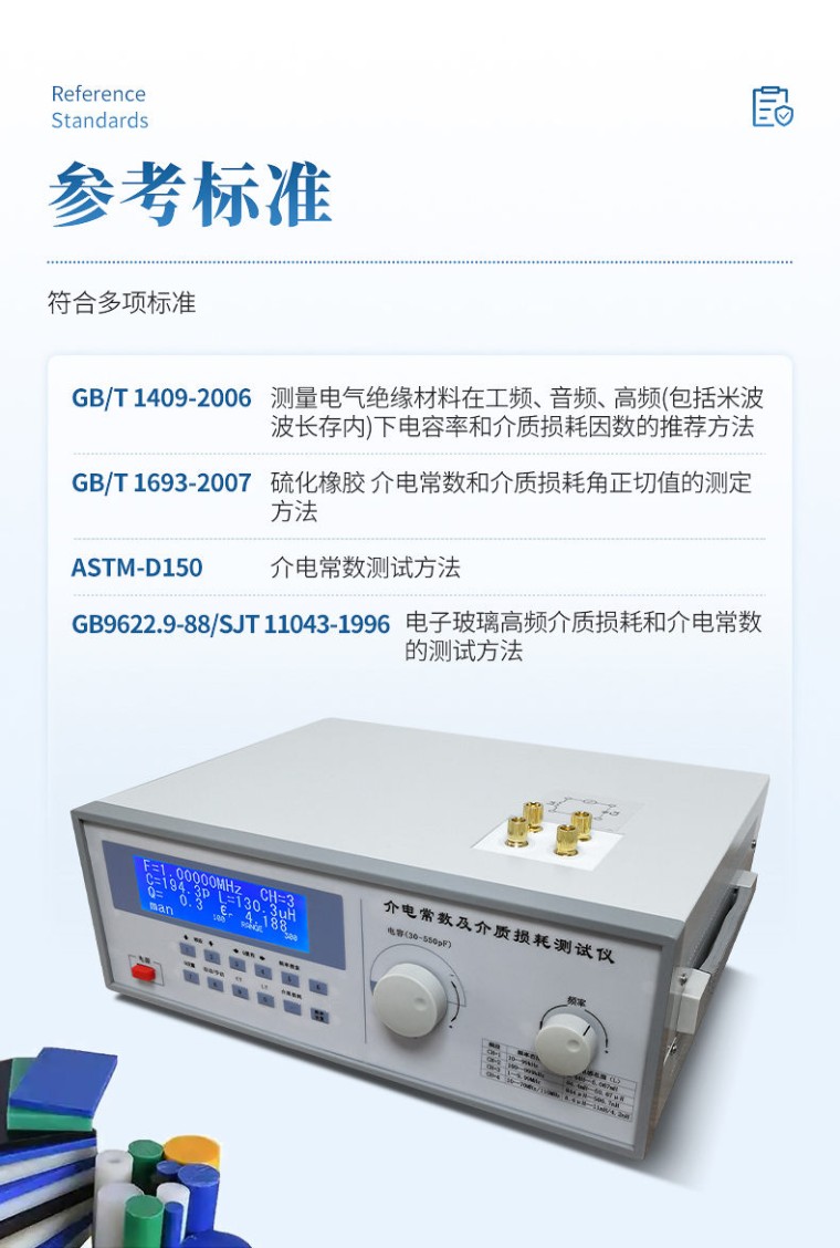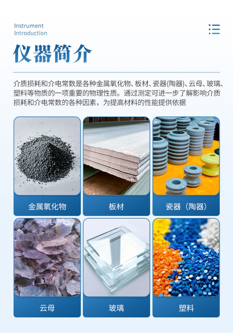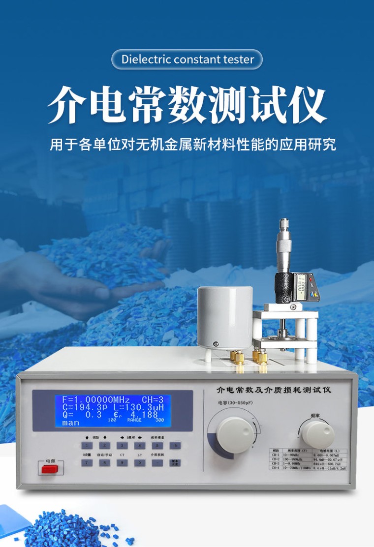 介质损耗和介电常数是各种金属氧化物,板材,瓷器(陶器),云母,玻璃,塑料等物质的一项重要的物理性质。通过测定可进一步了解影响介质损耗和介电常数的各种因素,为提高材料的性能提供依据。 仪器用途 该仪器用于科研机关、学校、工厂等单位对无机金属新材料性能的应用研究。 参考标准 u GB/T 1409-2006 测量电气绝缘材料在工频、音频、高频(包括米波波长存内)下电容率和介质损耗因数的推荐方法; u GB/T 1693-2007 硫化橡胶 介电常数和介质损耗角正切值的测定方法; u ASTM-D150-介电常数测试方法; u GB9622.9-88/SJT 11043-1996 电子玻璃高频介质损耗和介电常数的测试方法。 技术参数