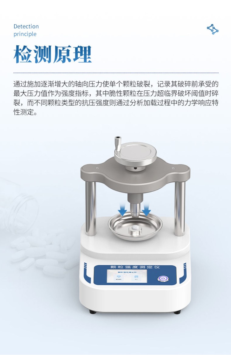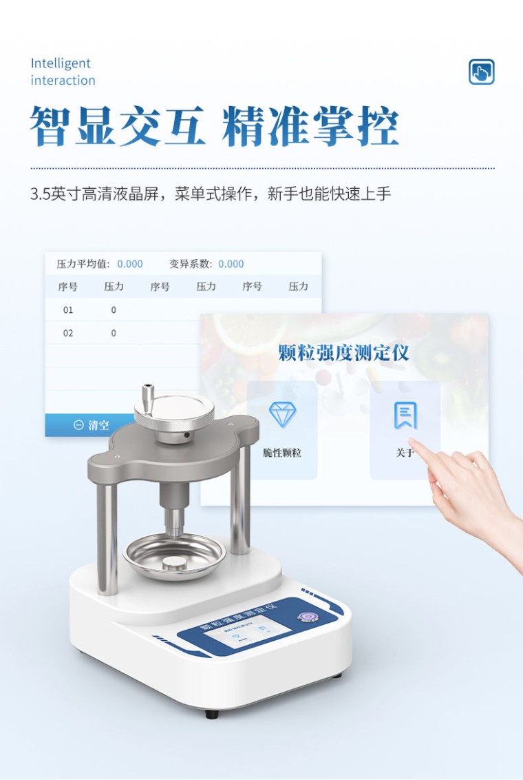 仪器简介: 颗粒强度测试仪是一种采用高精度传感器测量技术、具备数字显示功能的新型检测仪器。仪器结构紧凑、体积小巧、操作便捷,适用于圆球状、条状或圆柱状颗粒材料的抗压碎强度测试。 应用范围: 适用于化肥、药品、催化剂等样品的强度检测。 适用标准: 基于《GB/T 44750-2024 颗粒抗压强度的测量》国家标准。 检测原理: 颗粒强度检测通过施加逐渐增大的轴向压力使单个颗粒破裂,记录其破碎前承受的最大压力值作为强度指标,其中脆性颗粒在压力超临界破坏阈值时碎裂,而不同颗粒类型的抗压强度则通过分析加载过程中的力学响应特性测定。 仪器特点: 1、★配备3.5寸高清液晶屏幕,实时显示测试数据与操作界面,视觉效果清晰直观; 2、人机交互操作更准确,更便捷; 3、采用高分辨率传感技术,支持根据不同接触方式自适应获取精准压力值; 4、严格遵循**国家标准,可测试脆性的球形颗粒、条形颗粒、柱形颗粒; 5、仪器工作噪音低于行业标准。 技术参数: 测量范围:0~2000N 颗粒直径:0.2-45 mm 显示范围:0~2000 分辨率:0.01N 测定误差:<0.002%FS±0.5N 仪器精度:±0.006%FS 传感器精度:0.05% 灵敏度:2.0mv/v 测量控制周期:0.2s 环境温度:室温-50℃ 相对湿度:<85% 电源电压:AC 220V士10% 仪器功率:100W 仪器尺寸:258.3x210x288.3(mm) 仪器重量:5.6kg
