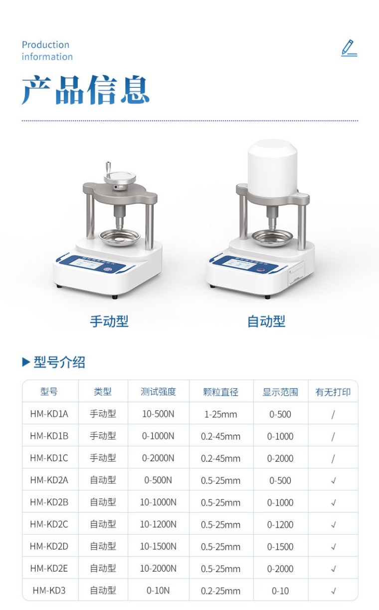 仪器简介: 颗粒强度测定仪是一种采用高精度传感器测量技术、具备数字显示功能的新型检测仪器。仪器结构紧凑、体积小巧、操作便捷,适用于圆球状、条状或圆柱状颗粒材料的抗压碎强度测试。 应用范围: 适用于化肥、药品、催化剂等样品的强度检测。 适用标准: 基于《GB/T 44750-2024 颗粒抗压强度的测量》国家标准。 检测原理: 颗粒强度检测通过施加逐渐增大的轴向压力使单个颗粒破裂,记录其破碎前承受的最大压力值作为强度指标,其中脆性颗粒在压力超临界破坏阈值时碎裂,而不同颗粒类型的抗压强度则通过分析加载过程中的力学响应特性测定。 仪器特点: 1、★配备3.5寸高清液晶屏幕,实时显示测试数据与操作界面,视觉效果清晰直观; 2、★具备开机自检与自动清零功能,采用电机驱动螺旋加压系统,并配置智能超压保护装置; 3、★配备新一代热敏打印机,支持检测结果即时打印; 4、人机交互操作更准确,更便捷; 5、采用高分辨率传感技术,支持根据不同接触方式自适应获取精准压力值; 6、严格遵循**国家标准,可测试脆性和塑性的球形颗粒、条形颗粒、柱形颗粒; 7、仪器工作噪音低于行业标准。 技术参数: 测量范围:10~500N 颗粒直径:0.5-25 mm 显示范围:0~500 分辨率:0.01N 测定误差:<0.002%FS±0.5N 仪器精度:±0.006%FS 传感器精度:0.05% 灵敏度:1.0mv/v 测量控制周期:0.2s 环境温度:室温~50℃ 相对湿度:<85% 电源电压:AC 220V士10% 仪器功率:100W 仪器尺寸:258.3x210x288.3(mm) 仪器重量:6.15kg