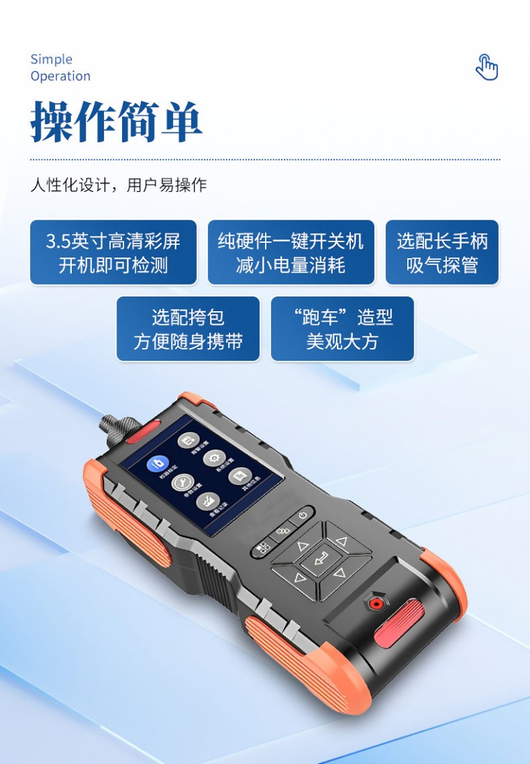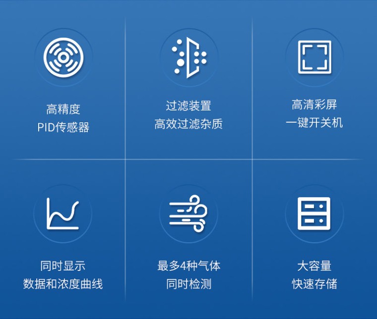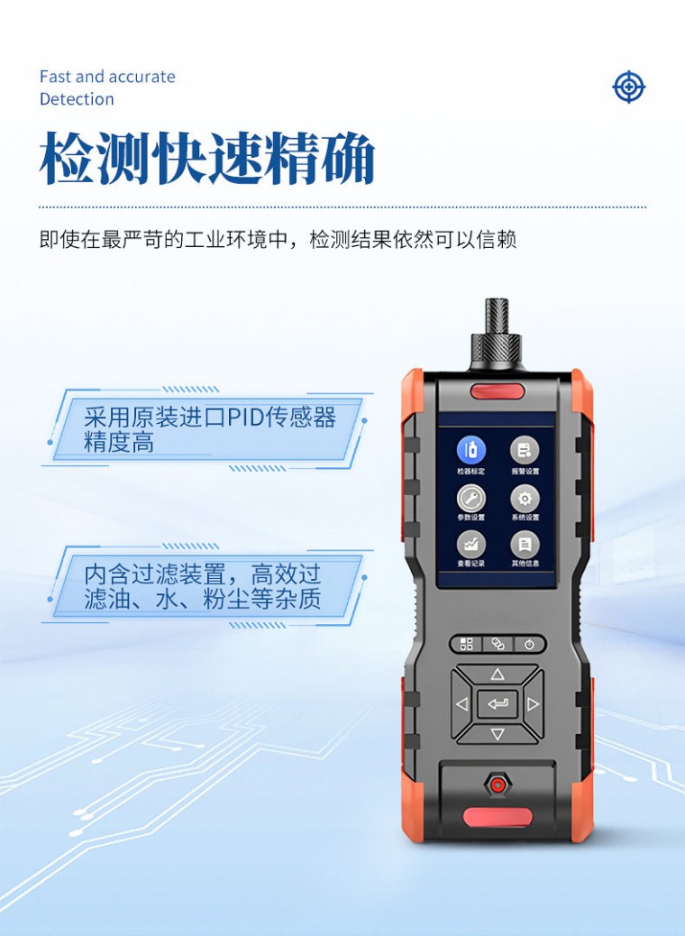 手持式VOC检测仪主要用于检测车间的VOC浓度、厂界的VOC浓度、固定污染源排放VOC浓度、安全事故应急监测、废气排放浓度达标快速检测。 产品特点: 1、快速精确 采用原装进口PID传感器,精度高 仪器内含过滤装置,高效过滤油、水、粉尘等杂质, 即使在最严苛的工业环境中,检测结果依然可以信赖 2、人性化设计,用户易操作 3.5寸高清彩屏,开机即可检测 纯硬件一键开关机, 减小电量消耗 选配长手柄吸气探管 选配挎包方便随身携带 “跑车”造型,美观大方 3、功能全面 同时显示实现数据和浓度曲线 配置高低速可调的气泵 最多可实现4种气体同时检测 可选配外置蓝牙打印机,检测数据实现移动打印 可选配蓝牙、ZIGBEE等多种无线通讯方式 支持多种气体显示单位任意切换,浓度值由系统自动换算 中英文自由切换显示 大容量快速存储功能,存储空间可以定制 Micro-USB接口充电器,方便随时充电 安卓手机通用数据线,方便连接电脑读取历史数据 可以在高温、高湿、高粉尘环境气体检测(需配采样探枪) 技术参数: