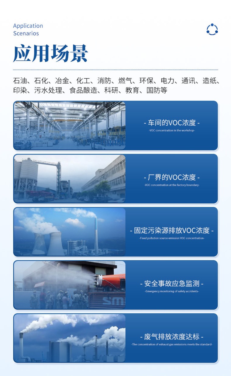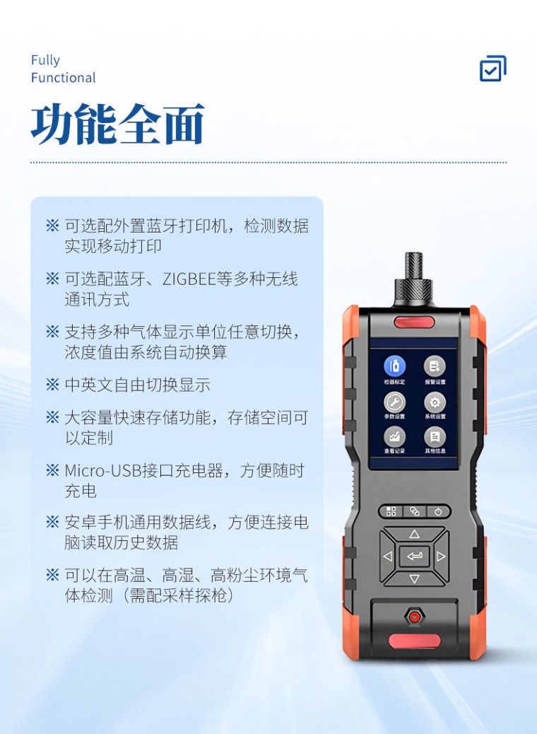应用场合: 石油、石化、冶金、化工、消防、燃气、环保、电力、通讯、造纸,印染、污水处理、食品酿造、科研、教育、国防 仪器配置: [标准配置] 检测仪主机、操作说明书、检测报告、合格证 [可选配件] 标准气、采样探管、外置蓝牙打印机等