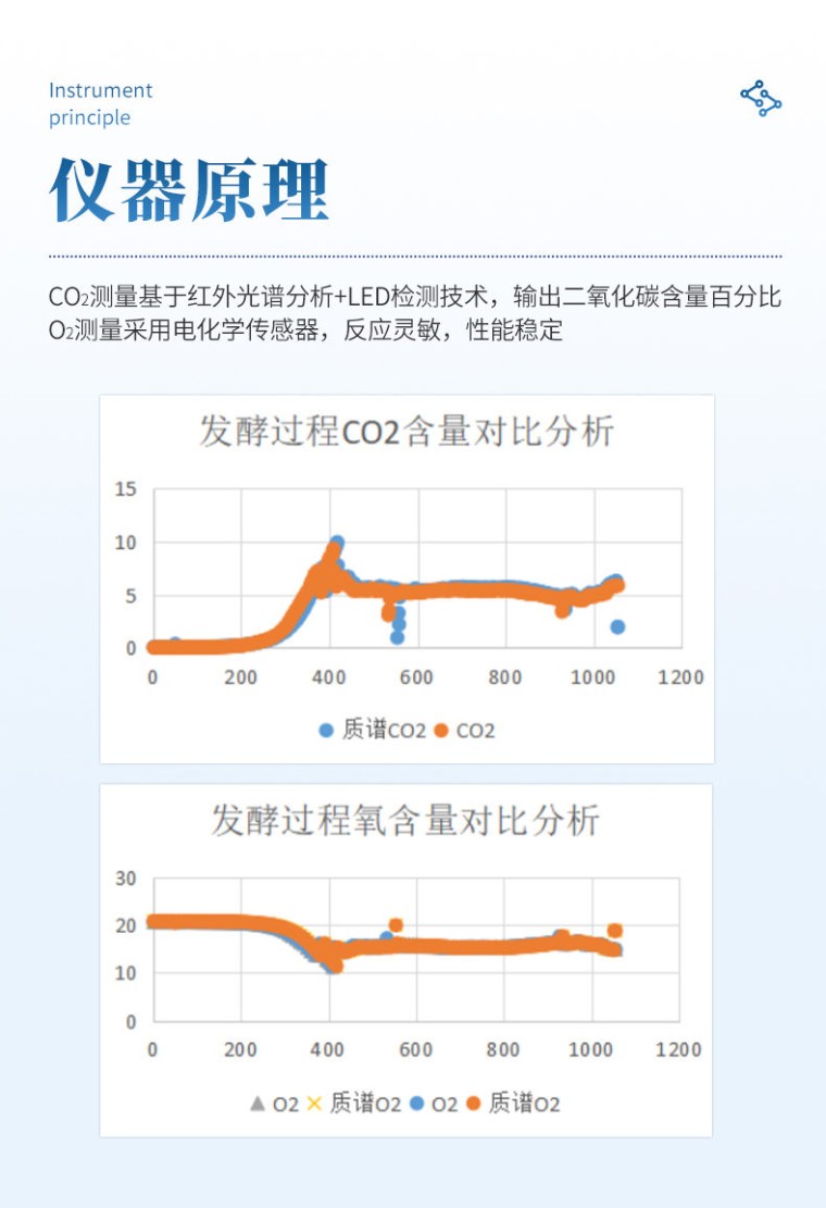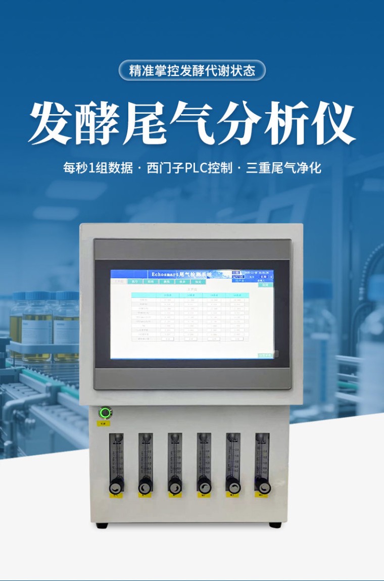 一、优势: 1、具有实时标气校准和实时空气检测的功能,使OUR、CER计算更加准确 2、检测通道独立,防止交叉干扰,且数据密度高,一秒一数据,防止错失关键变化; 3、处理器采用西门子1200 PLC,稳定可靠,对外提供标准信号源,与生物反应器易兼容; 4、系统自动计算OUR,CER和RQ的功能,直接输出有价值的生理参数。 5、对尾气进行3道干燥和净化处理:**道使用SMC水分离系统完成水气分离,**道采用SMC进口高分子材料进行尾气干燥处理,第三道采用0.2um过滤器进行净化处理; 6、设备结构紧凑,空间利用率高。 二、设备性能: 原理:CO2 测量基于红外光谱分析+LED检测技术,输出二氧化碳含量百分比。 O2测量采用电化学传感器,反应灵敏,性能稳定。
