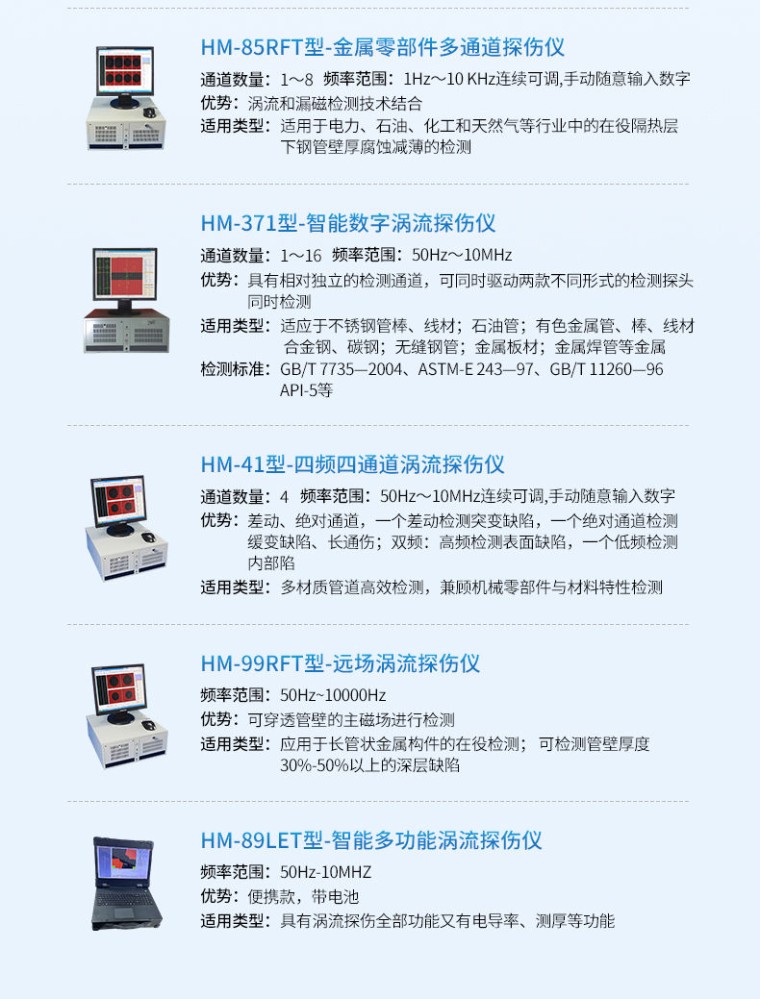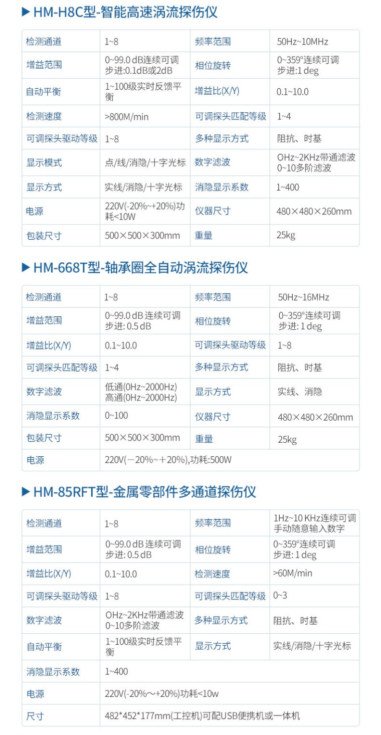 产品详情: 85RFT 采用涡流和漏磁检测技术的有机结合,利用高速DSP和小波处理方法,有效地放大微弱的信号。保证仪器检测精度和准确性。适用于不同材料的金属检测应用,且拥有中文/英文操作界面,操作直观简便. 85RFT 结合了脉冲涡流和多频涡流的综合效果,突破了传统检测方式的局限,能有效地检测低碳钢管壁厚腐蚀程度,具有极强的穿透能力。特别适用于电力、石油、化工和天然气等行业中的在役隔热层下钢管壁厚腐蚀减薄的检测。 仪器参数: 1、检测通道:1-8 2、频率范围:1Hz~10 KHz连续可调,手动随意输入数字 3、增益范围:0~99.0 dB连续可调,步进:0.5dB 4、相位旋转:0~359°连续可调,步进:1 deg 5、增益比:(X/Y)0.1~10.0 6、检测速度:>60M/min 7、可调探头驱动等级:1~8 8、可调探头匹配等级:0~3 9、非等幅、非对称相位报警区域设定 10、多中显示方式:阻抗、时基 11、数字滤波:OHz~2KHz带通滤波,0~10多阶滤波 12、延时、实时硬件输出报警,支持串口、并口、USB输出控制 13、尺寸:482*452*177mm(工控机)可配USB便携机或一体机 14、自动平衡:1~100级实时反馈平衡 15、可涡流信号回放扩展功能,测量缺陷的幅值、相位、数字值 16、具有端头、端尾信号切除功能(可扩多段信号控制) 17、大量存储各种检测程序和检测数据 18、多达8路报警信号输出,多为安全开关信号 19、自动记录显示缺陷数及其位置 20、自动形成检测报告(包括检测数量、合格数和不合格数) 21、显示方式:实线、消隐、十字光标 22、消隐显示系数:1~400 23、中英文操作语言、在线帮助 24、直角坐标系与极坐标系背景选择 25、自动日历、时间显示 26、电源:220V(-20%~+20%)功耗<10w<> 27、声光报警输出、PLC控制输出 28、具有延时、定长打标,精度0.01S/1MM 29、内、外时钟选择