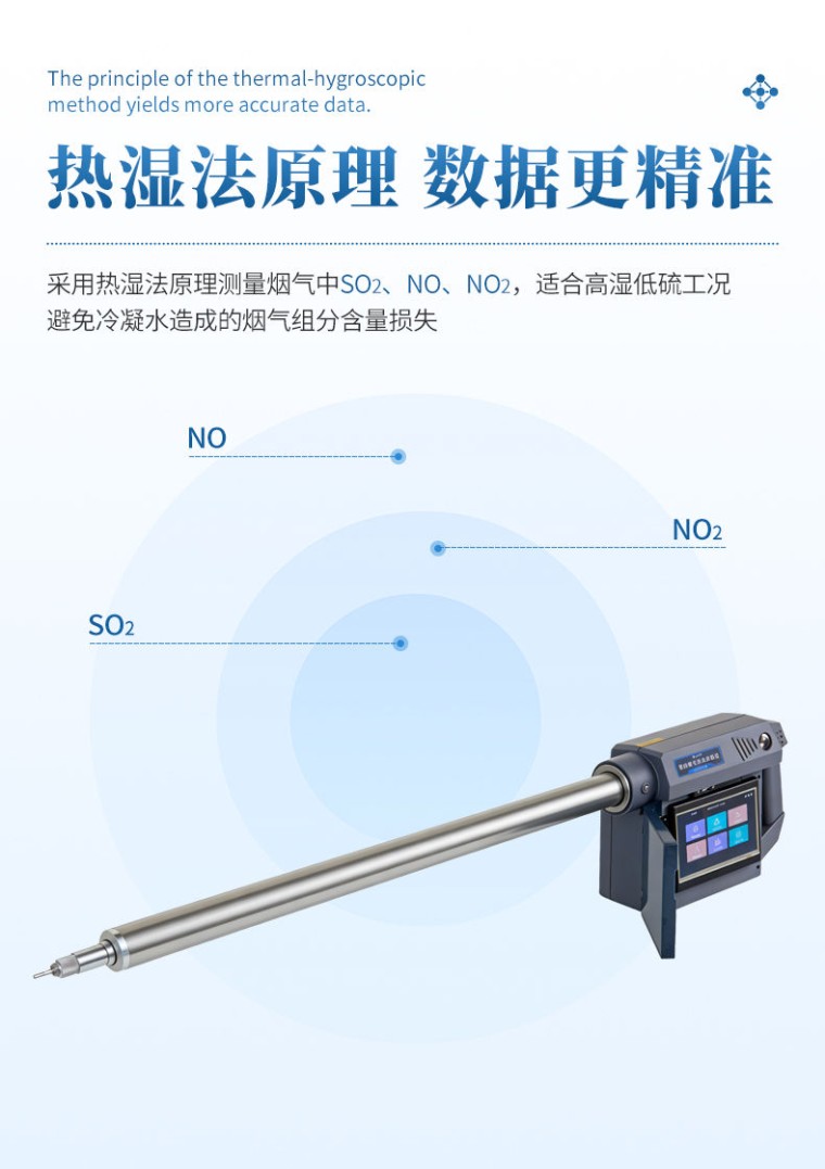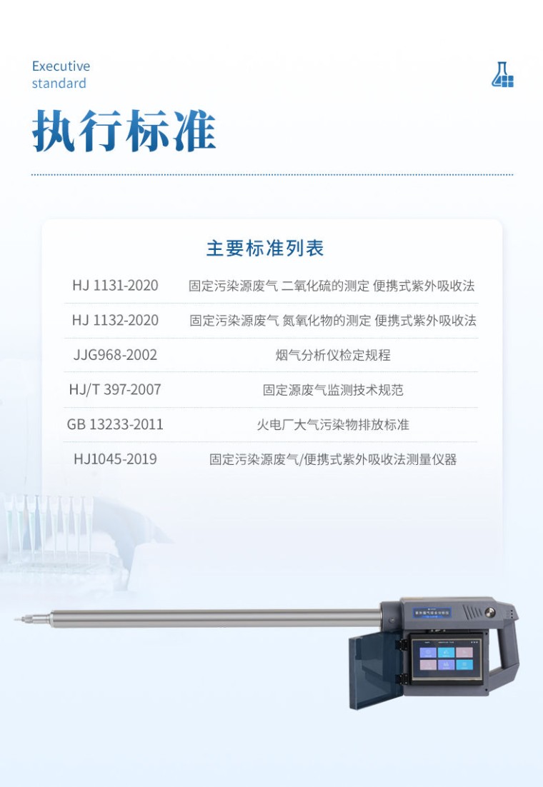 一、产品介绍 1204型紫外烟气综合分析仪采用紫外差分吸收光谱技术测量烟气中SO2、NO、NO2和NH3,可选O2、CO、H2S、CO2传感器测量气体的浓度,紫外差分吸收光谱技术受水分干扰比较小,数据稳定性好,精度高,特别适合高湿低硫工况。整机采用一体化设计,方便携带。广泛应用于环保、卫生、劳动、安监、军事、科研、教育等部门常规空气监测或应急监测。 二、执行标准 HJ 1131-2020 固定污染源废气 二氧化硫的测定 便携式紫外吸收法 HJ 1132-2020 固定污染源废气 氮氧化物的测定 便携式紫外吸收法 JJG968-2002 烟气分析仪检定规程 HJ/T 397-2007 固定源废气监测技术规范 GB 13233-2011 火电厂大气污染物排放标准 HJ1045-2019 固定污染源废气(二氧化硫和氮氧化物) 便携式紫外吸收法测量仪器技术要求及检测方法 三、产品特点 1、 采用热湿法原理测量烟气中SO2、NO、NO2,适合高湿低硫工况,避免泠凝水造成的烟气组分含量损失; 2、 内置湿量测量模块,外置动静压接口、烟温接口,可同步测量烟温、流速和含湿量; 3、 采用双量程分析设计,能根据SO2浓度自动切换高低量程; 4、 加热速度快,预热时间短,快速满足现场测量要求; 5、 选用采用钛合金材质真空隔热管,保温效果好; 6、 配有高温延长管,满足不同工况条件下使用; 7、 内置锂电池,可实现数据查询、U盘导出,蓝牙打印功能; 8、 内置蓝牙模块和U盘接口,实现数据蓝牙打印功能和数据导出功能; 四、技术参数