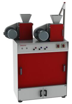 产品说明 : PLM-S 大型实验磨粉机 大型实验磨粉机是一种性能优良的轧辊式磨粉机,用于制备谷物品质分析用的粉样,除了与小型实验磨粉机一样,能用于小麦、黑麦等谷物的粉质拉伸试验等测试外,还能预测出粉率。大型实验磨粉机由皮磨和心磨两套磨组成,每套磨各由于4个磨辊构成,共形成了6道连续研磨工序。由于皮磨和心磨相分离,除了能完成皮磨和心磨自动连续研磨的常规研磨工序外,还能实现皮磨或心磨重复多次研磨等复杂的研磨工序,满足特殊制粉的需求。 >技术优势 *心套轧距调节机构,各对磨辊间隙均可调整,延长磨辊使用周期,确保研磨效果长期稳定一致 *辊经硬化、抛光,高效研磨,重复性好 *网自动清理,操作简单方便 *选用清麸机将附着在麸皮上的少量面粉颗粒进一步分离出来,使粉样完全等同车间实际生产的面粉 *同时得到四种产品: - 皮磨粉- 心磨粉- 次粉- 麸皮 技术参数